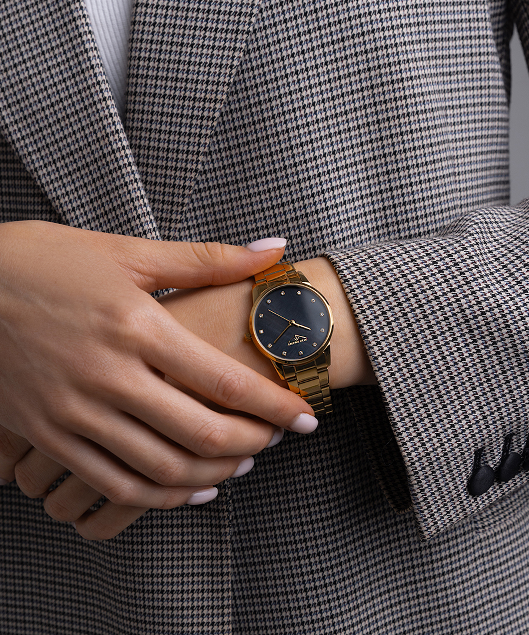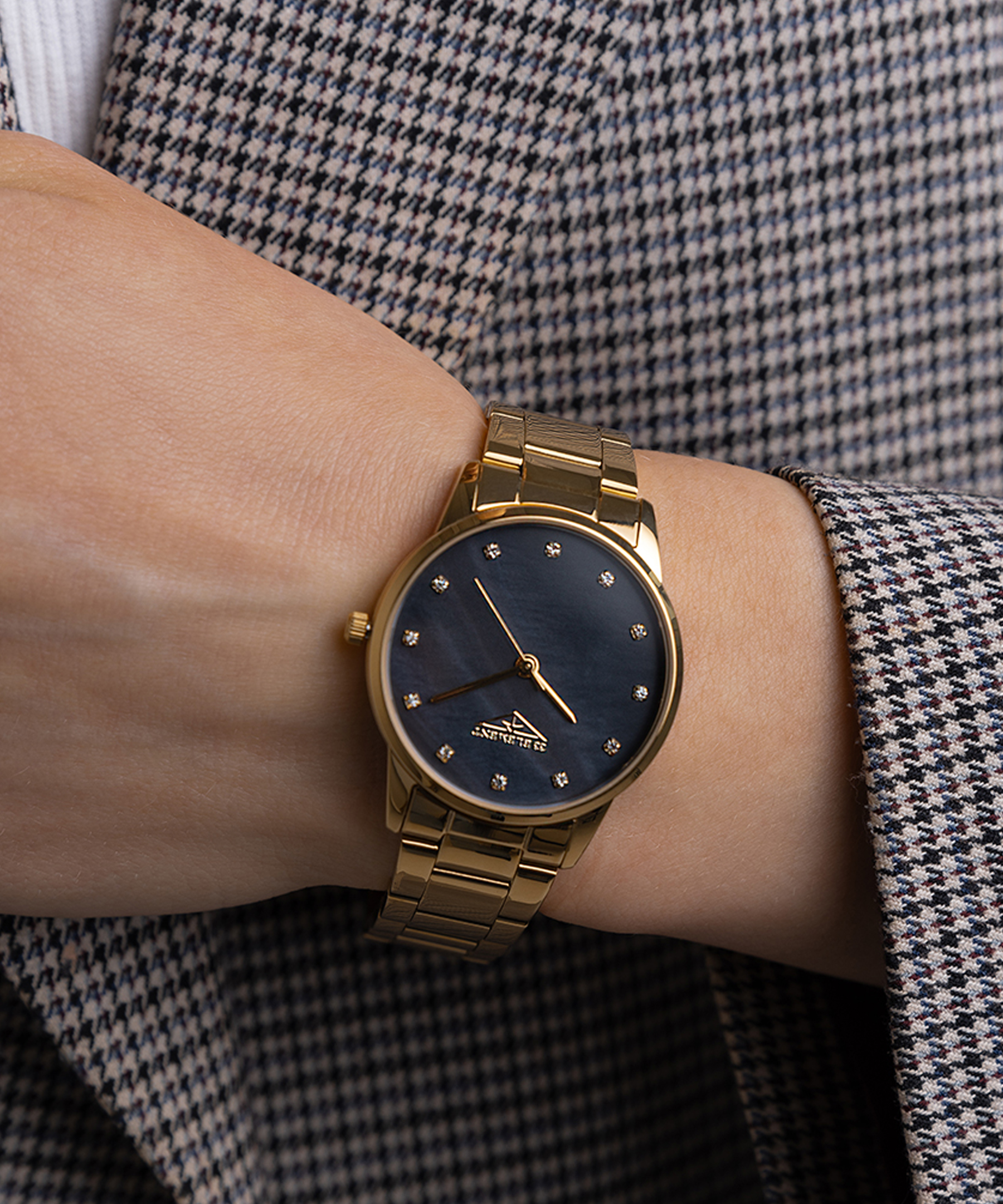 Утонченность добавляет темно-синий аналоговый циферблат, украшенный кристаллами вместо индексов, играющих роль меток времени. Циферблат защищен минеральным стеклом с сапфировым покрытием, которое отличается высокой стойкостью к царапинам. Водозащита 3 ATM защищает часы от брызг и влаги в повседневной жизни.