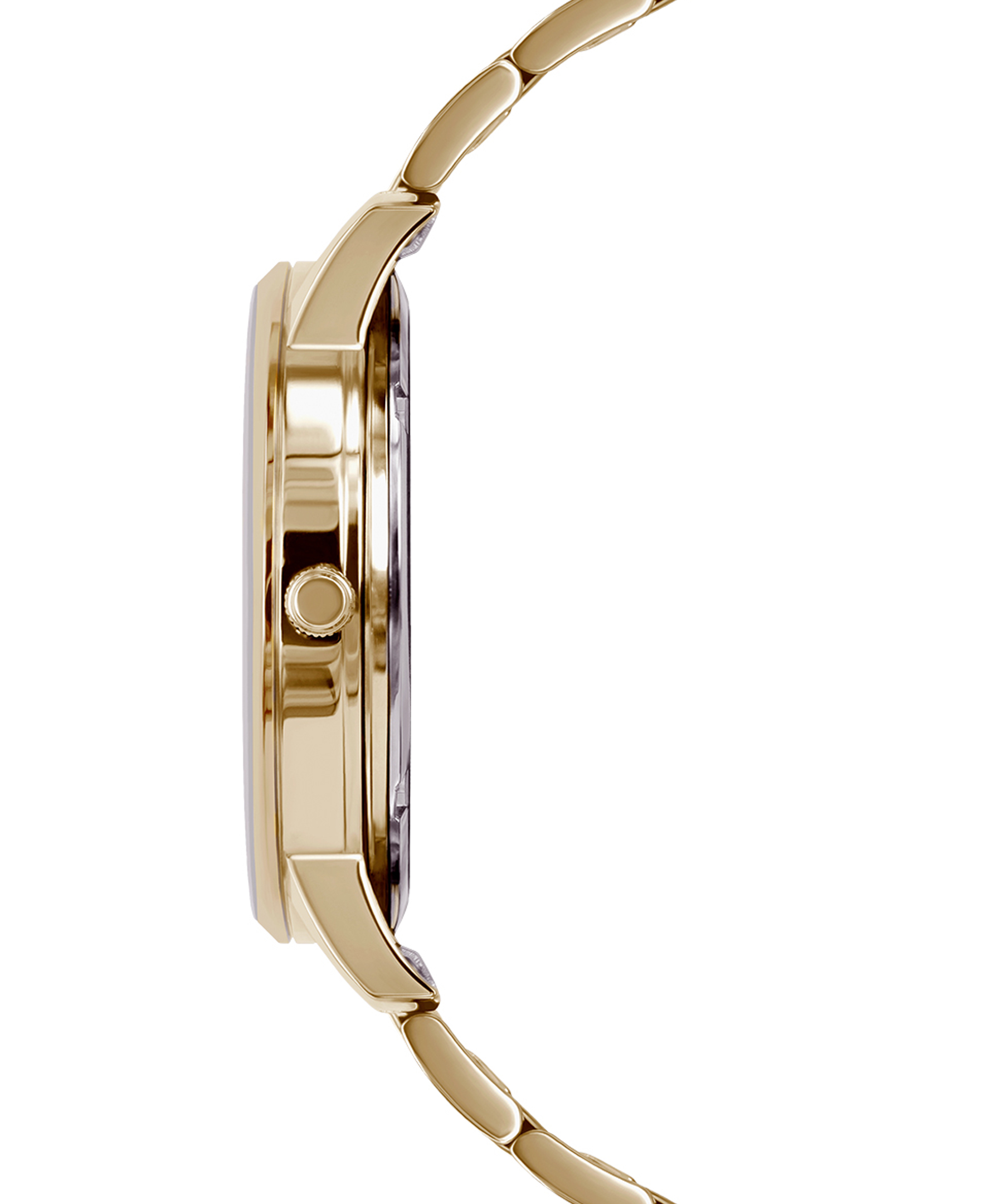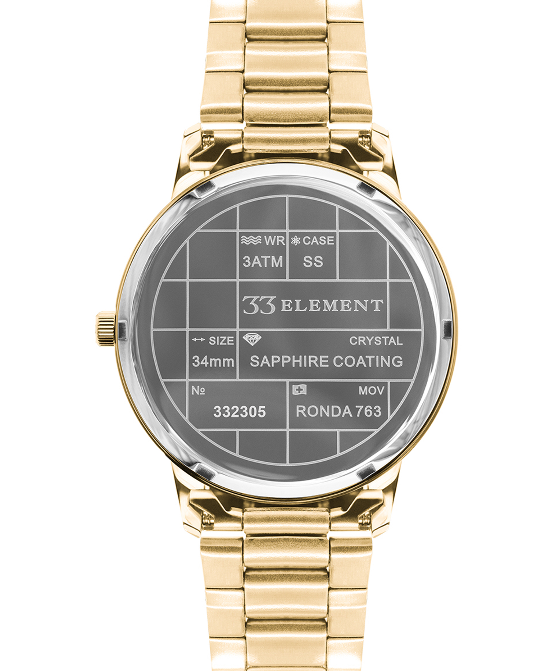 Корпус и браслет изготовлены из нержавеющей стали и покрыты роскошным покрытием Gold Tone, что придает часам изысканный блеск. Диаметр корпуса – 34 мм, идеально подходит для изящного женского запястья. Складная клипса обеспечивает комфортный и надежный крепеж.