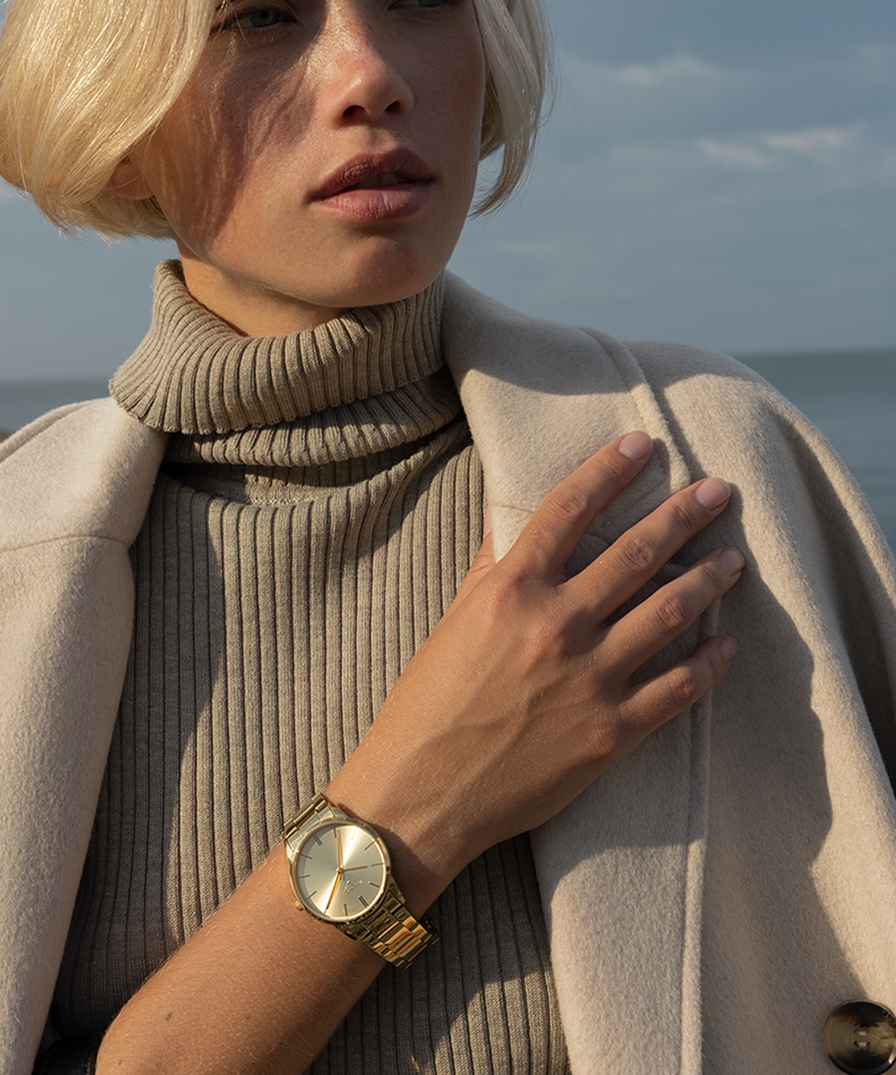 Золотистый циферблат с изящными позолоченными стрелками и индексами создает нежный акцент.