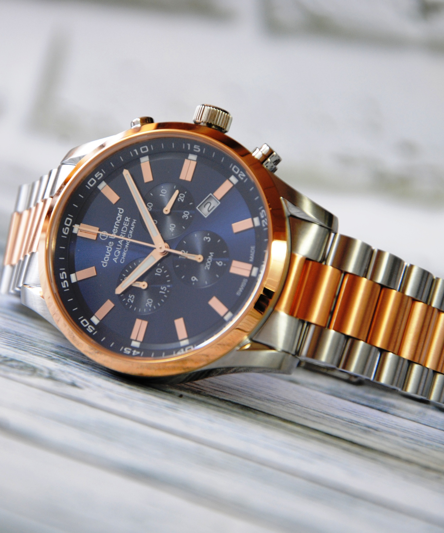 Дизайнерские мужские часы - хронограф CLAUDE BERNARD оснащены надежным швейцарским кварцевым механизмом, выполнены из стали высокого качества с частичным PVD напылением Rose Gold. Аксессуар воплотил смелые дизайнерские идеи, проявившиеся в смелом сочетании синего циферблата, золотисто-розового и серебристого металлов, мини циферблатов, стрелки которых светятся ночью, благодаря своему светонакопительному свойству.Высокий уровень водозащиты в 20 атм позволяет плавать в часах. Прочное минеральное стекло защищает механизм от повреждений. Оригинальная модель эстетически привлекательна и функциональна, рекомендуется успешным, ценящим время и стиль мужчинам.