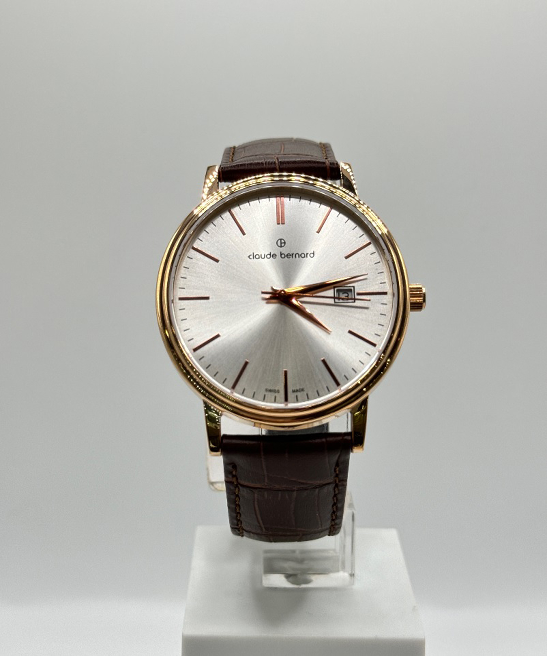 Классические мужские наручные часы Claude Bernard из коллекции Classic с высокоточным швейцарским кварцевым механизмом. Корпус изготовлен из нержавеющей стали с PVD покрытием Rose gold. На белом серебристом циферблате элегантные золотистые метки времени в виде тонких штрихов, которые сочетаются со стрелками и создают строгий, лаконичный образ. Индикатор даты на уровне “3 часов”, сапфировое стекло, обладающее высокой прочностью и прозрачностью, лаконичность и элегантная сдержанность - приоритетные характеристики данной модели. Завершает образ ремешок из натуральной кожи благородного коричневого цвета. Предложенный аксессуар рекомендуется успешным мужчинам с тонким вкусом.