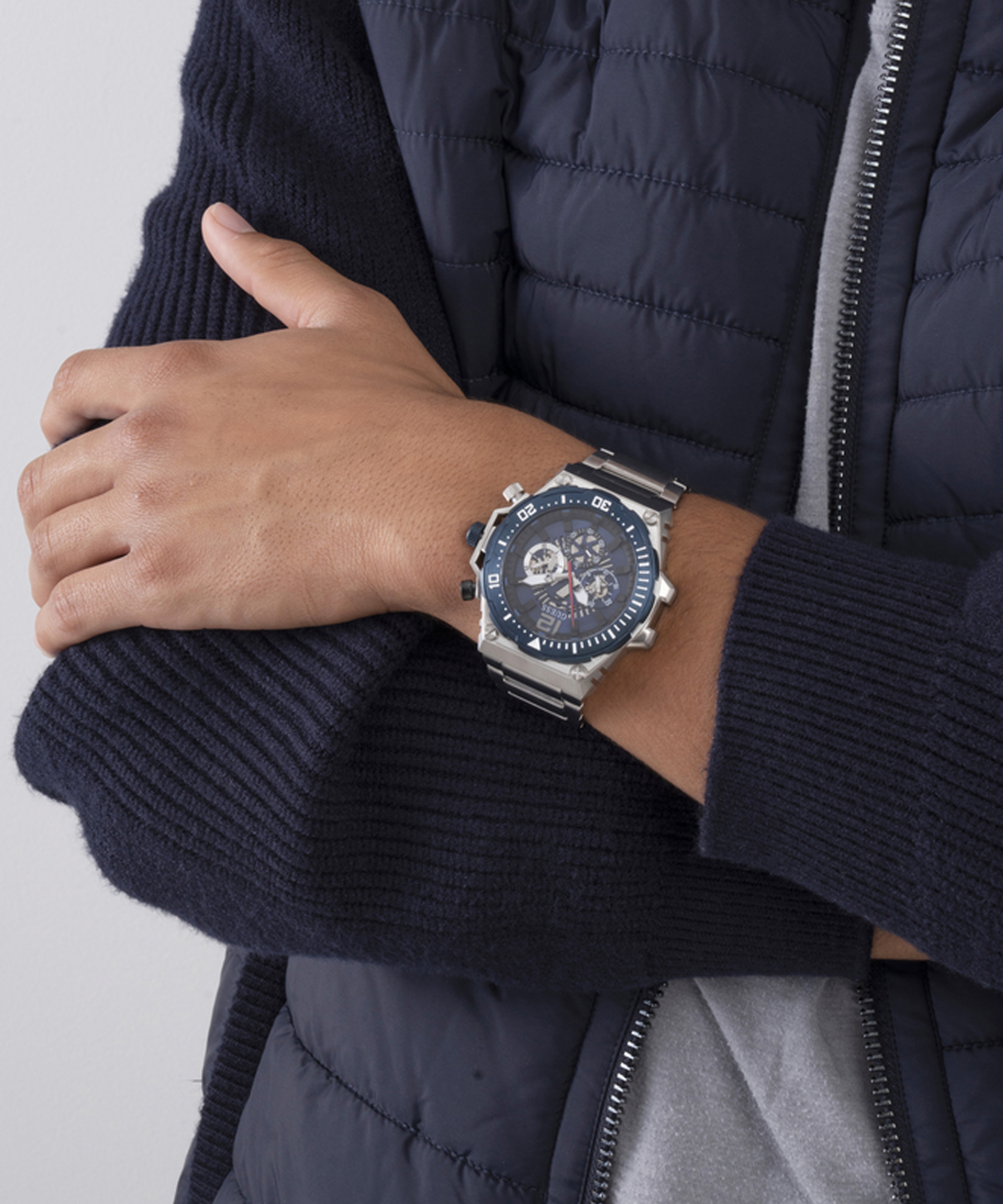 Стильные мужские часы известного американского бренда GUESS из коллекции Mens Sport изготовлены из высококачественной стали с покрытием Silver Tone. В сердце часов бьется японский кварцевый механизм Miyota, давно заслуживший мировое признание. Особенный дизайн синего циферблата, декорированного под скелетон, люминесцентное покрытие стрелок, заклепки и выразительной формы разноцветные кнопки управления механизмом придают часам смелый, авангардный вид. Многофункциональность механизма обеспечивает индикацию числа, дня недели и времени в 24 часовом формате. Металлический браслет очень гармонично сочетается с корпусом, создавая респектабельный образ дорогого аксессуара. Прочное минеральное стекло надежно защищает механизм от повреждений. Высокое качество и комфорт статусной модели создадут Вам прекрасное настроение и добавят к Вашему образу эпатажный стиль и спортивную эстетику.