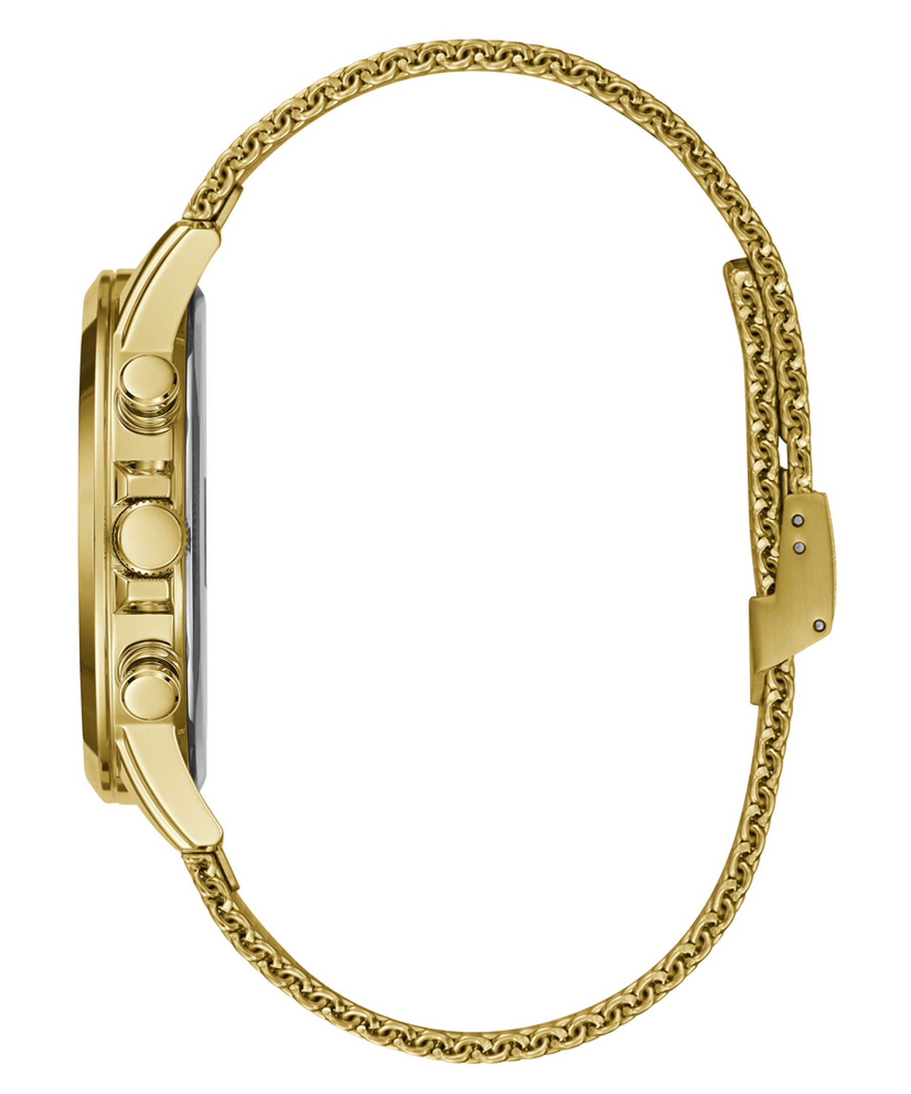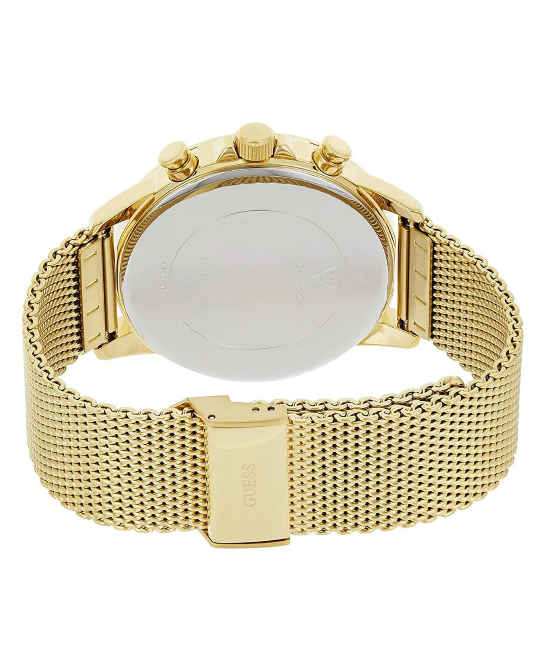 Мужские наручные часы - хронограф популярного американского бренда GUESS в стиле MENS DRESS оснащены японским кварцевым механизмом Miyota. Корпус изготовлен из стали 316L с прочным PVD покрытием Gold.Сочетание многофункциональности механизма и элегантности внешнего вида создали универсальный элитный аксессуар, который всегда будет подчеркивать Ваш изысканный вкус. Прочное минеральной стекло устойчиво к царапинам, обладает антибликовым свойством. Золотистый браслет в технике миланского плетения комфортно и надежно фиксирует часы на запястье.