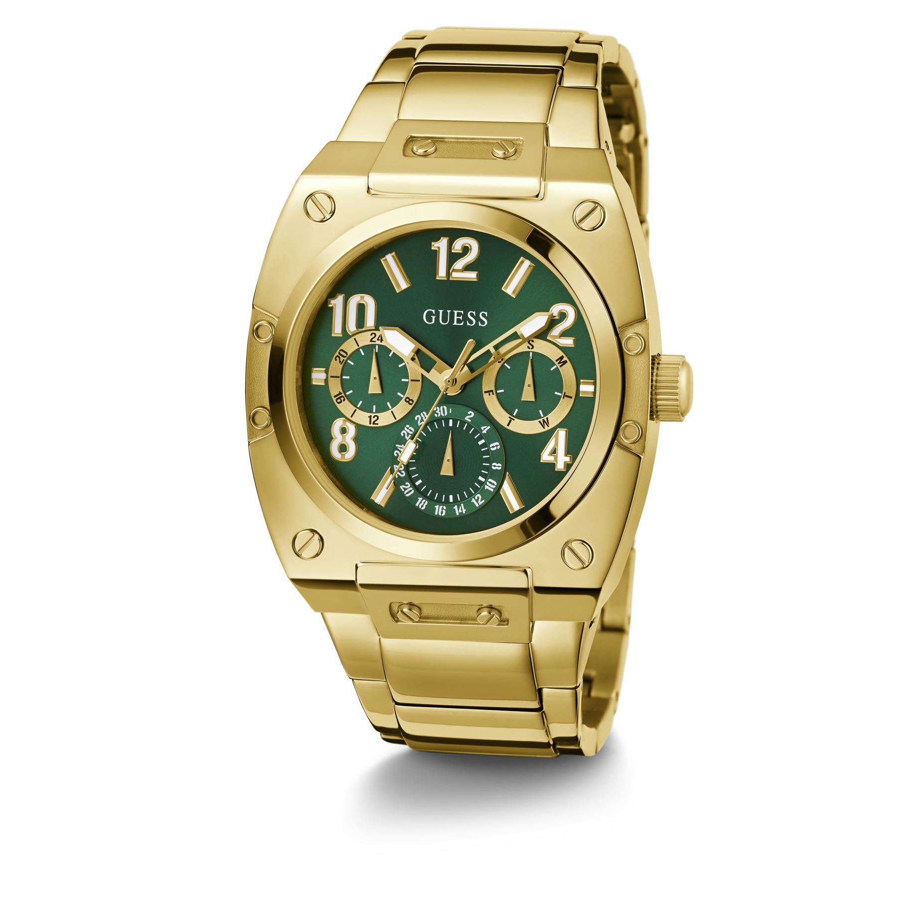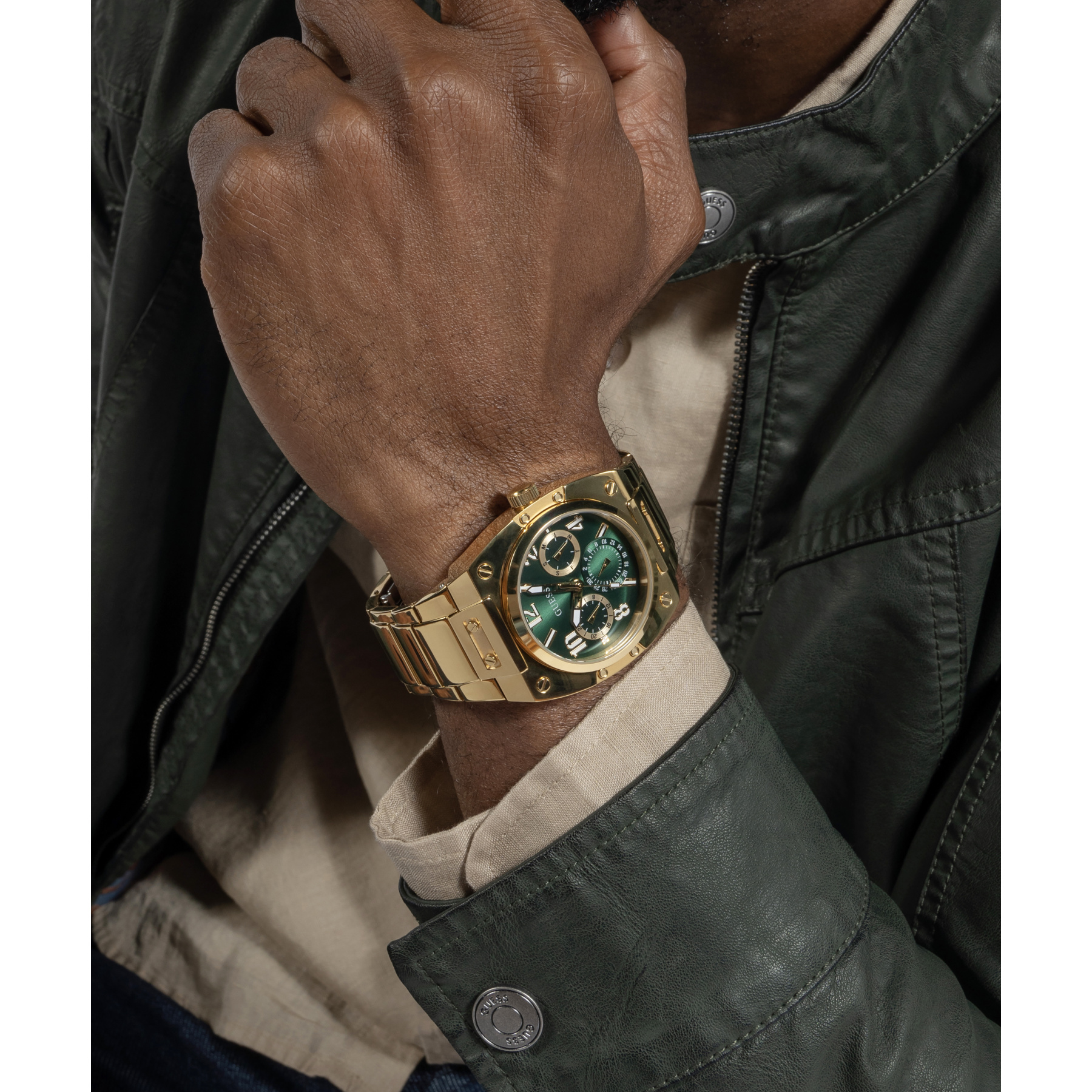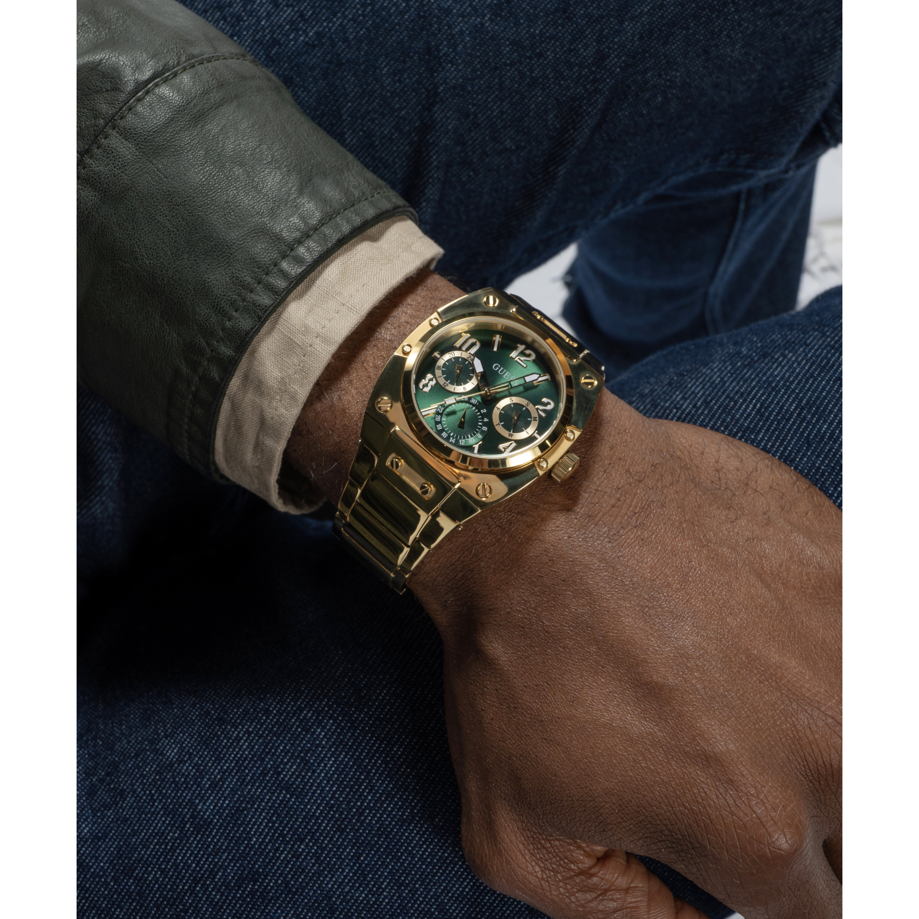 Классические мужские часы GUESS GW0624G2 из коллекции MENS TREND. В часах установлен надежный кварцевый механизм Miyota. Стальные с покрытием Gold Tone корпус и браслет. Диаметр корпуса - 43 мм, толщина - 12,35 мм. Застежка - складная клипса. Безель украшен декоративными болтами. Циферблат благородного зеленого цвета. Стрелки с люминесцентным покрытием. Водозащита - 5 АТМ.-