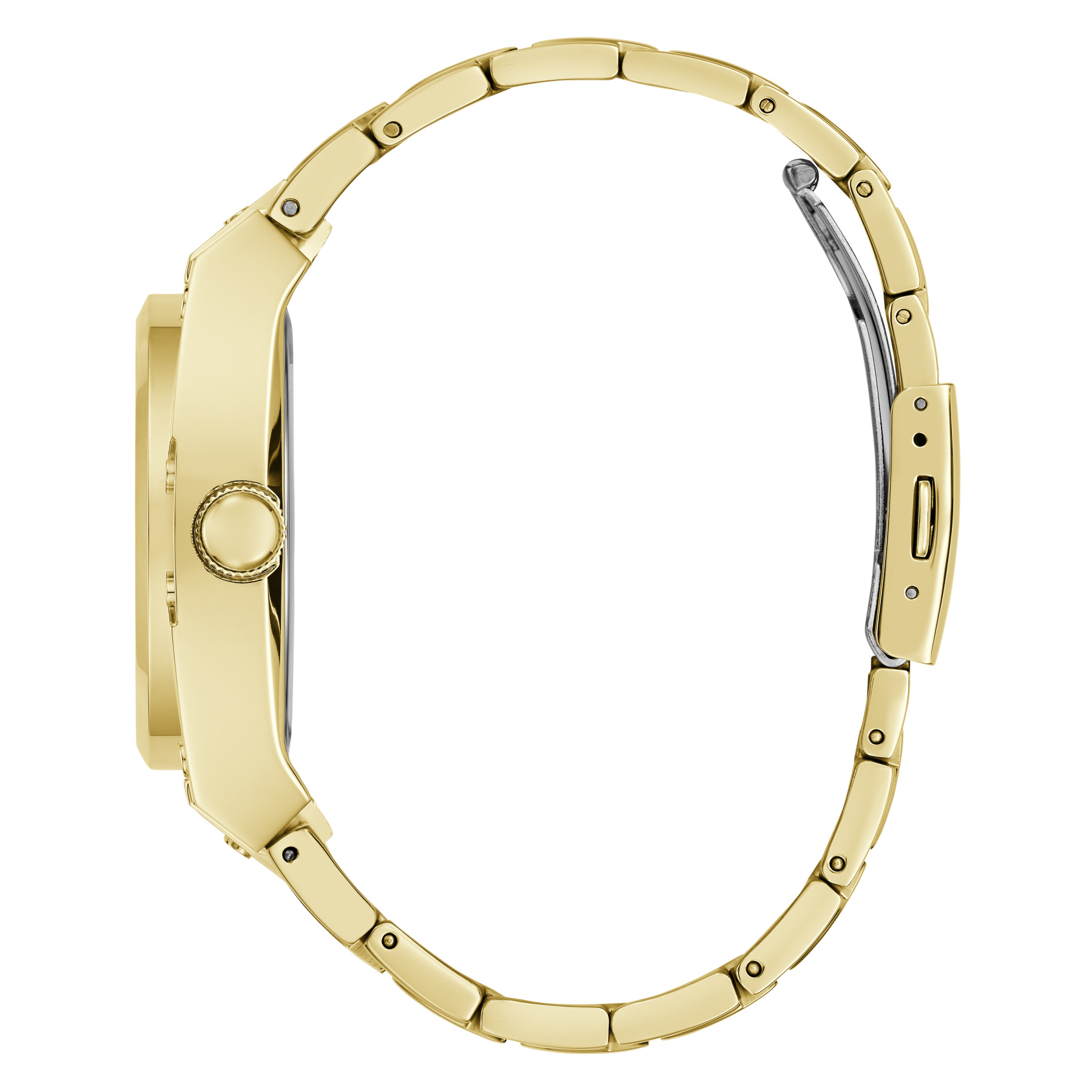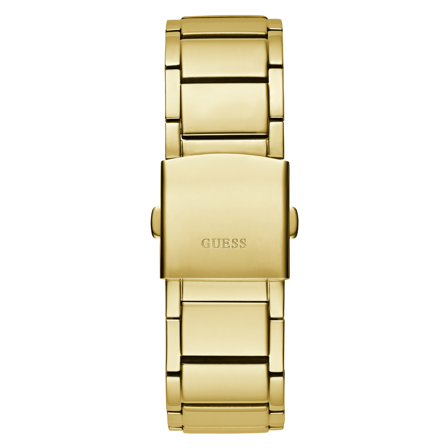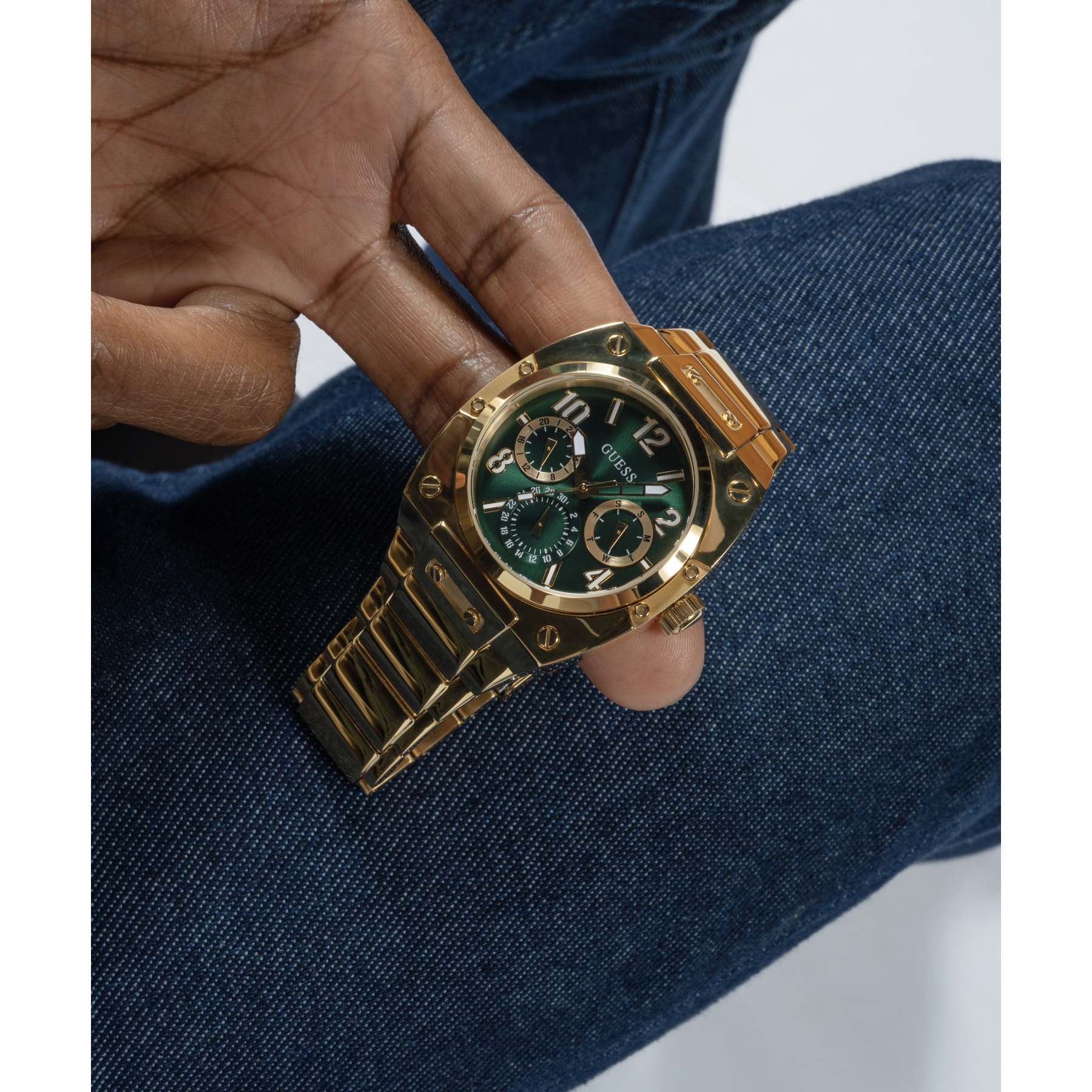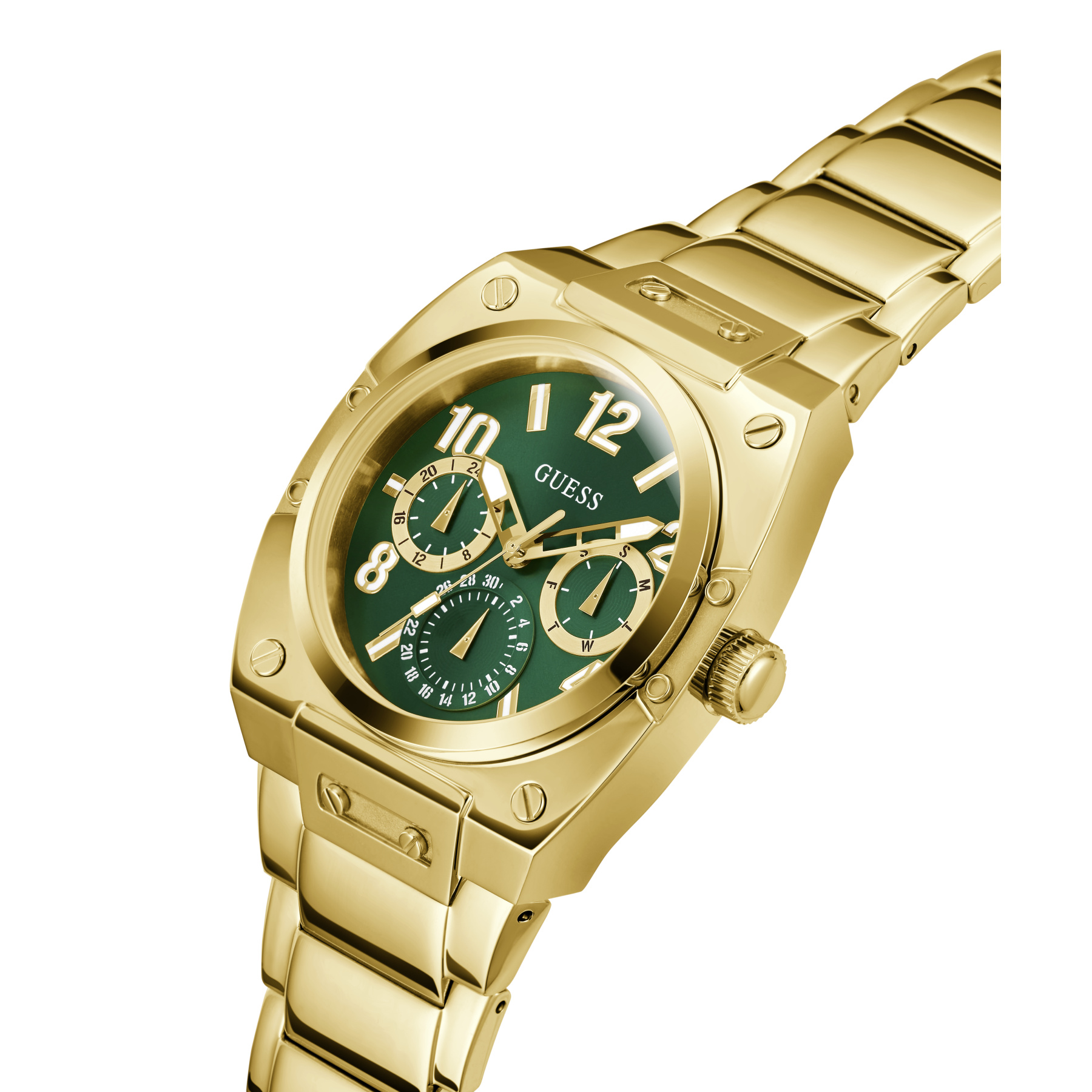 Классические мужские часы GUESS GW0624G2 из коллекции MENS TREND. В часах установлен надежный кварцевый механизм Miyota. Стальные с покрытием Gold Tone корпус и браслет. Диаметр корпуса - 43 мм, толщина - 12,35 мм. Застежка - складная клипса. Безель украшен декоративными болтами. Циферблат благородного зеленого цвета. Стрелки с люминесцентным покрытием. Водозащита - 5 АТМ.-