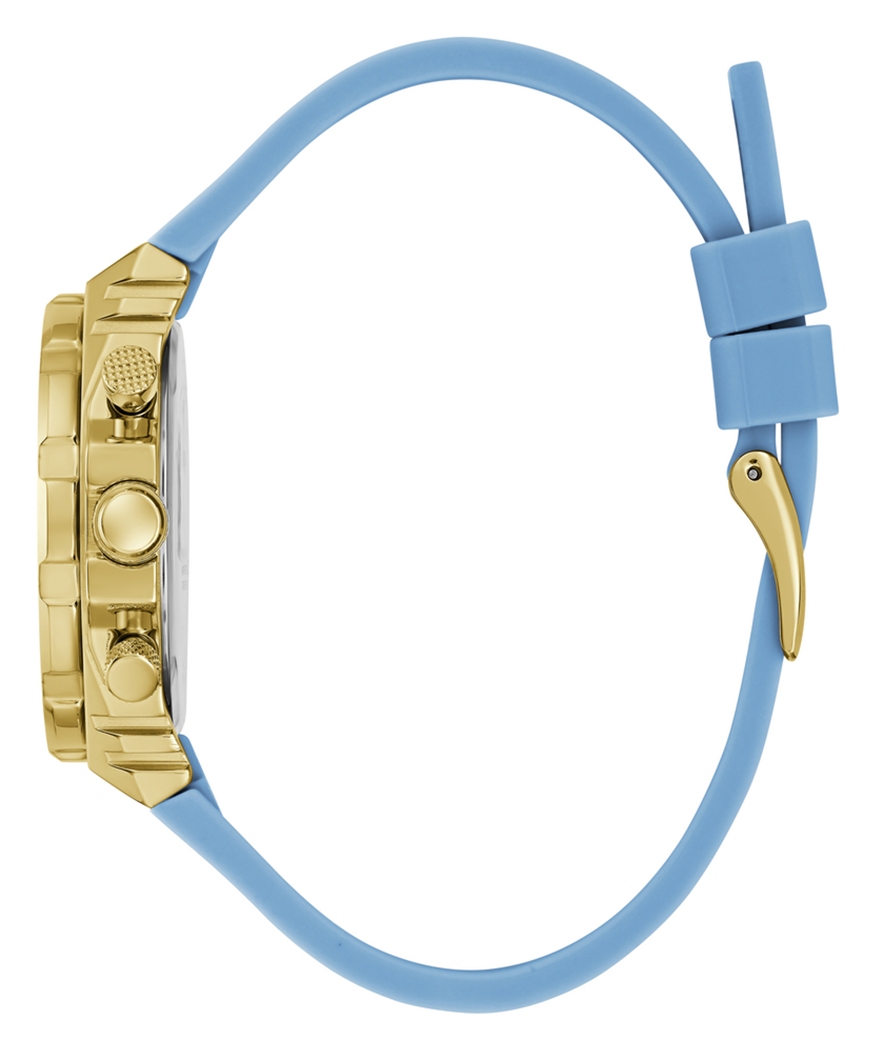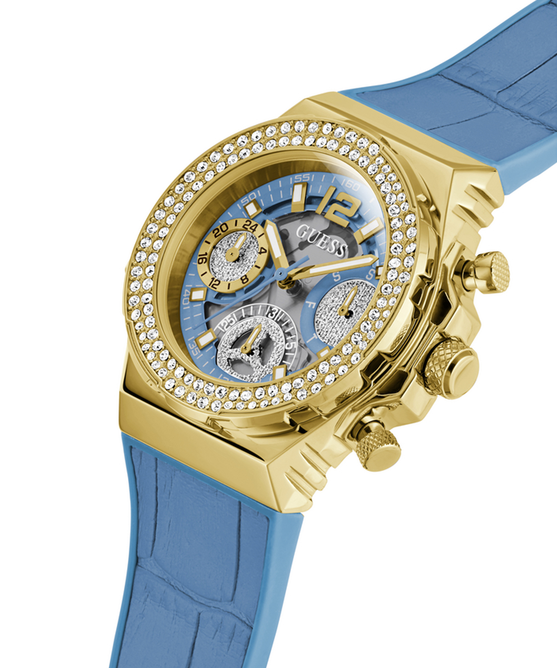 Оригинальные женские часы GUESS GW0553L3. Коллекция - LADIES SPORT. Стальной корпус Gold Tone. Диаметр корпуса - 36 мм, толщина - 10,75 мм. Голубой кожаный ремешок с классической застежкой пряжкой. Ширина крепления - 23 мм. Безель аксессуара украшен кристаллами. Стрелки и временные метки с люминесцентным покрытием. Водозащита - 5 АТМ.