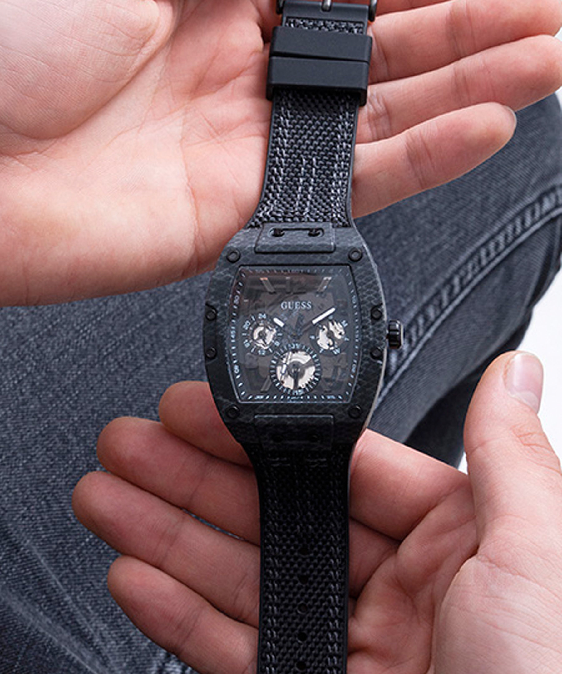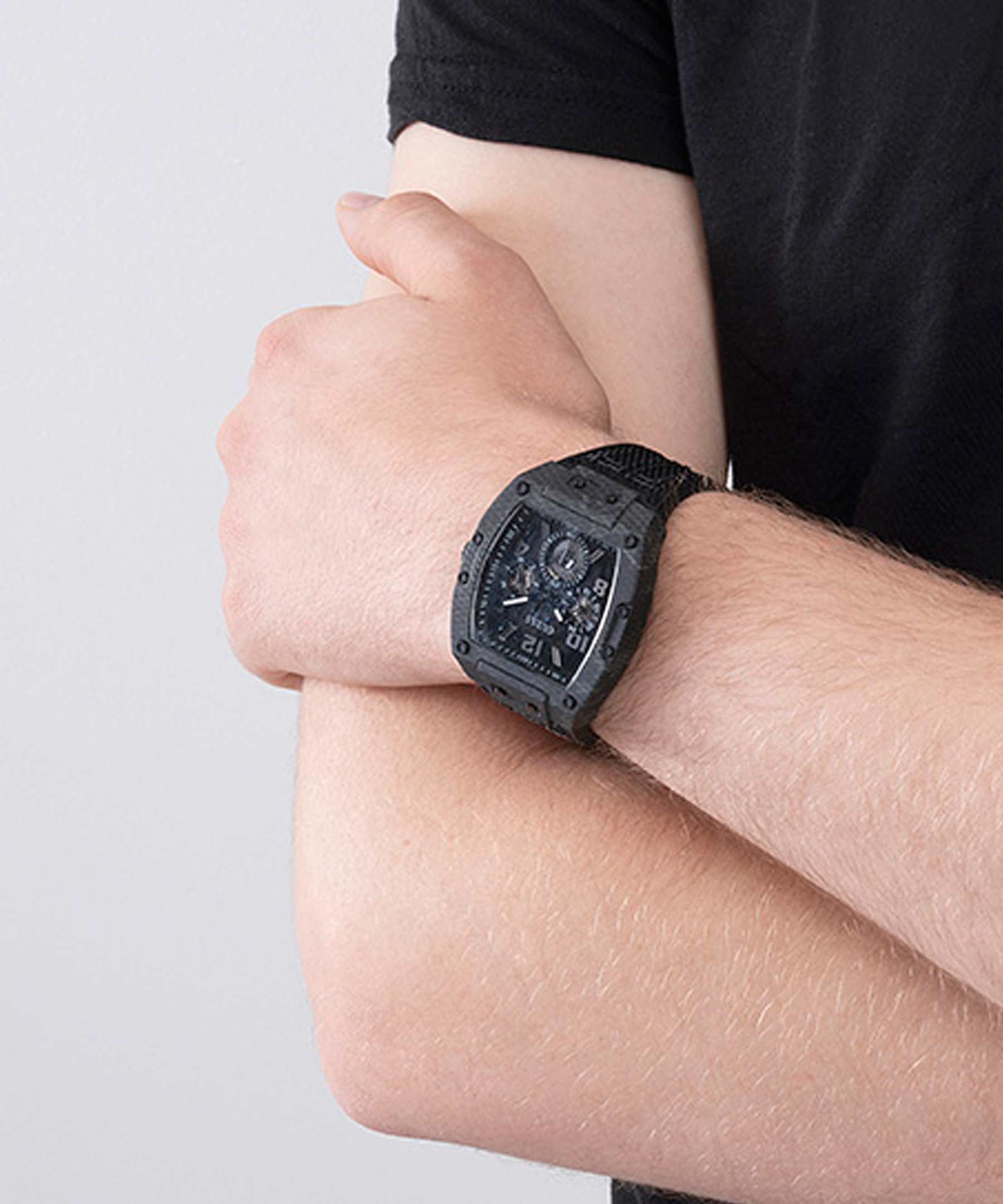 Оригинальные мужские часы известного бренда GUESS в спортивном стиле. Часы оснащены надежным кварцевым механизмом Miyota. Стальной корпус с текстурным покрытием черного цвета. Размер корпуса - 43 х 41,5 мм, толщина - 10,45 мм. Черный текстильный ремешок. Ширина крепления - 27 мм. Водозащита 5 АТМ.