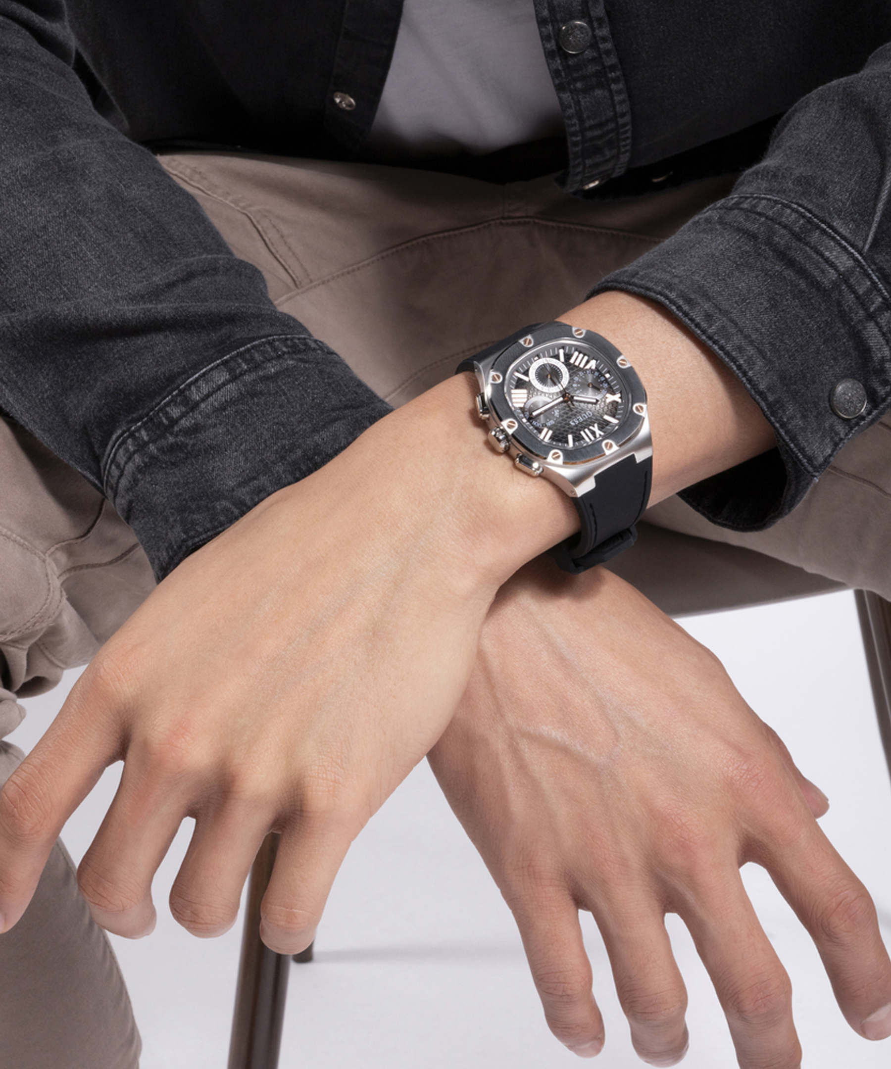 Оригинальные мужские наручные часы GUESS GW0571G1 оснащены кварцевым механизмом Miyota. Коллекция MENS DRESS. Стальной с покрытием Silver Tone корпус. Силиконовый браслет. Диаметр корпуса - 42 мм, толщина - 10,1 мм. Ширина крепления - 25 мм. Застежка - пряжка. Черный градиентный циферблат со стрелками с люминесцентным покрытием и дополнительными мини циферблатами. Водозащита - 5 АТМ.-