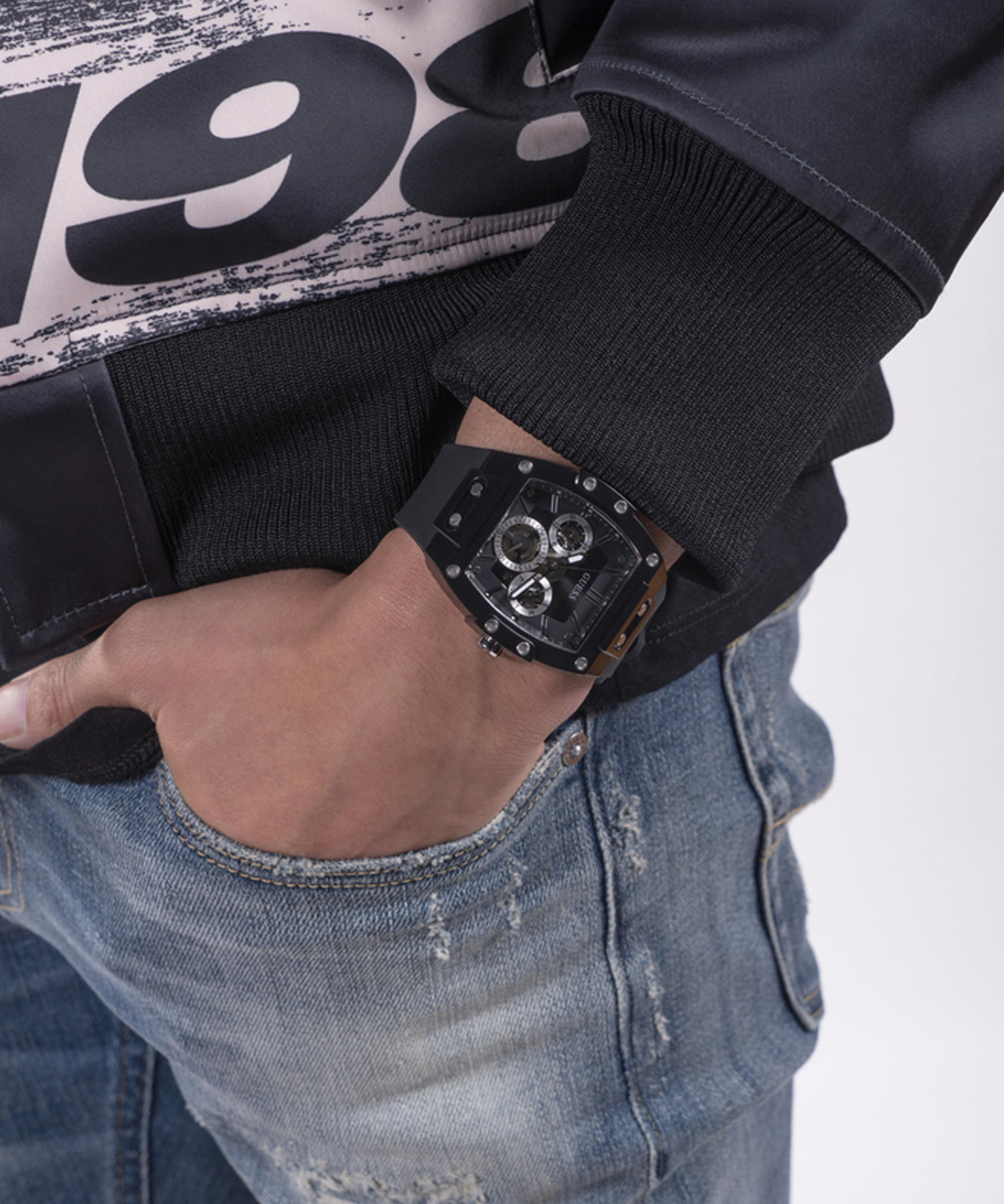 Стильний багатофункціональний годинник Guess з колекції - MENS TREND з якісним японським механізмом Miyota виготовлений з полікарбонату чорного кольору. На чорному циферблаті розміщені індикатори дати, дня тижня та часу в 24 годинному форматі. На безелі годинника ефектно виглядають декоративні заклепки, які поєднуються з мітками часу і міні циферблатами. Розмір корпусу – 43 х 45 мм. Силіконовий ремінець продовжує дзайнерську авангардну тему, стрілки та мітки з люмінесцентним покриттям світяться вночі, створюючи додатковий комфорт та зовнішню привабливість аксесуара.