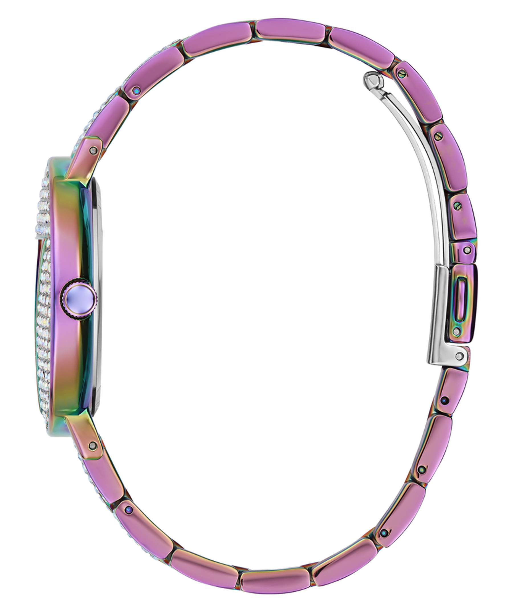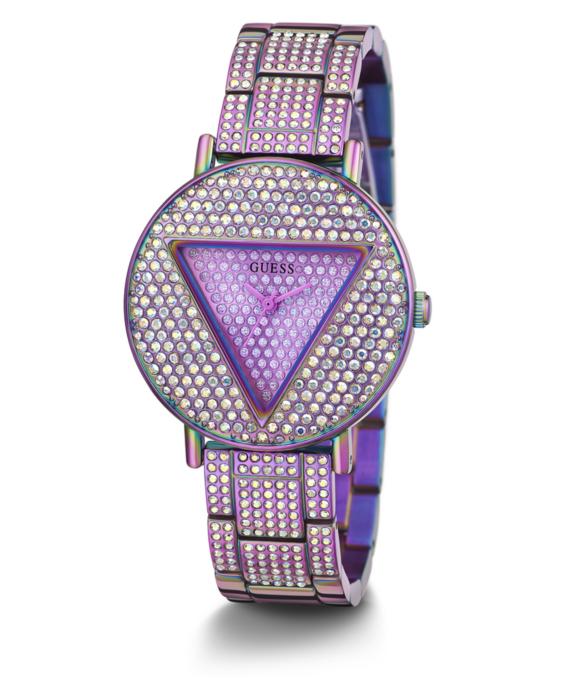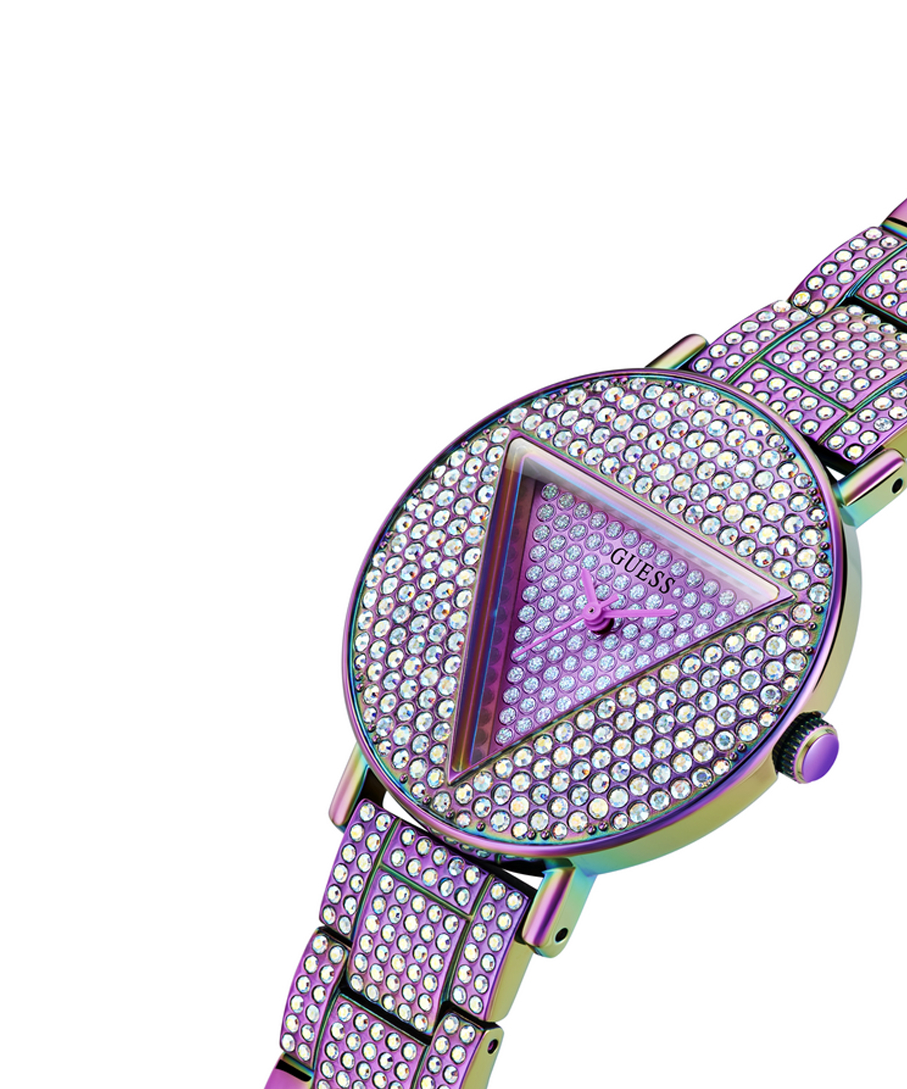 Женские наручные часы американского бренда GUESS GW0512L4. Коллекция - Ladies Trend. В часах установлен надежный кварцевый механизм Miyoata. Стальные с покрытием "хамелеон" корпус и браслет. Диаметр корпуса - 36 мм, толщина - 8,75 мм. Браслет со складной клипсой. Ширина крепления - 16 мм. Главная особенность аксессуара - кристаллы, которыми украшены аналоговый циферблат и часть браслета. Также на циферблате треугольник - элемент логотипа бренда.