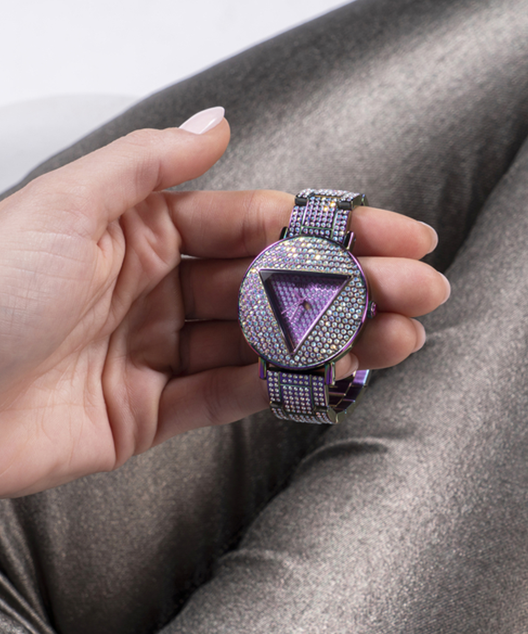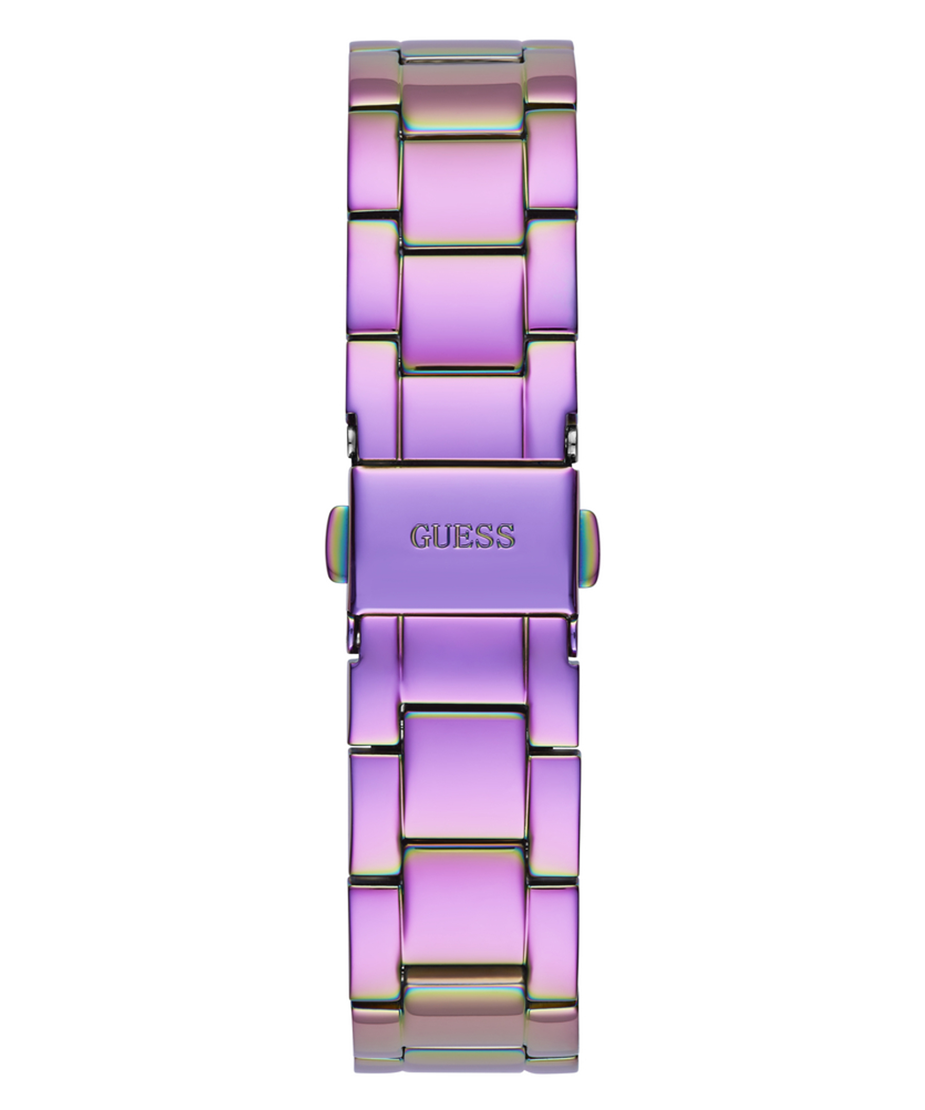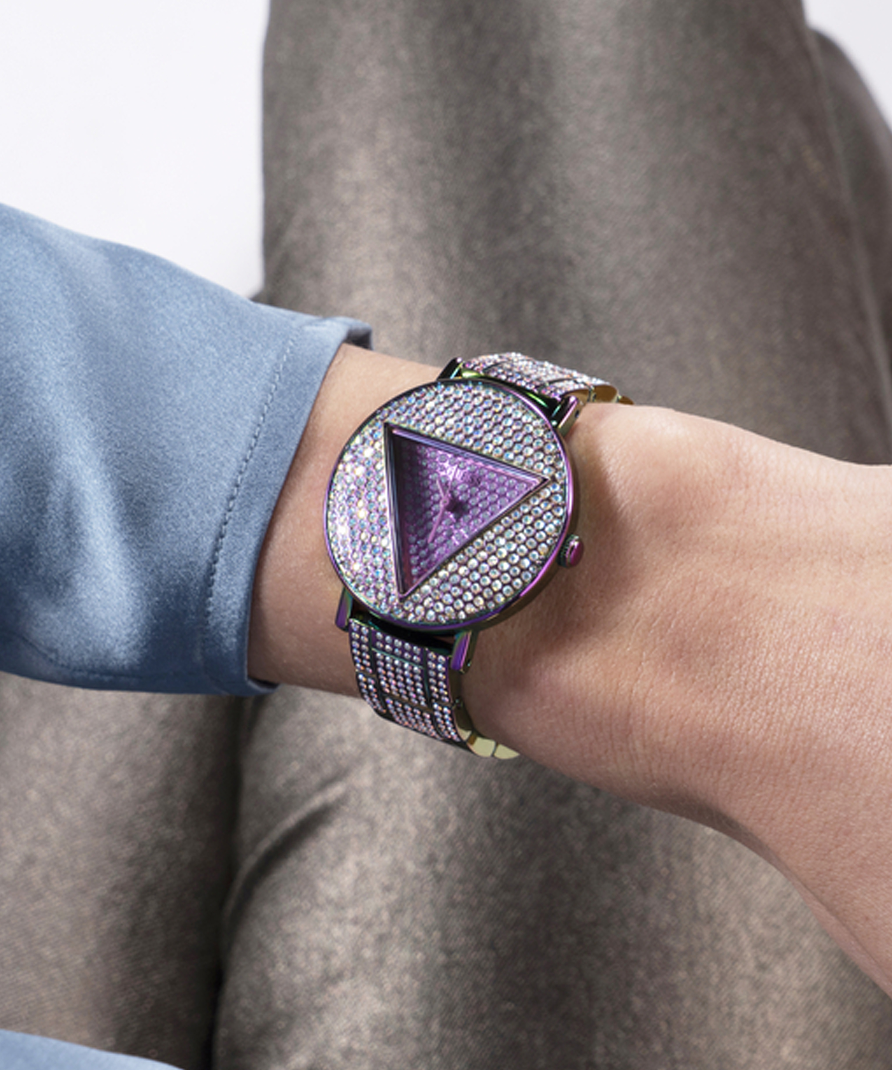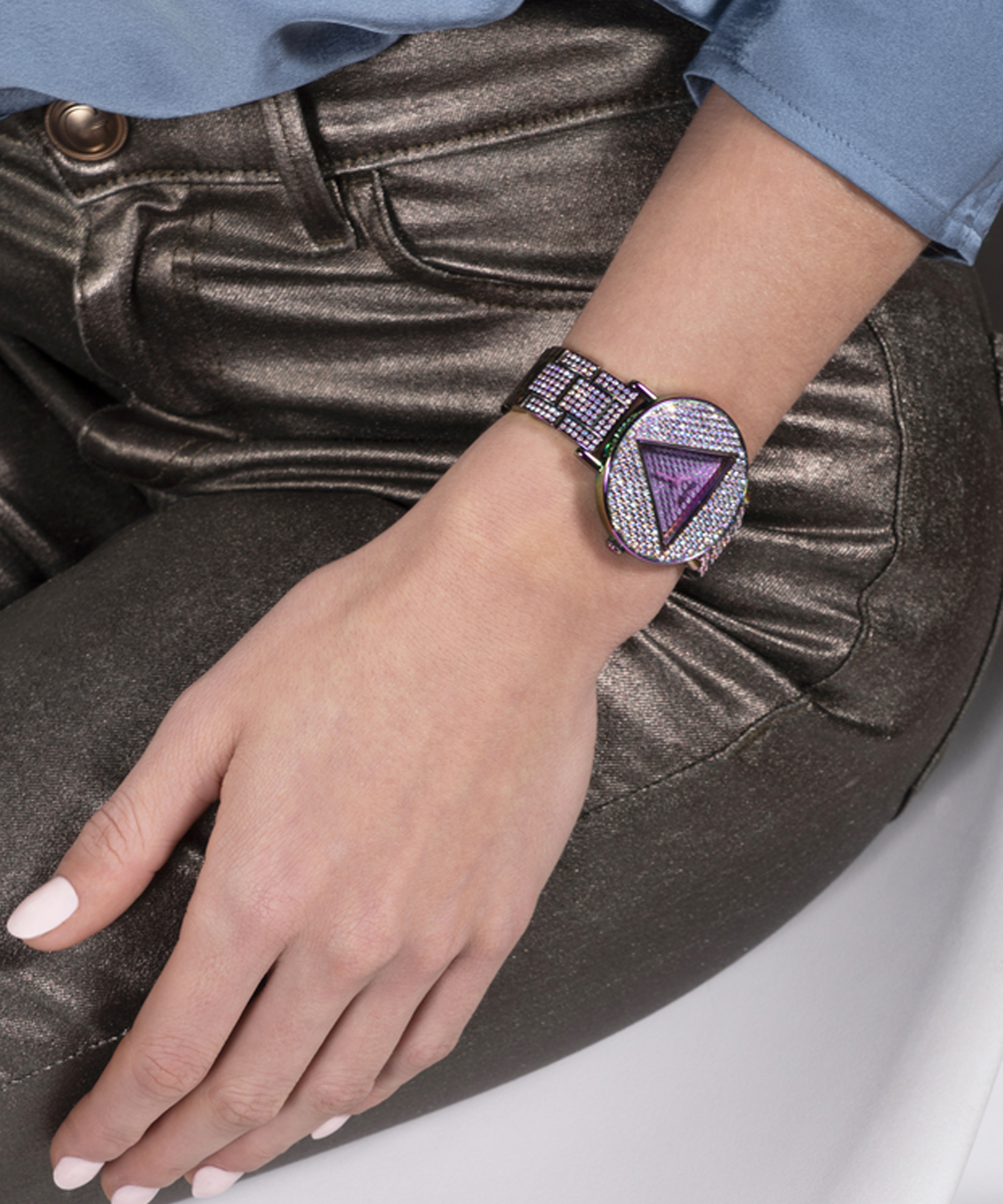 Женские наручные часы американского бренда GUESS GW0512L4. Коллекция - Ladies Trend. В часах установлен надежный кварцевый механизм Miyoata. Стальные с покрытием "хамелеон" корпус и браслет. Диаметр корпуса - 36 мм, толщина - 8,75 мм. Браслет со складной клипсой. Ширина крепления - 16 мм. Главная особенность аксессуара - кристаллы, которыми украшены аналоговый циферблат и часть браслета. Также на циферблате треугольник - элемент логотипа бренда.
