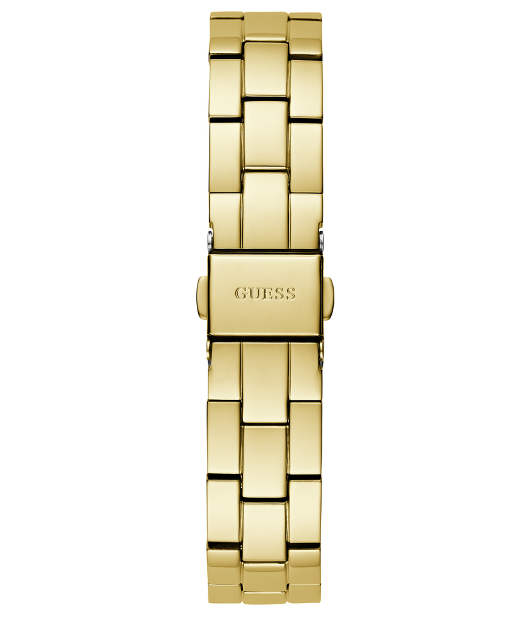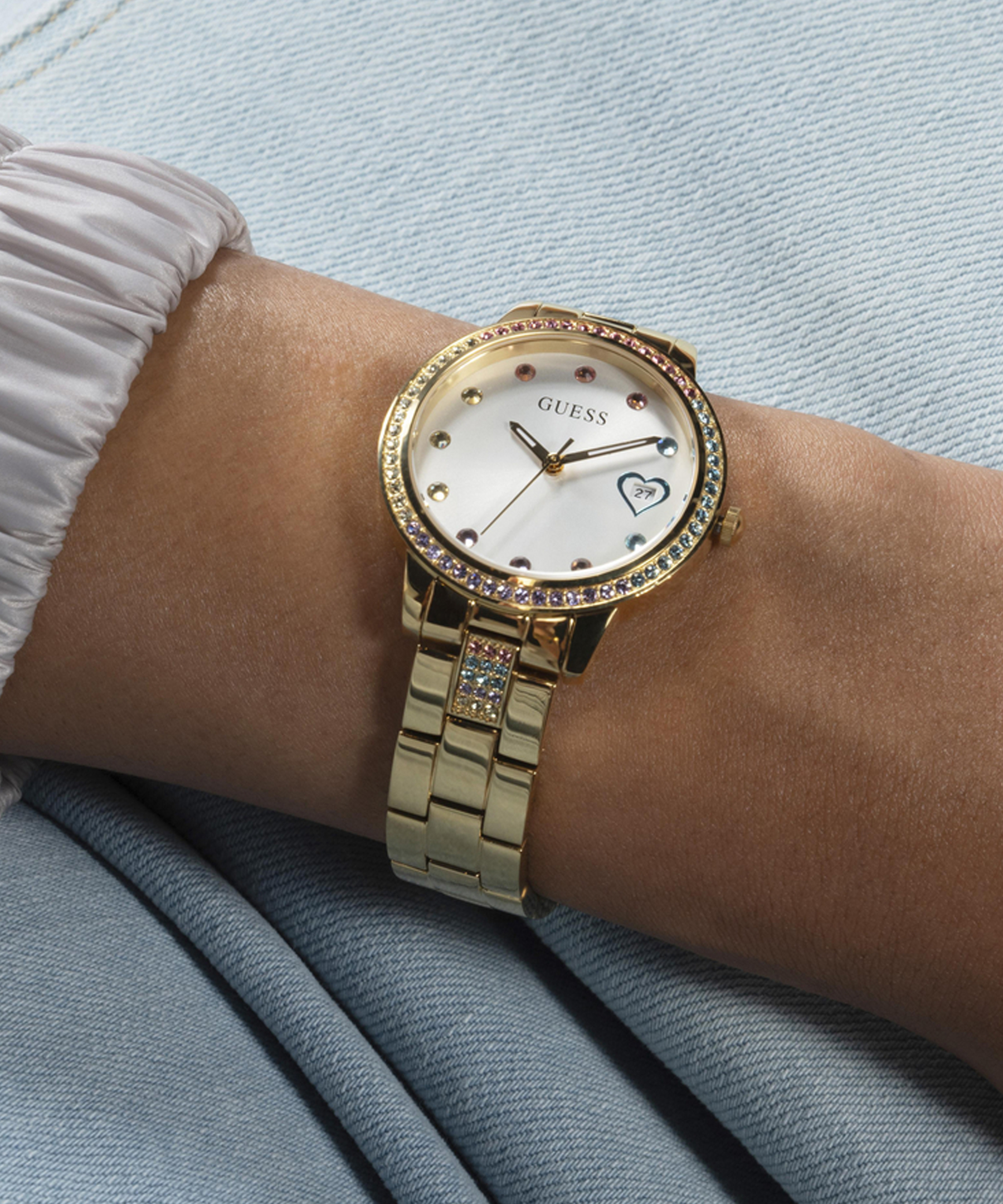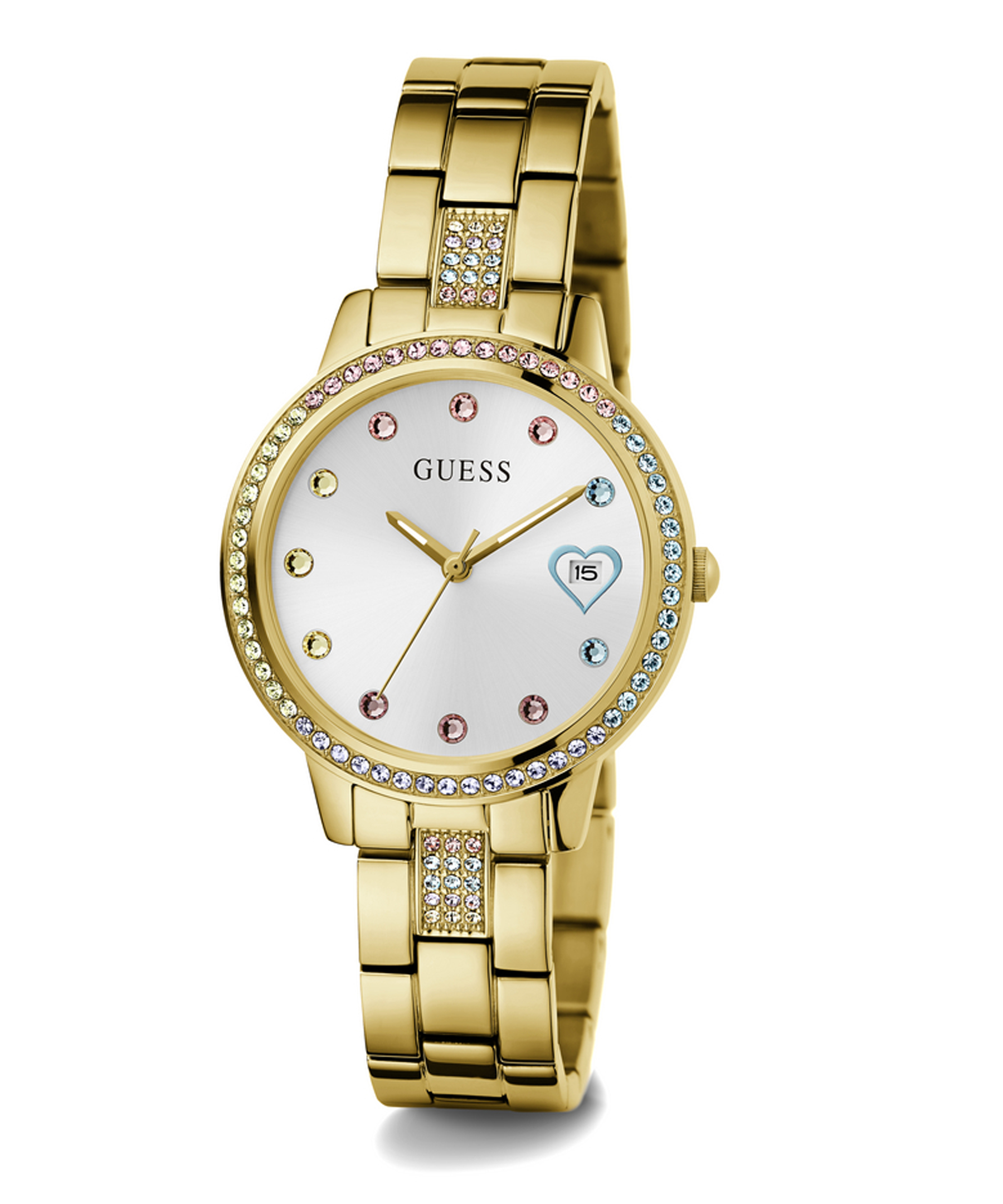 Изысканные Часы женские GUESS GW0657L2 из коллекции LADIES DRESS. Установлен надежный кварцевый механизм Miyota. Корпус и браслет часов выполнены из стали с золотистым покрытием. Диаметр корпуса – 34 мм, толщина – 7,9 мм. Браслет с удобной застежкой – складной клипсой. Аналоговый циферблат Sunray защищен прочным минеральным стеклом. Роль индексов времени выполняют разноцветные кристаллы, переблискивающиеся с камнями на безели. В окошке в виде сердца – отображение даты, придающей аксессуару не только изящный вид, но и максимальной функциональности. Водозащита – 3 АТМ.