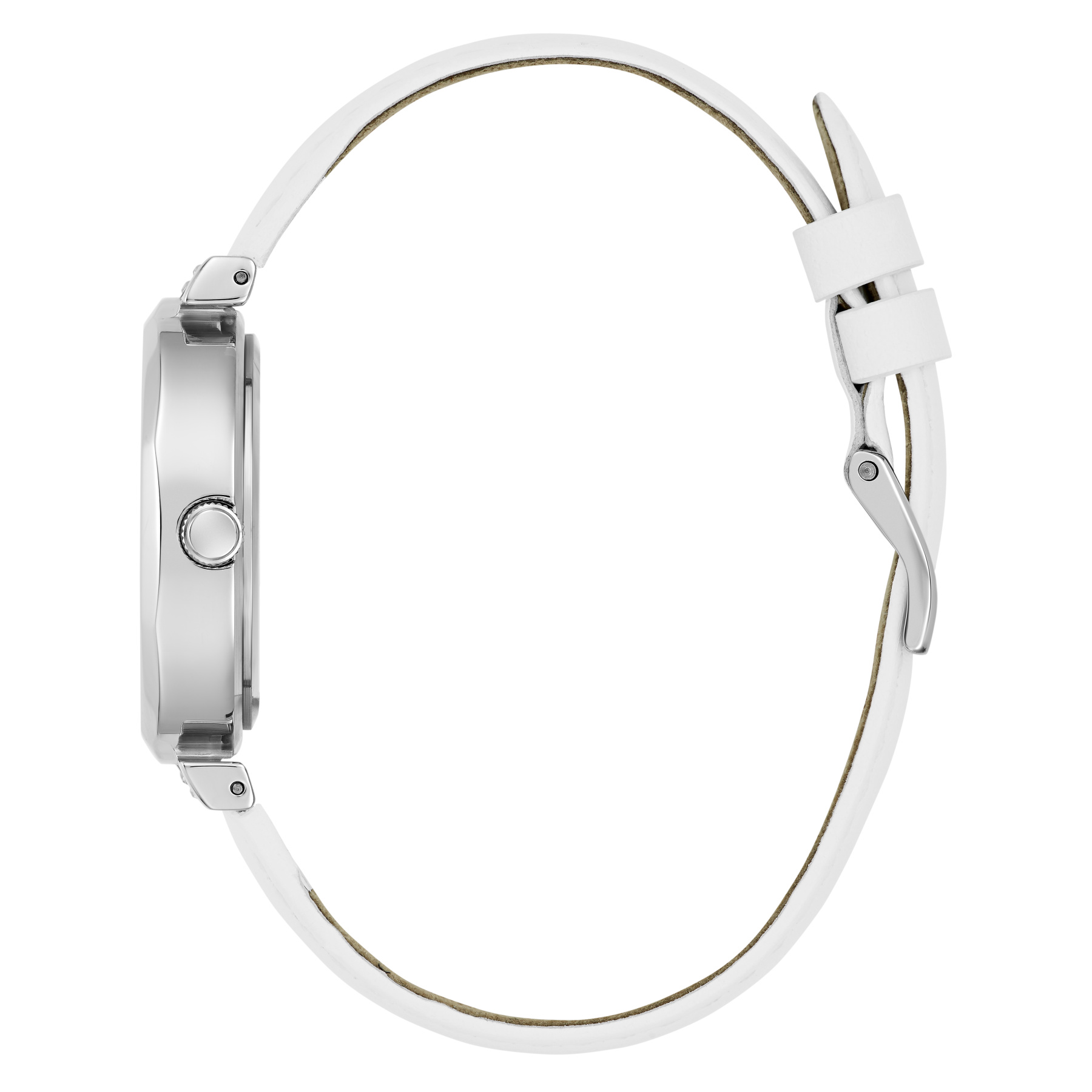 Лаконичные часы GW0689L1 с кварцевым механизмом Мийота. Стальной корпус. Диаметр корпуса – 34 мм. Белый кожаный ремешок с классической пряжкой. Аналоговый циферблат защищен минеральным стеклом. Водозащита – 3 АТМ.