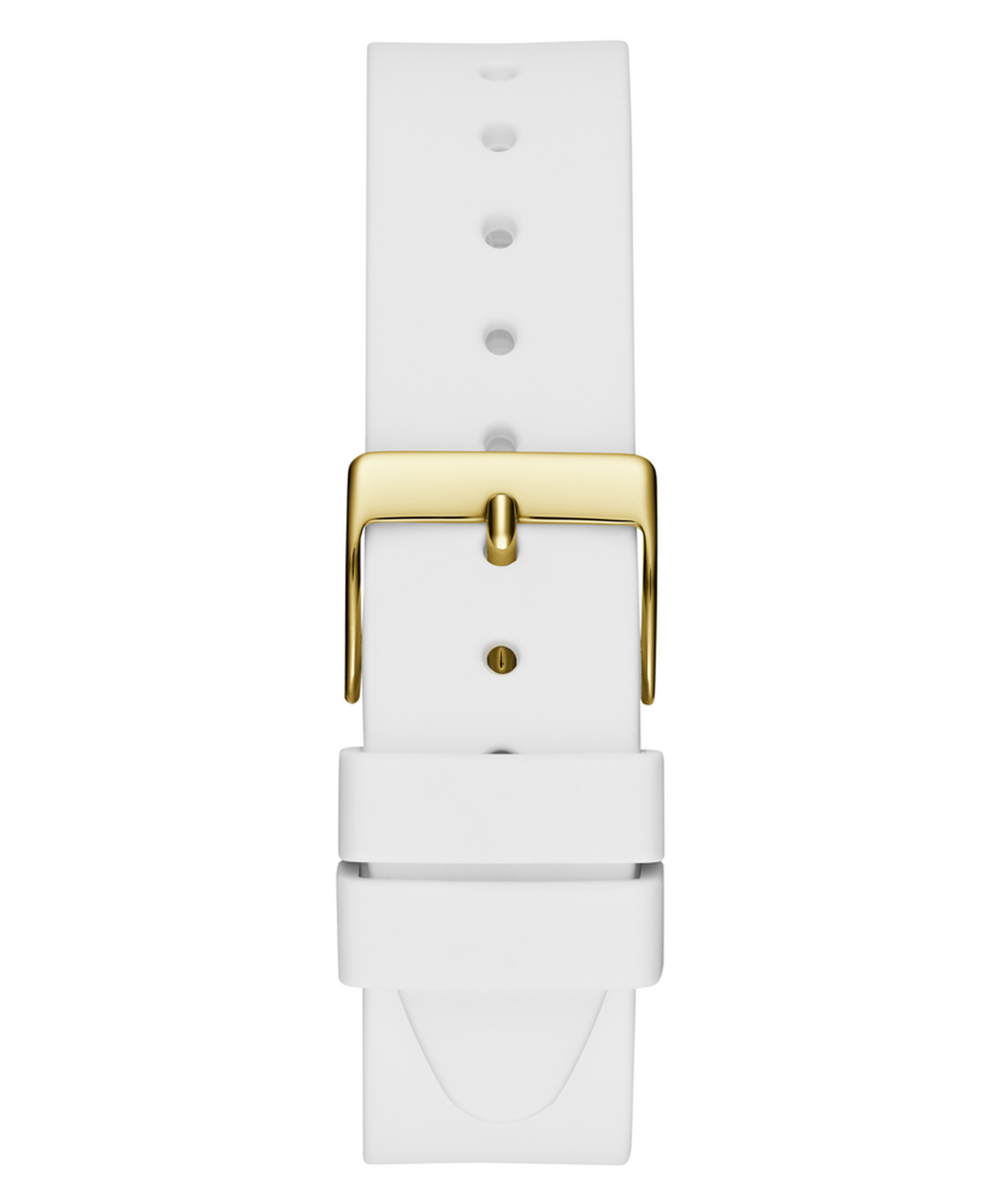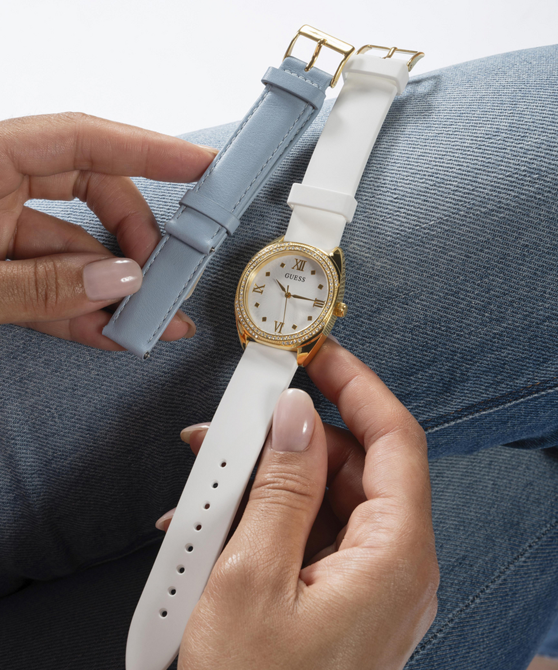 Стильный стальной корпус диаметром 34 мм с покрытием Gold Tone подчеркивает изящную эстетику аксессуара, а его универсальный дизайн позволяет совмещать часы с любым стилем. В комплекте идут два ремешка: белый силиконовый и голубой из натуральной кожи, что позволяет изменять вид часов в соответствии с настроением или обстоятельствами.