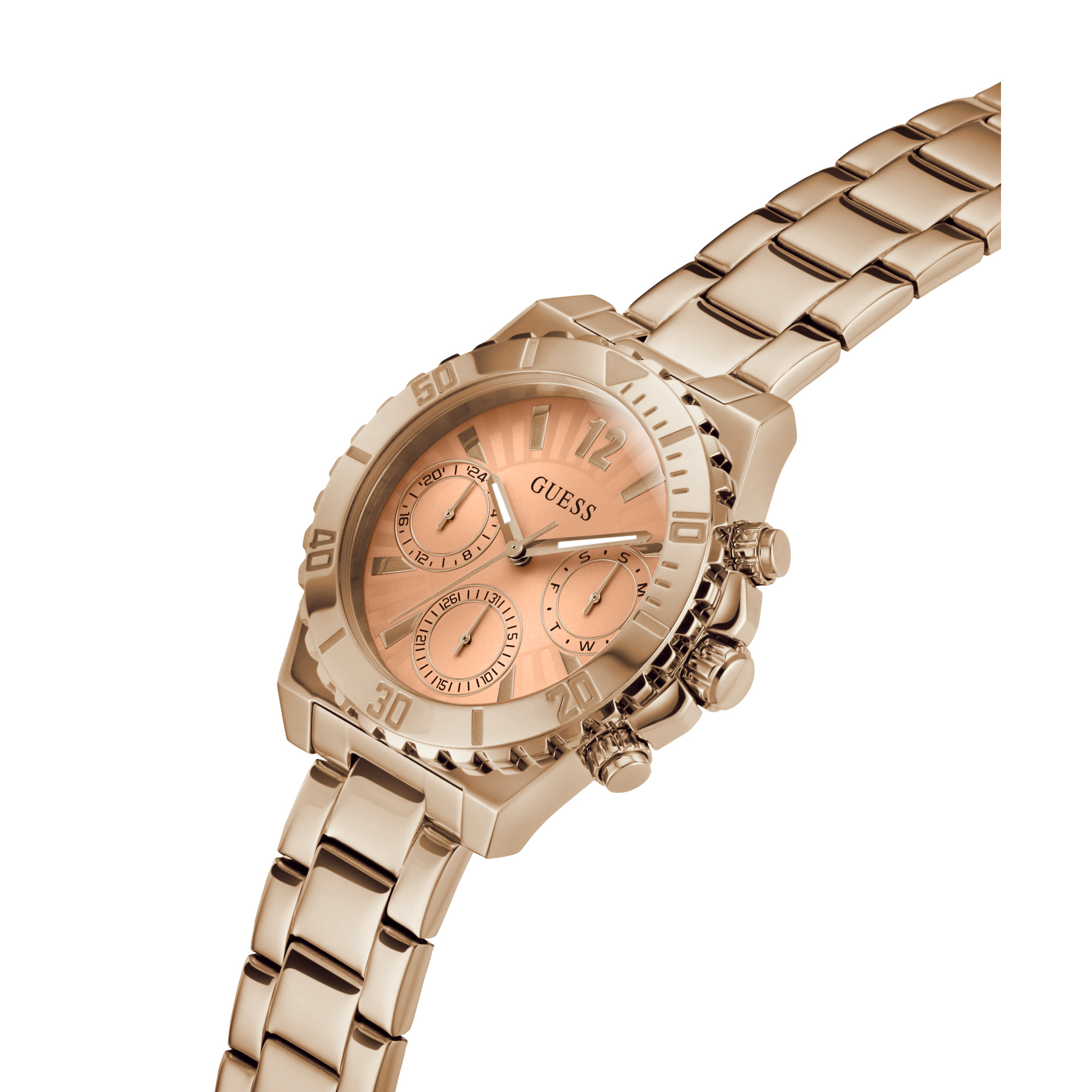 Оригинальные часы женские GW0696L3 с надежным кварцевым механизмом Miyota. Стальные с покрытием цвета розового золота корпус и браслет. Диаметр корпуса – 38,2 мм. Аналоговый циферблат золотистого цвета. Минеральное стекло. Водозащита 3 АТМ.