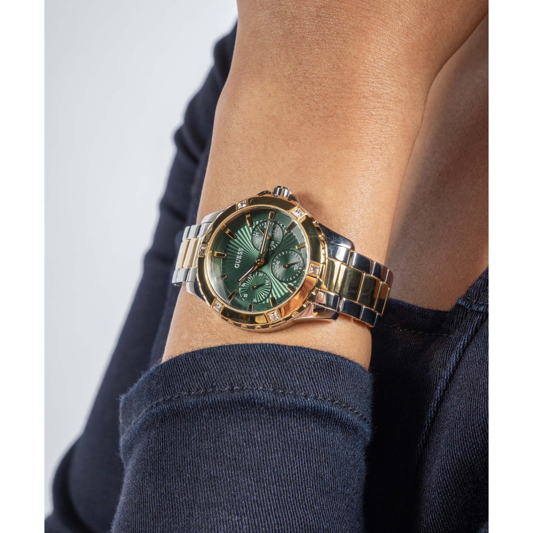 Оригинальные часы женские GW0723L1 американского бренда GUESS. Стальные с комбинированным покрытием корпус и браслет. Диаметр корпуса – 35 мм. Аналоговый циферблат насыщенного зеленого цвета защищен минеральным стеклом. Водозащита – 5 АТМ.