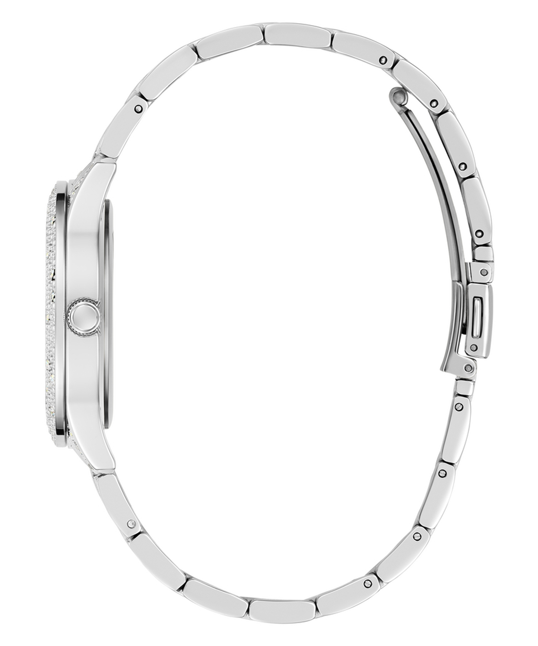 Завдяки надійному кварцовому механізму, цей годинник точно слідкує за вашим часом, даруючи впевненість у кожній миті. Сталевий корпус і браслет з покриттям Silver Tone додають елегантності, а діаметр корпусу 36 мм і стильна складана кліпса роблять його комфортним і зручним у носінні. Безель і корпус, прикрашені мерехтливими кристалами, додають розкоші і сяйва вашому образу. Водозахист 3 АТМ.