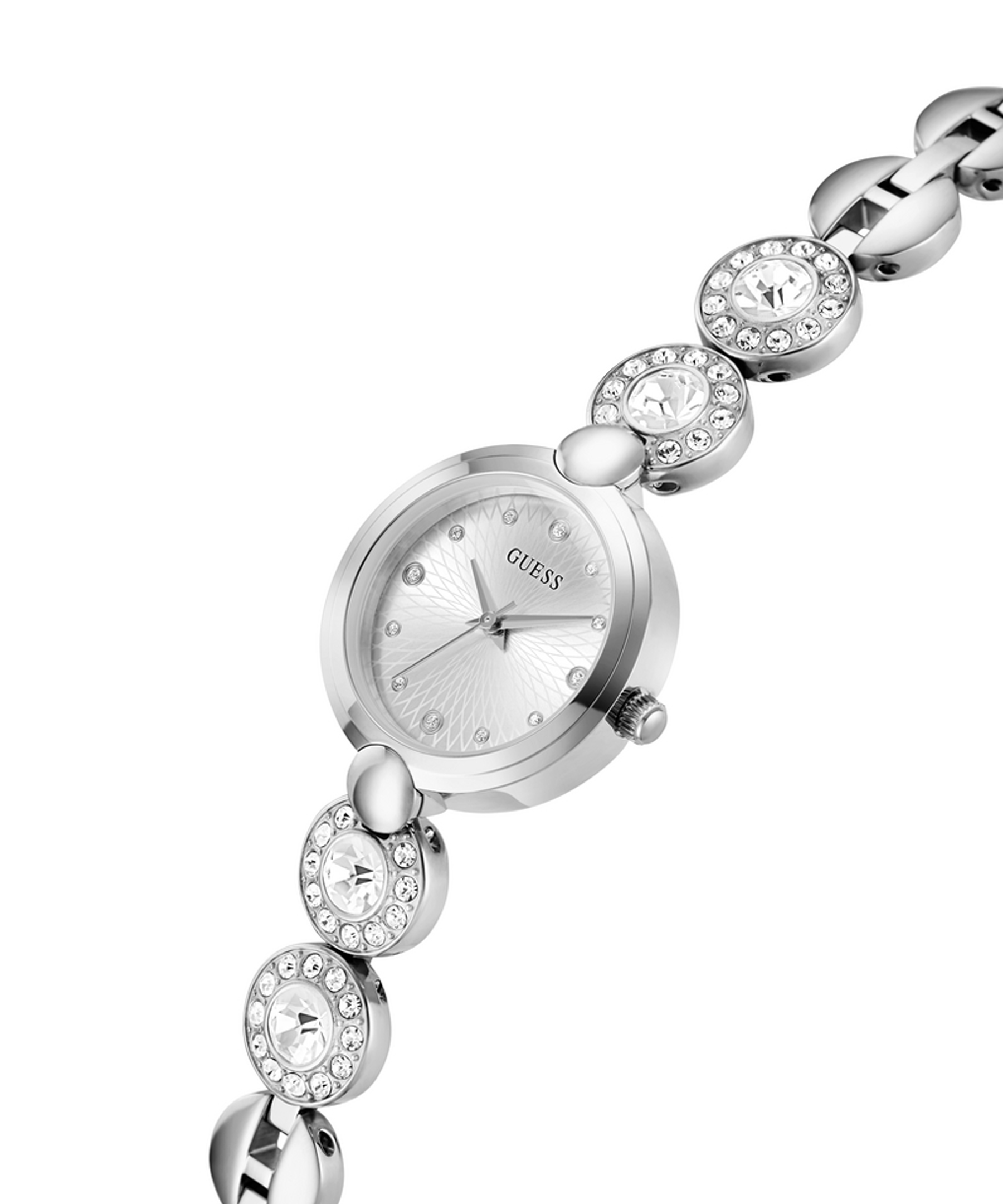 Необычайно женственный дизайн воплощен в новой модели часов американского бренда GUESS. В часах установлен надежный японский механизм Miyota. Стальной корпус и браслет. Нестандартный дизайн, надежность кварцевого механизма Miyota и практичность совмещены в одном аксессуаре, который может служить своей владелице как самостоятельное ювелирное украшение. Диаметр корпуса – 26 мм. Серебристый аналоговый циферблат защищен прочным минеральным стеклом. Водозащита 3 АТМ.