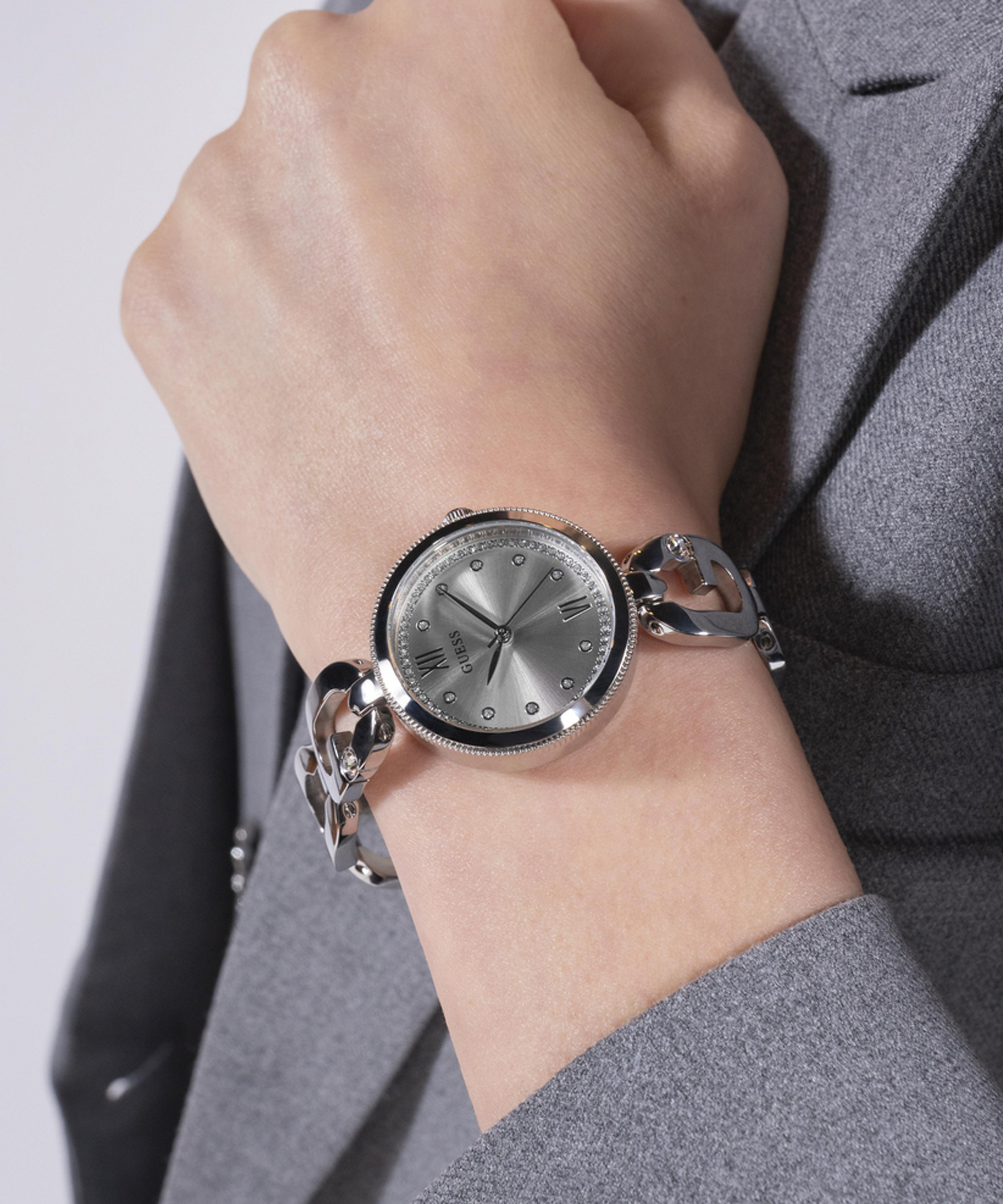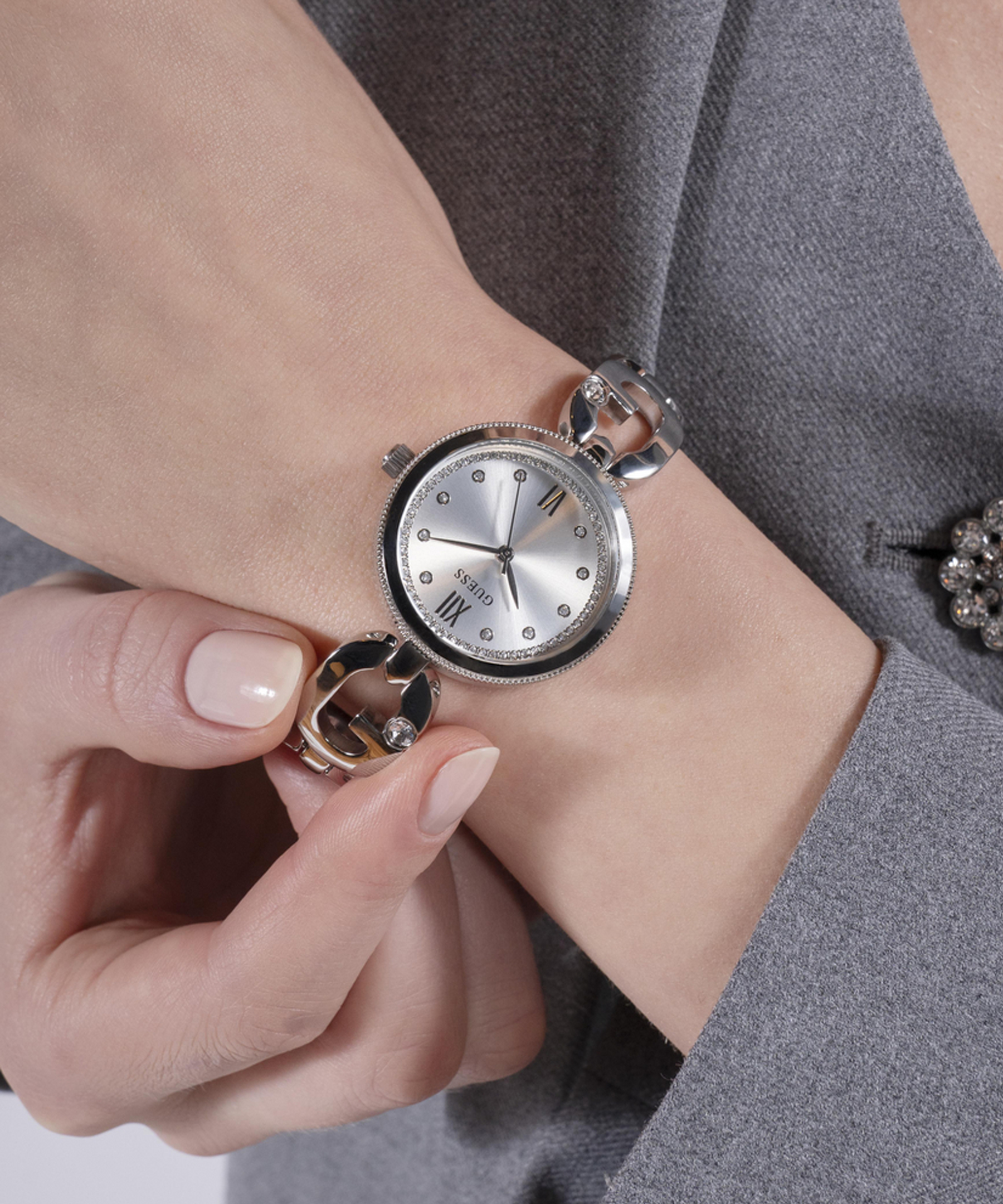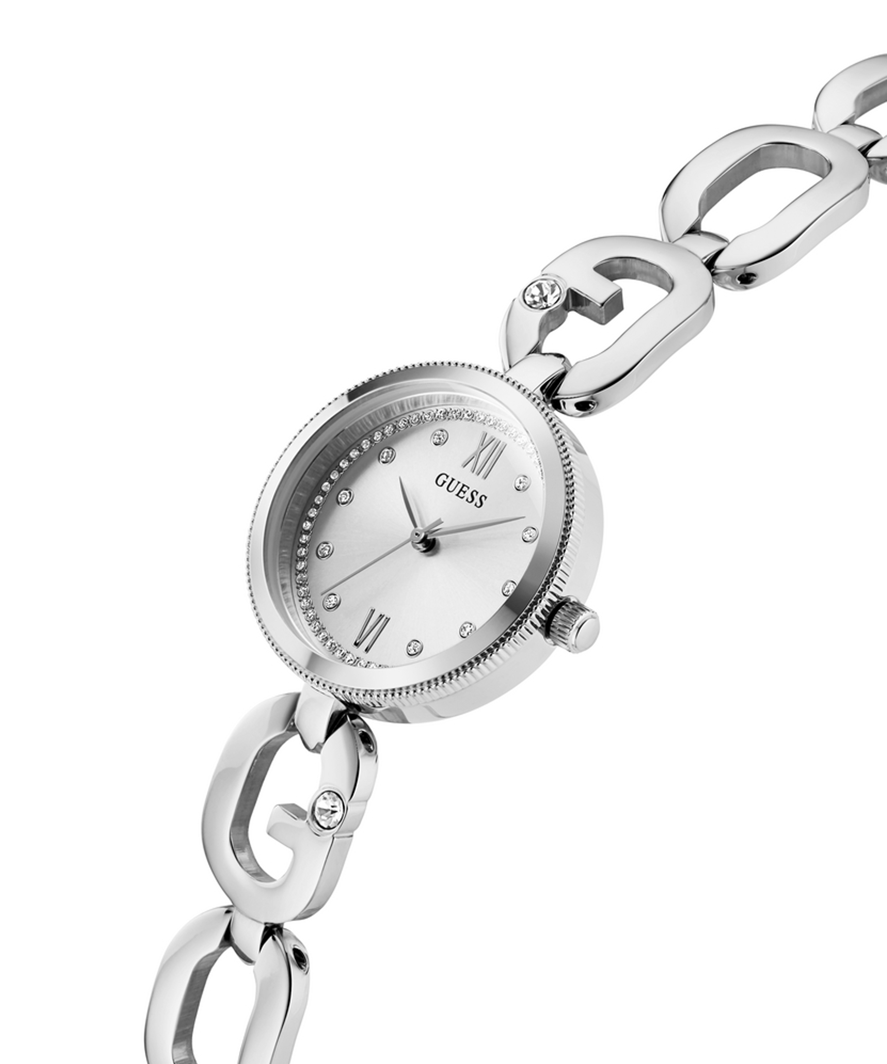 Очень женственный дизайн воплощен в новой модели часов американского бренда GUESS. В часах установлен надежный японский механизм Miyota. Стальной корпус и браслет. Изысканный дизайн, надежность кварцевого механизма Miyota и практичность совмещены в одном аксессуаре, который может служить своей владелице как самостоятельное ювелирное украшение. Диаметр корпуса: 30 мм. Аналоговый циферблат надежно защищен прочным минеральным стеклом. Водозащита 3 АТМ.