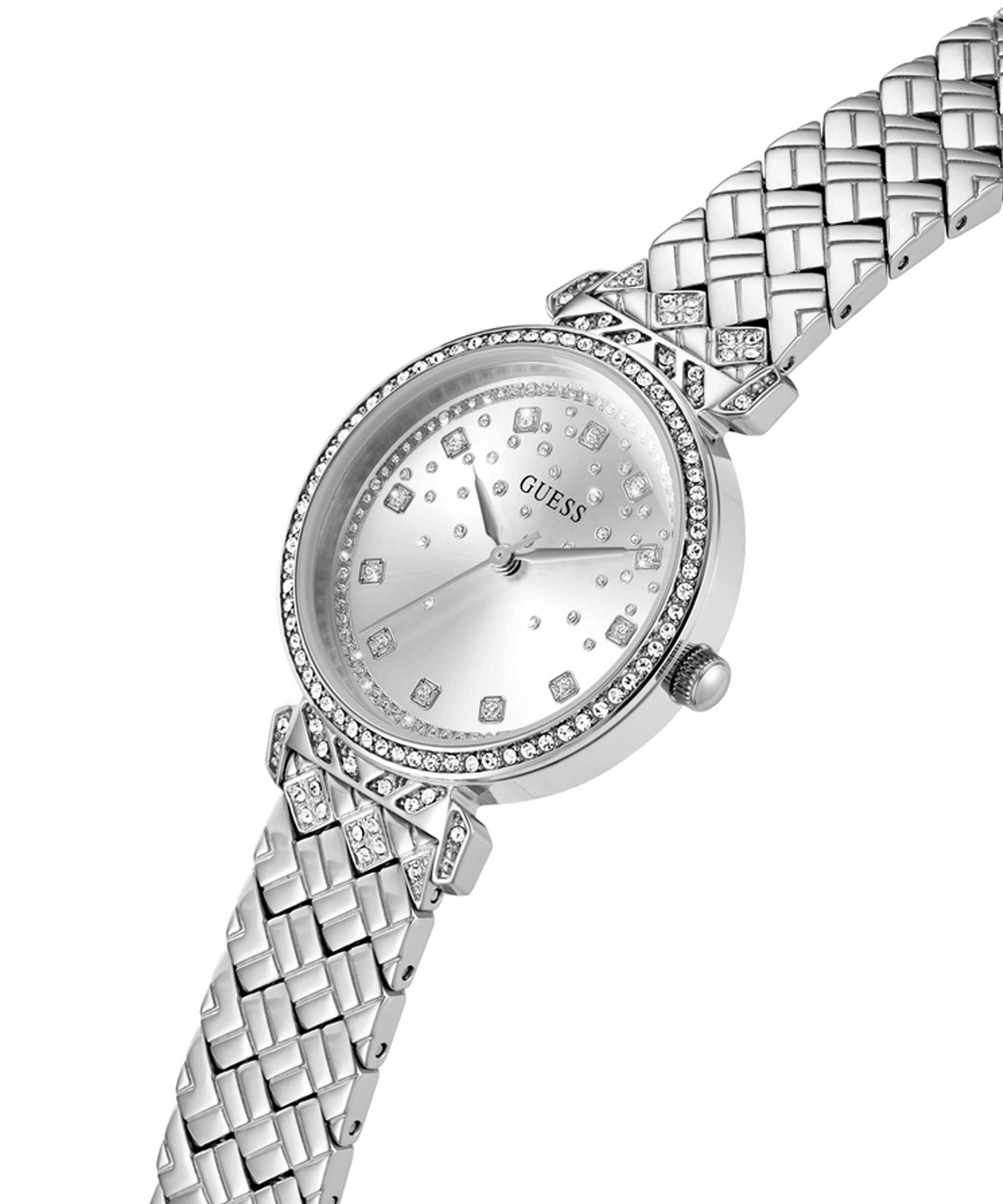 Очень женственный дизайн воплощен в новой модели часов американского бренда GUESS. В часах установлен надежный японский механизм Miyota. Стальной корпус и браслет. Изысканный дизайн, надежность кварцевого механизма Miyota и практичность совмещены в одном аксессуаре, который может служить своей владелице как самостоятельное ювелирное украшение. Диаметр корпуса – 32 мм. Серебристый аналоговый циферблат защищен прочным минеральным стеклом. Водозащита: 3 АТМ.