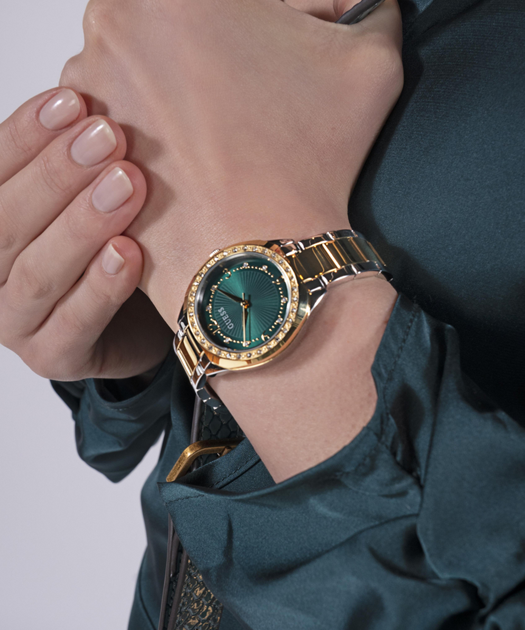 Насыщенный зелёный циферблат гармонично дополняется корпусом из нержавеющей стали с золотисто-серебристым покрытием. Изящные кристаллы на безеле добавляют сияния и делают модель эффектной. Часовые метки оформлены в минималистичном стиле, а тонкие золотистые стрелки подчёркивают утонченность дизайна.