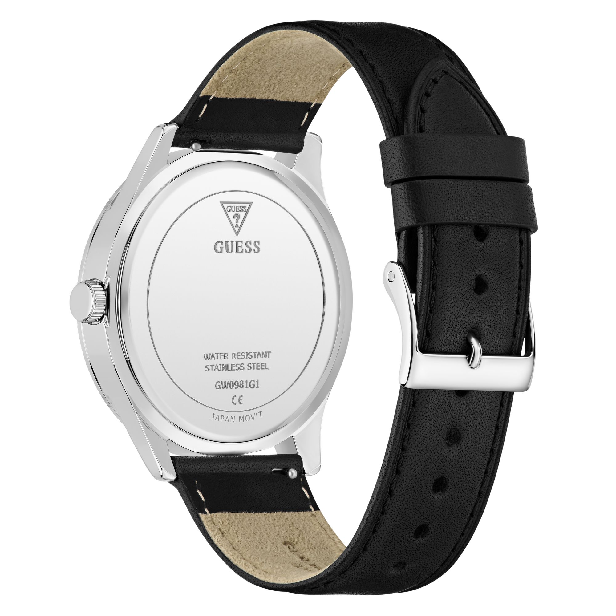 Цей набір від GUESS поєднує універсальність та характерний логотипний дизайн. Годинник має 44 мм круглий корпус у сріблястому тоні з полірованої переробленої сталі та унікальну текстуру. Чорний циферблат із логотипом GUESS створює яскравий акцент у будь-якому образі.