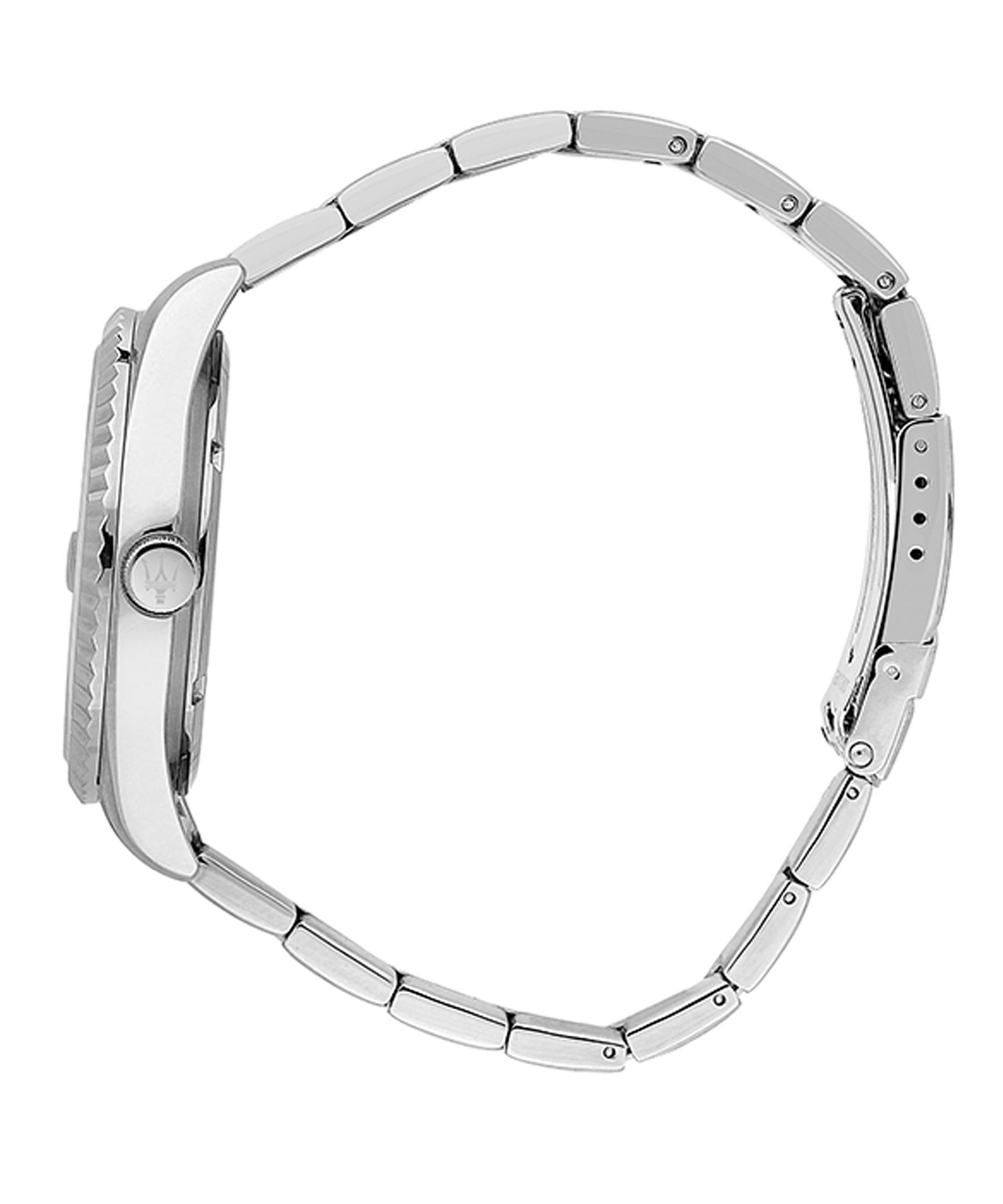 Мужские классические кварцевые часы Maserati R8853100029. Стальные корпус и браслет. Диаметр корпуса - 43 мм. Толщина корпуса - 11,5 мм. Синий циферблат с отображением даты. Текстурный безель. Минеральное стекло.