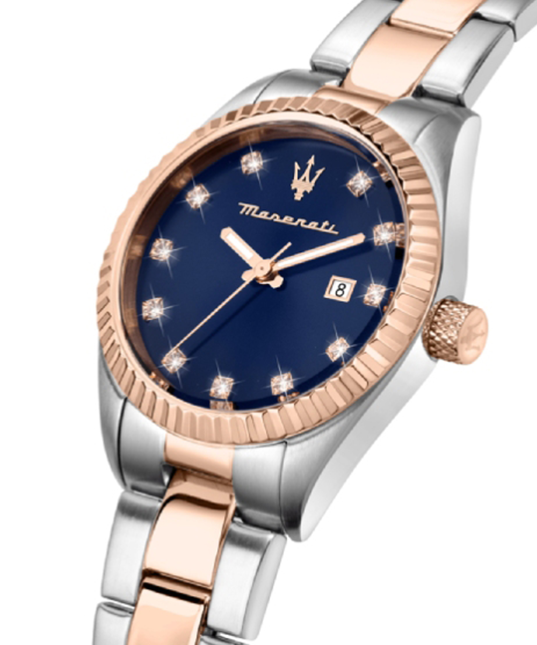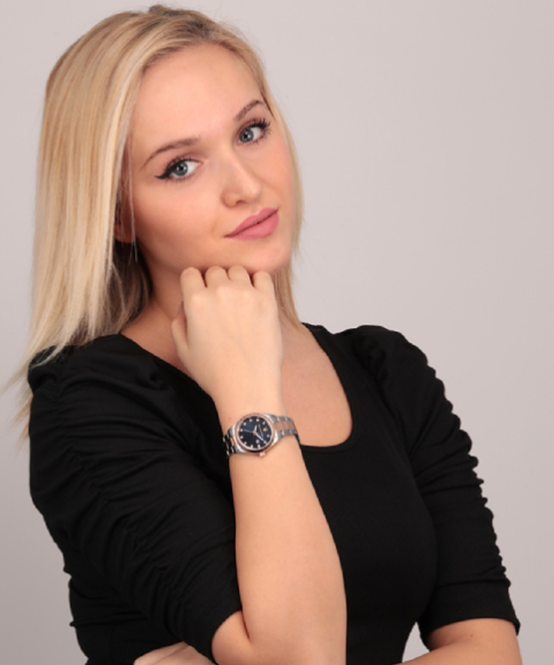 Корпус и браслет выполнены из высококачественной стали с комбинированным покрытием, что придает часам роскошный вид и изящество. Циферблат глубокого синего цвета поражает своей интенсивностью, а вместо привычных меток времени — сияющие кристаллы, придающие уникальной элегантности часы.