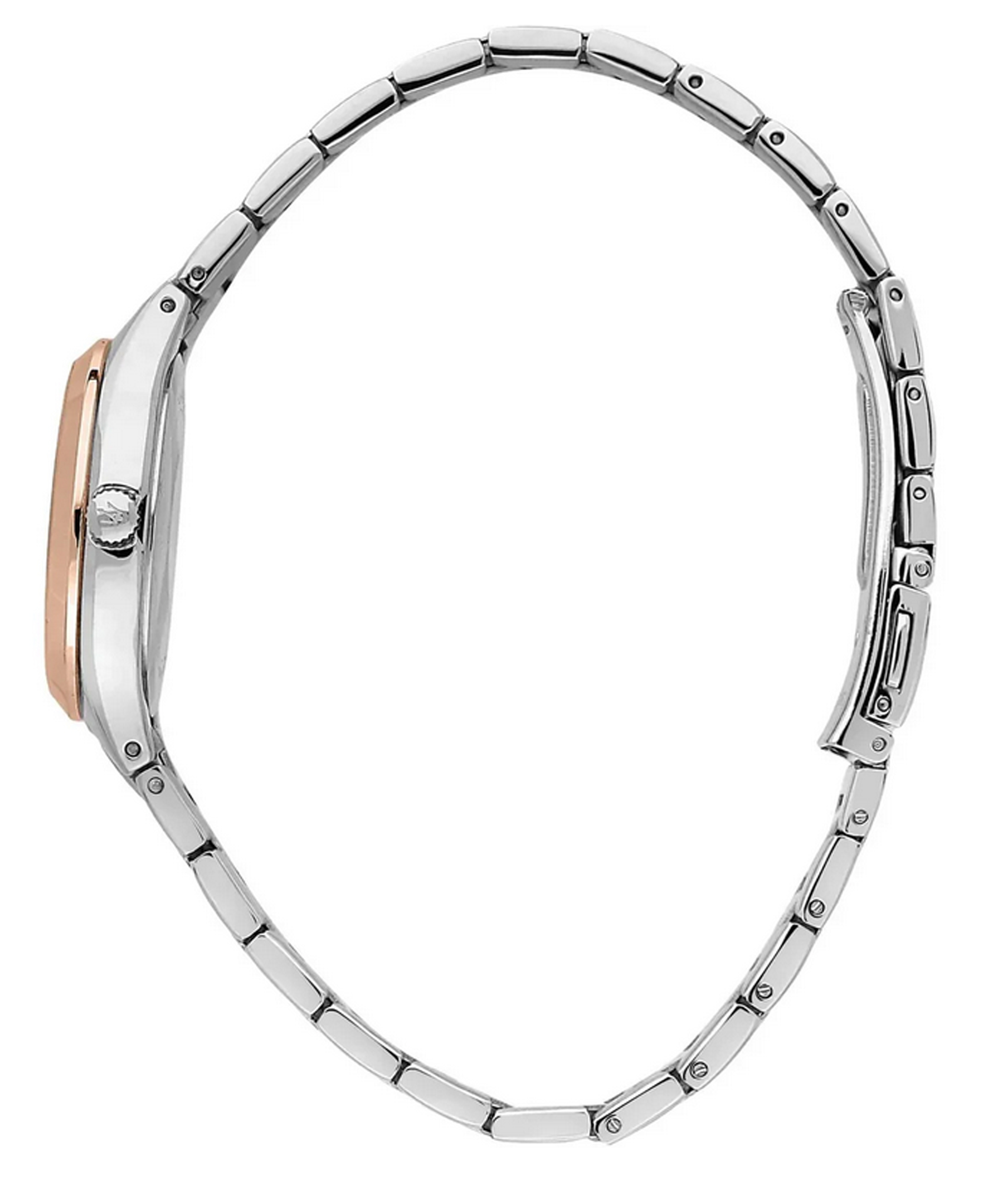 Стальной корпус с комбинированным покрытием и браслет с застежкой складной клипсой надежно фиксируют часы на запястье, гарантируя комфорт и удобство при ношении. Диаметр корпуса 30 мм и толщина 8 мм придают часам изящный вид, подчеркивая его женственный стиль. Перламутровый аналоговый циферблат, декорированный цирконами в роли меток времени, создает роскошный и яркий акцент, а крепкое минеральное стекло защищает его от царапин и повреждений.