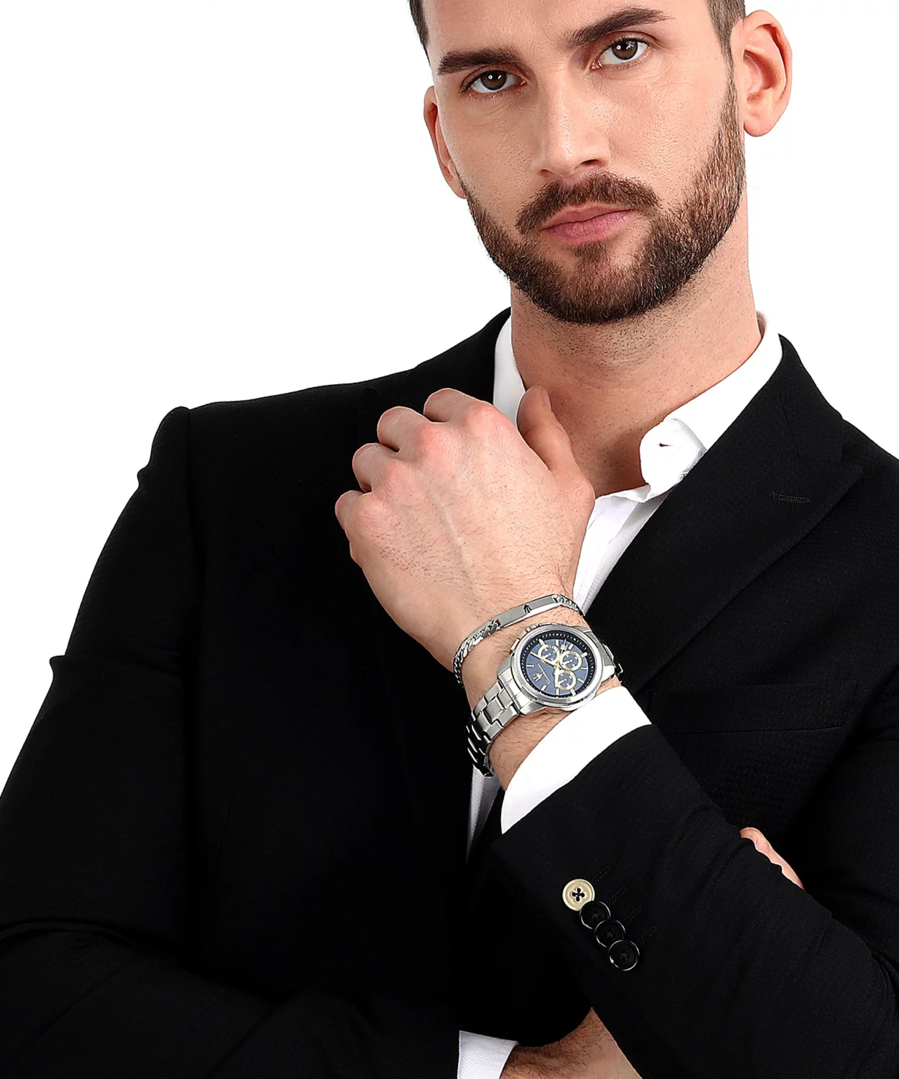 Корпус и браслет часов изготовлены из высококачественной стали, что обеспечивает им устойчивость к повреждениям и выносливость. Модель оснащена полезными функциями, такими как 12/24-часовой формат времени, хронограф и дата, позволяющая легко отслеживать время в любых условиях. С диаметром корпуса 44 мм и толщиной 11 мм, часы выглядят впечатляюще, но при этом сохраняют комфортный вид на запястье.