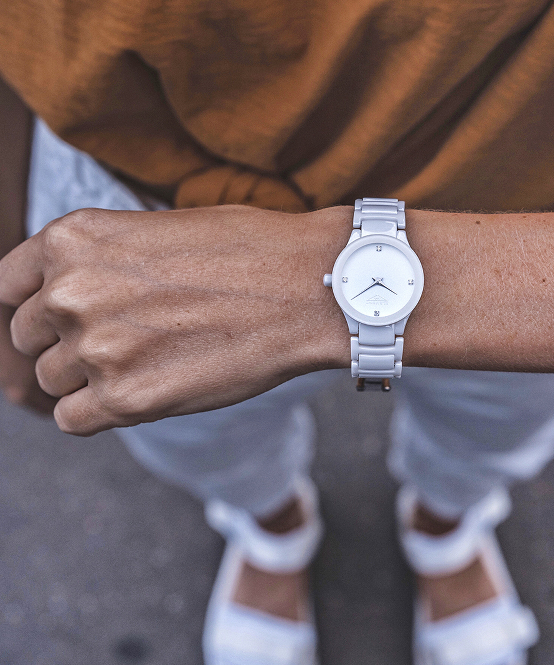 Жіночий кварцовий годинник литовського бренду 33 Element виконаний з високоякісної кераміки білого кольору. Серцем годинника служить швейцарський точний механізм Ronda. Керамічний легкий браслет із великих ланок красиво обрамляє руку. Діаметр корпусу - 29 мм. Мінеральне із сапфіровим покриттям скло має особливу міцність і бездоганну прозорість. Запропонована модель оригінально поєднується як зі спортивним, так і з класичним одягом, створюючи відчуття легкості, світла та повітря.