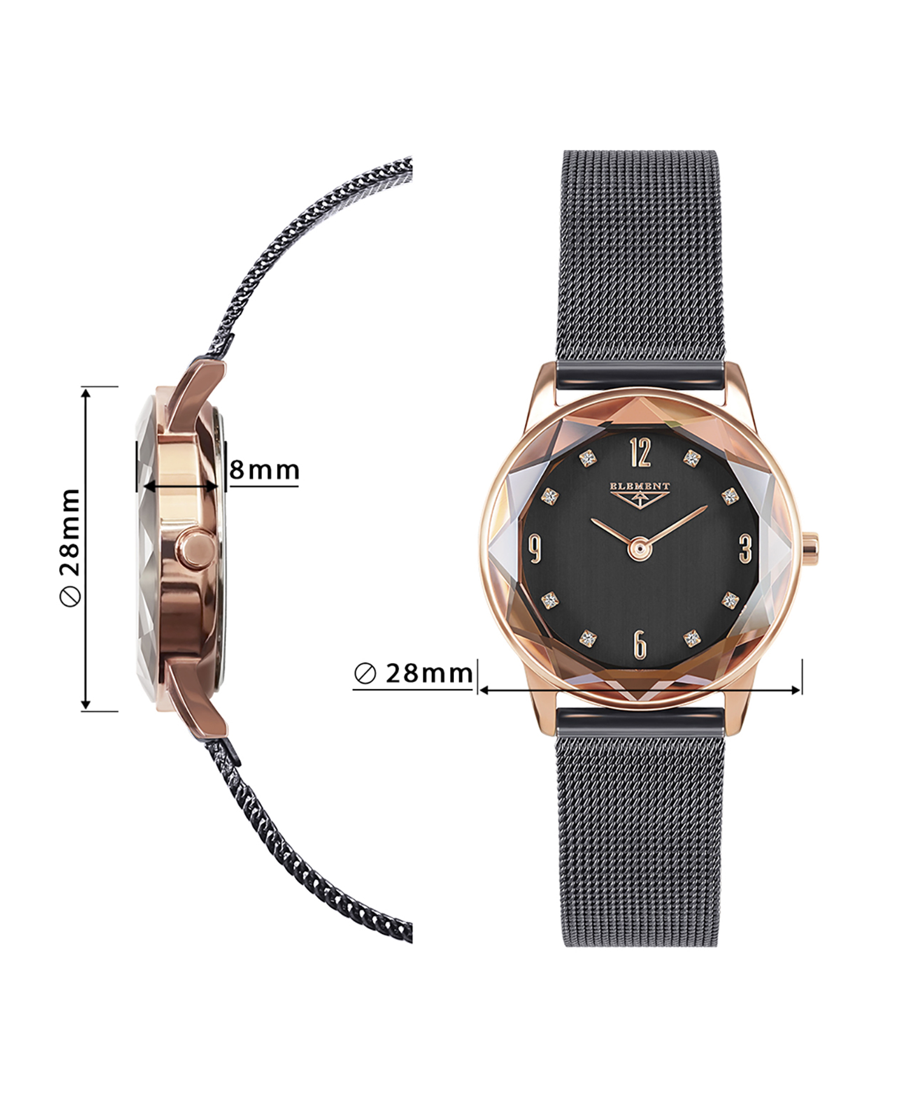 Витончений жіночий годинник 33 Element в класичному стилі з точним швейцарським механізмом Ronda виготовлений з нержавіючої сталі в кольорі Rose gold. Діаметр корпусу 28 мм. На сірому циферблаті з арабськими цифрами сяють кристали Сваровські, виконуючи функції індексів часу. Мінеральне з сапфіровим напиленням скло.Сталевий браслет плетіння mesh із покриттям Gray завершує елегантний образ аксесуара. Аксесуар створений для стильних жінок і цілком може бути використаний як самостійна прикраса.