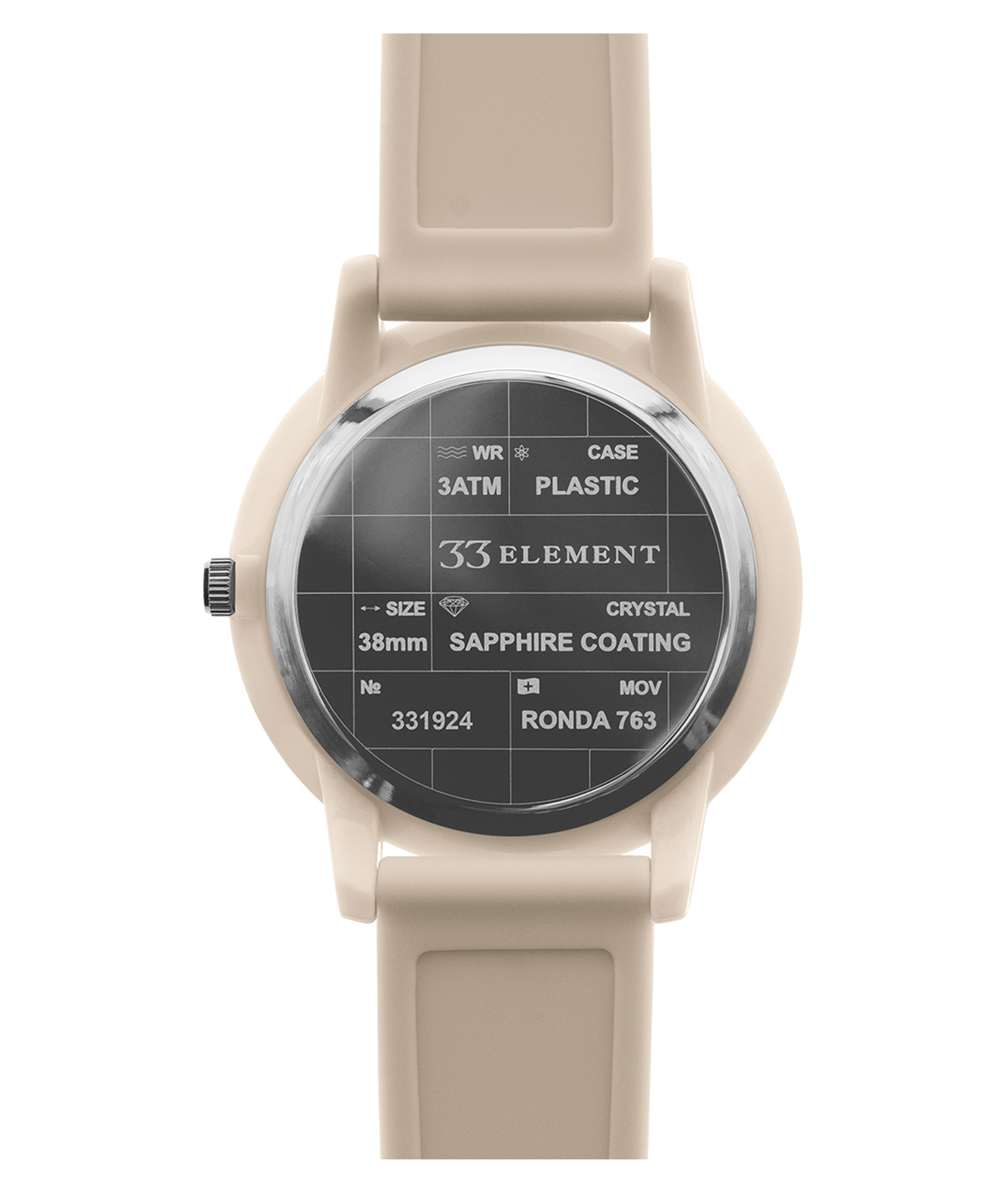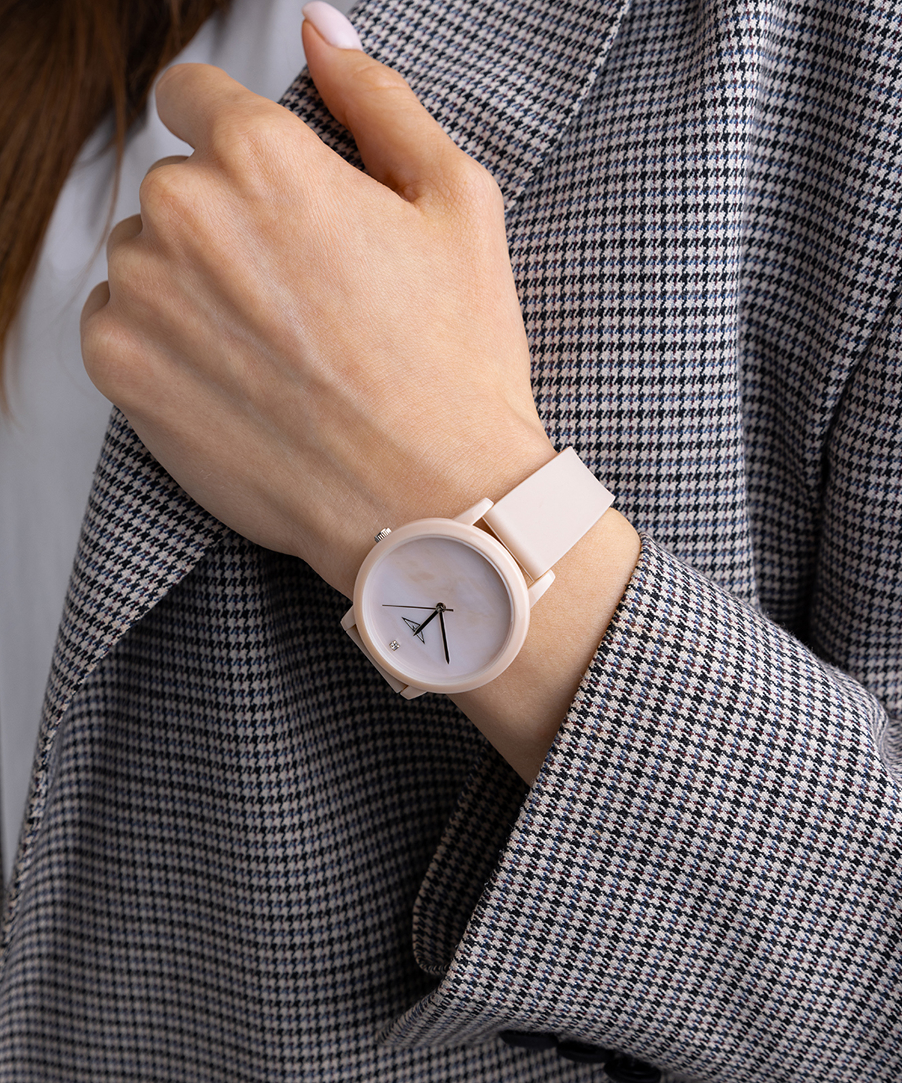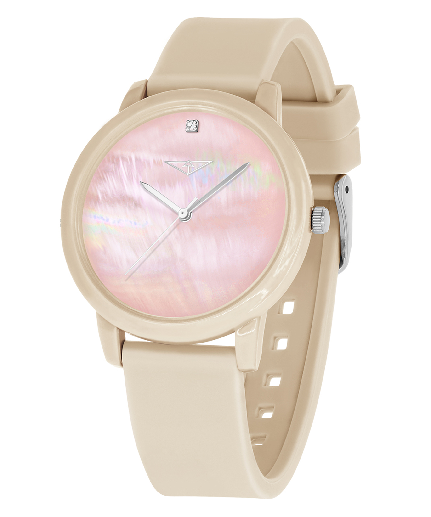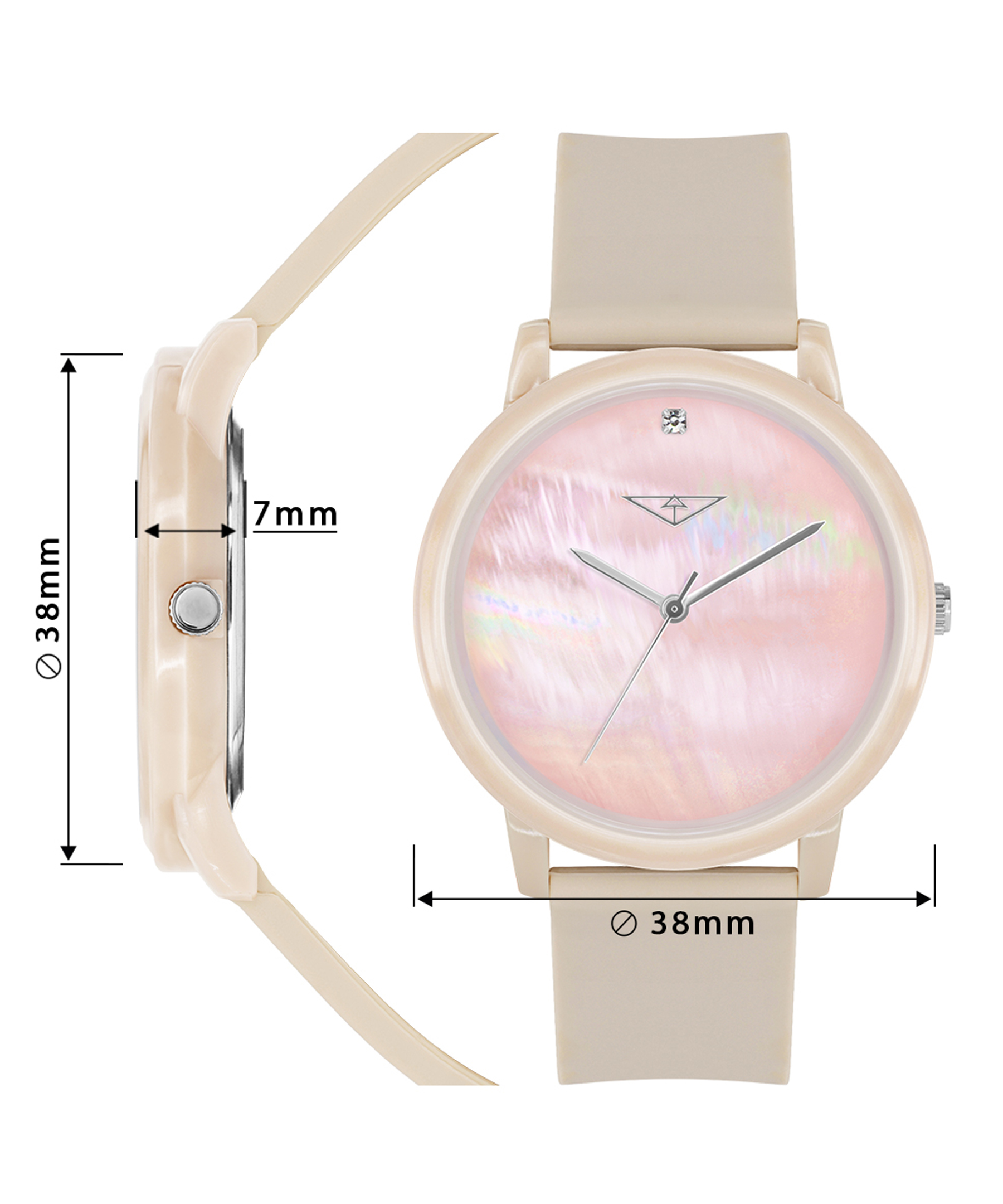 Мінеральне скло з сапфіровим покриттям, стійке до подряпин і з антивідблиском, надійно захищає циферблат і зберігає його прозорість навіть за активного носіння. Силіконовий ремінець у ніжному бежевому кольорі гармонійно доповнює загальний образ — м’який, жіночний і стильний.