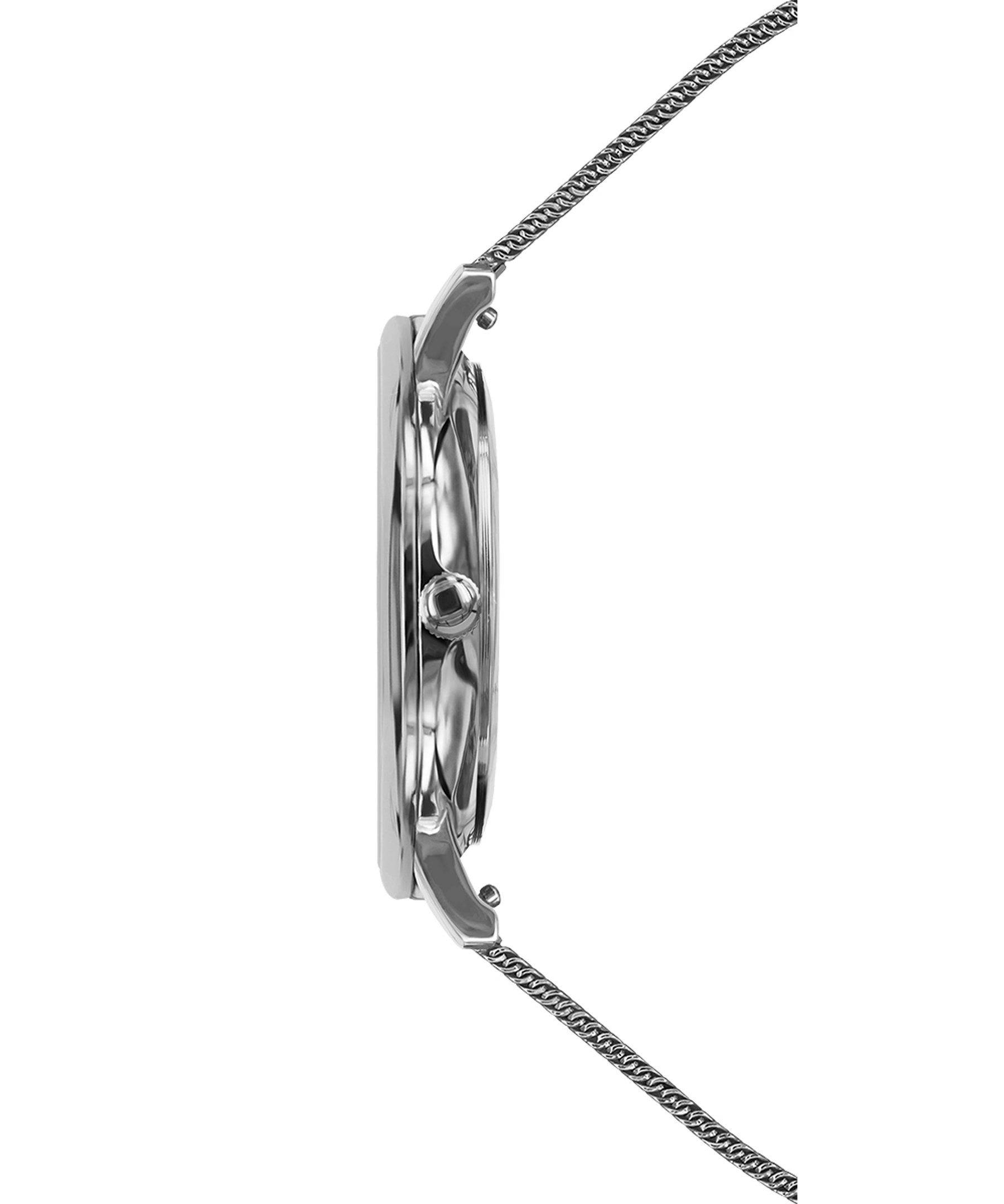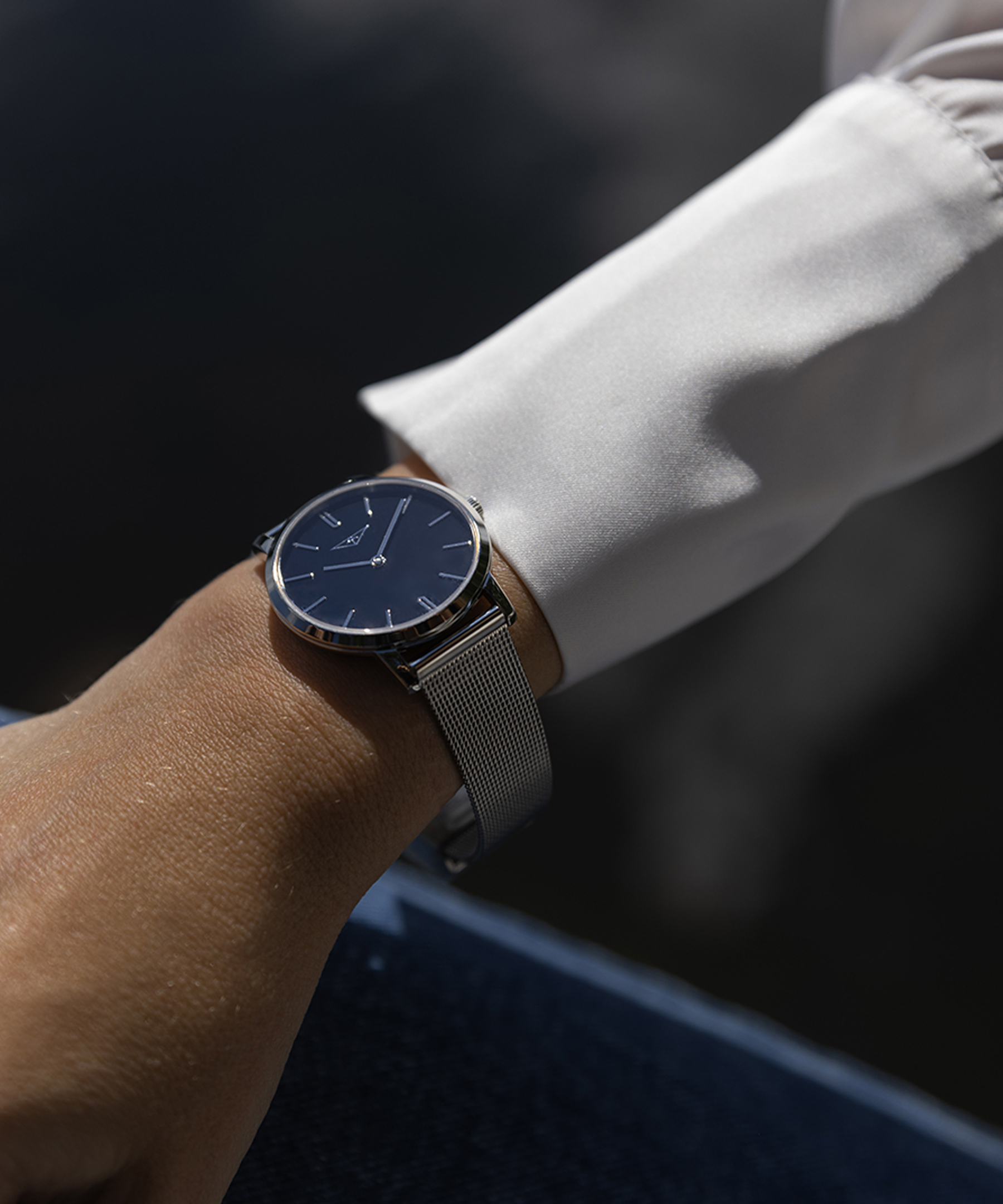 Корпус діаметром 33 мм та товщиною 7 мм виготовлений з високоякісної нержавіючої сталі, що забезпечує довговічність та елегантний вигляд. Чорний циферблат, на якому ніжно мерехтять сріблясті мітки часу, створює вишукану атмосферу. Сапфірове скло — не тільки міцне і прозоре, як дорогоцінний камінь, але й стійке до механічних пошкоджень, з ефектом антивідблиску, що гарантує бездоганний вигляд годинника у будь-яких умовах. Міланський браслет з розкладною застібкою додає додаткову елегантність і забезпечує комфорт при носінні.