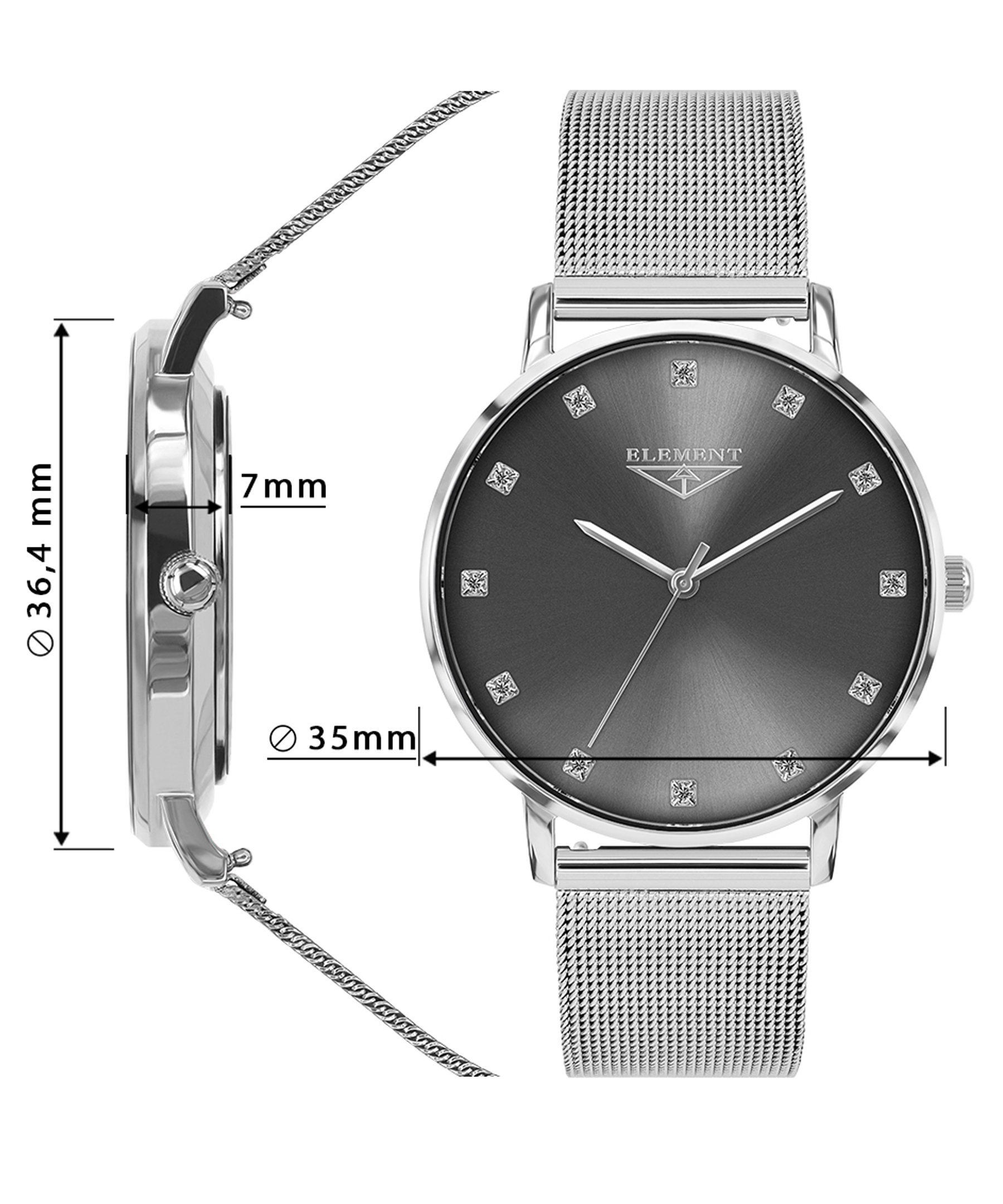 Оригінальний жіночий годинник 33 Element зі швейцарським кварцовим механізмом. Аналоговий сірий циферблат вишукано інкрустований кристалами, що виконують функцію міток часу. Сапфірове скло, стійке до механічних пошкоджень, має антивідблиск і особливу прозорість. Металевий браслет у техніці міланського плетіння елегантно виглядає на руці, надаючи аксесуару вишуканість та зовнішню привабливість. Класична модель, виконана в сучасних модних тенденціях, чудово поєднується з будь-яким стилем одягу і стане для Вас незамінним аксесуаром.