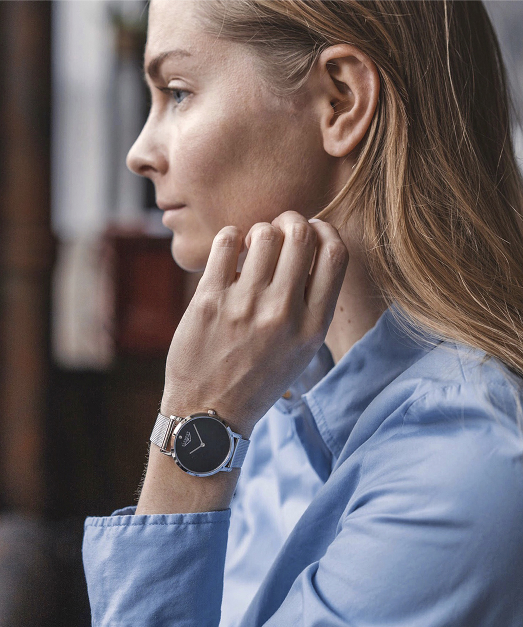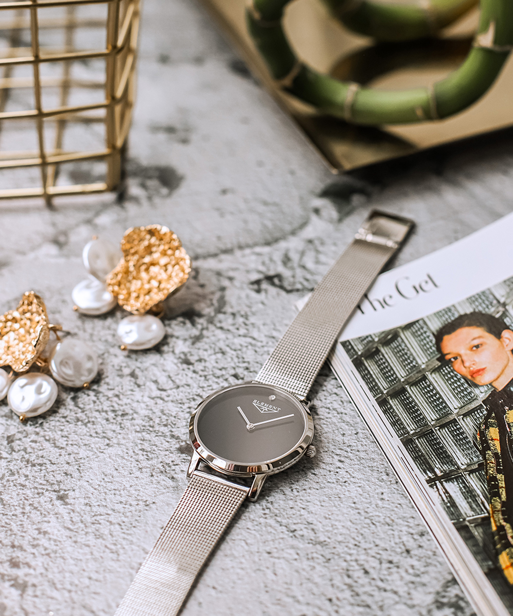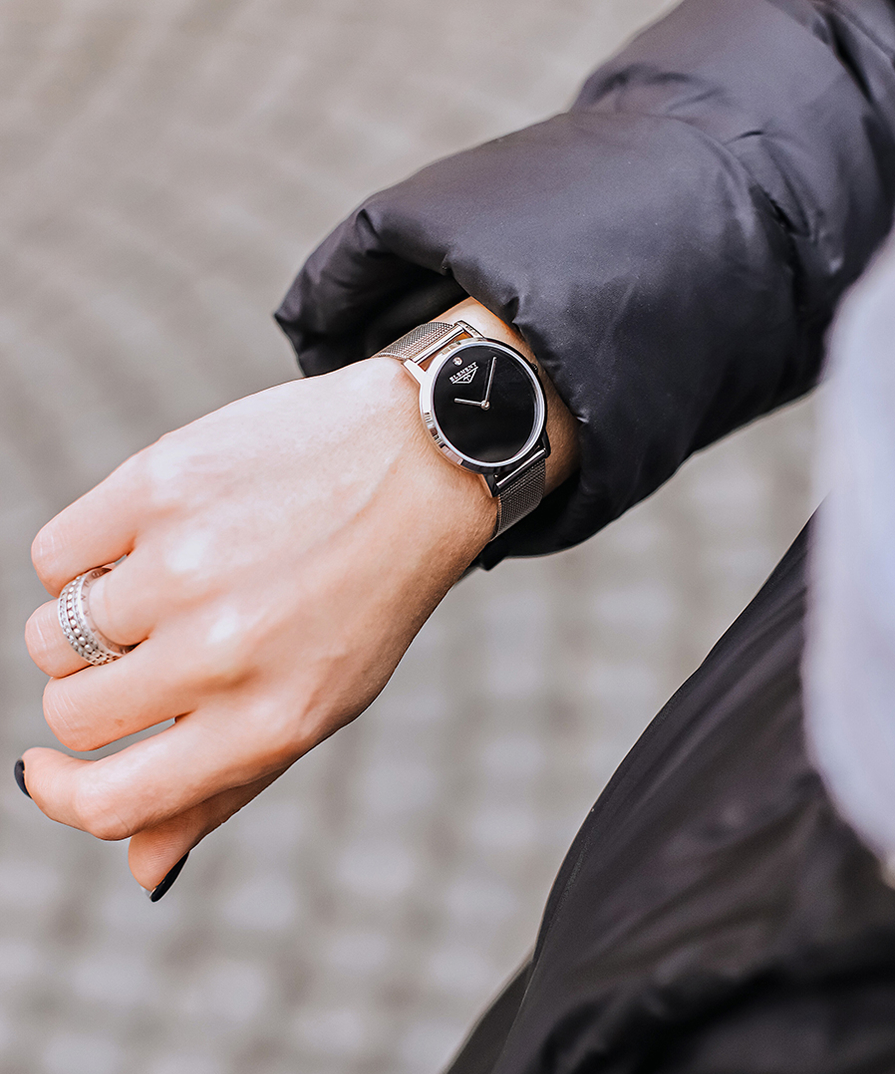 Корпус годинника виготовлений із високоякісної нержавіючої сталі, що підкреслює його стриману розкіш. Глибокий чорний циферблат позбавлений індексів, завдяки чому виглядає особливо мінімалістично та стильно. Єдиним акцентом є кристал Swarovski на 12-й годинній позначці — витончена деталь, що надає образу жіночності та шарму.