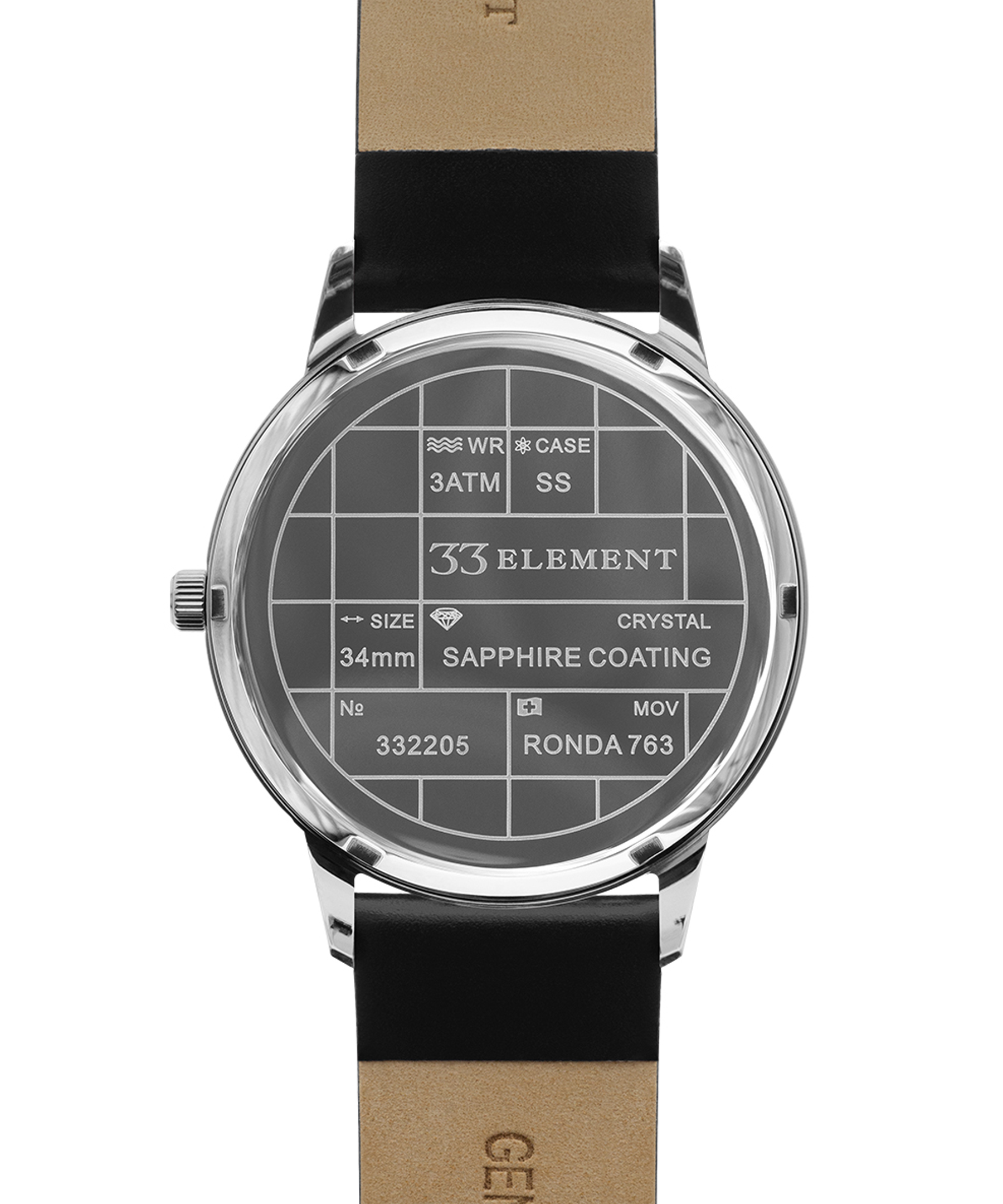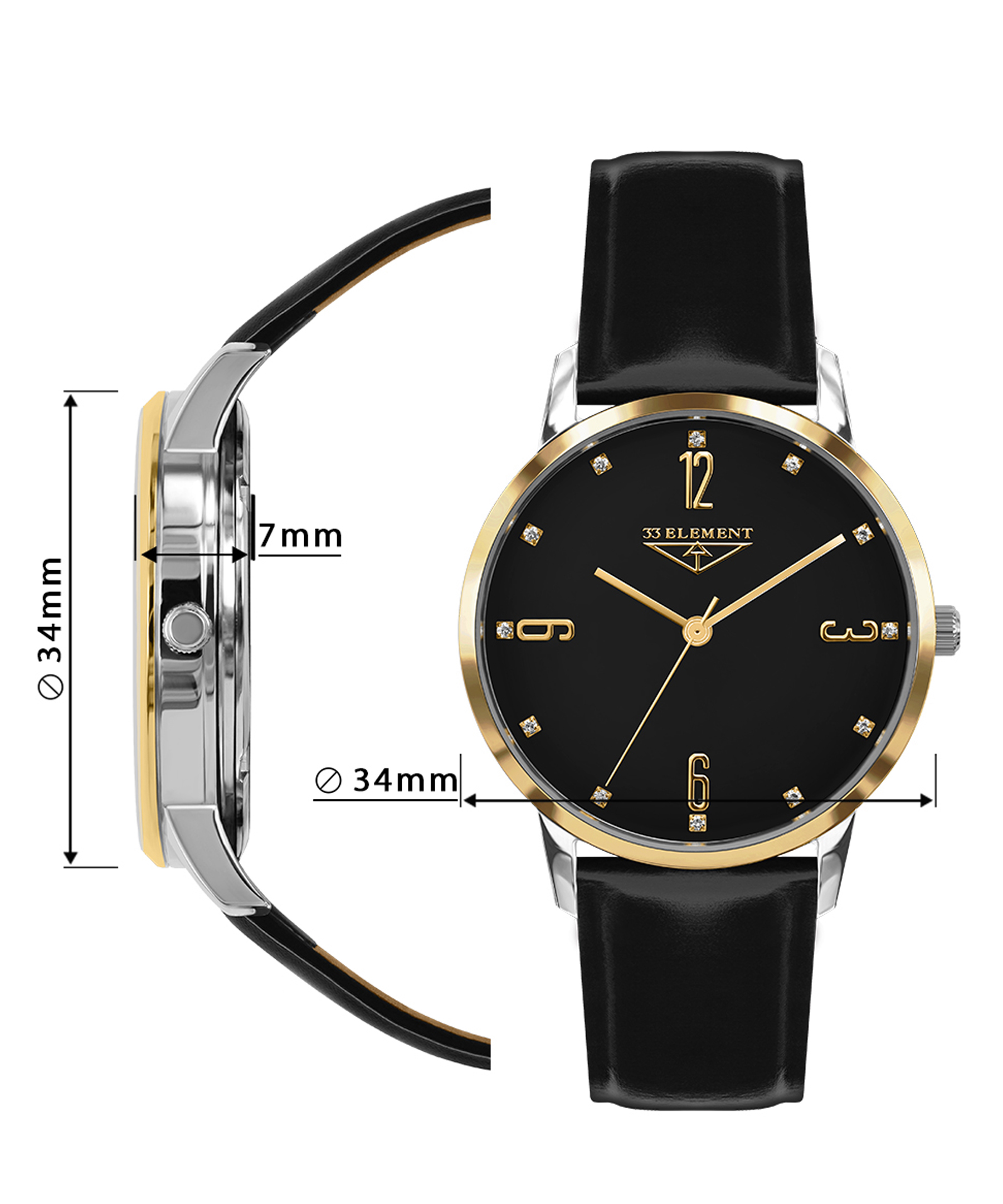 Жіночий годинник 33 Element 332205 від литовського бренду 33 Element. Основні риси бренду 33 Element - класичний, витриманий стиль, довговічність, та надійність швейцарського механізму Ronda. Якісний аксесуар за доступну ціну - вагомі переваги на користь цієї моделі. Сталевий корпус діаметром 34 мм. Чорний шкіряний ремінець із зручною застібкою - пряжкою. Чорний аналогий циферблат захищений сапфіровим склом, котре стійке до подряпин та механічних пошкоджень. Мерехтливі камінці виконують роль міток часу. Водозахист - 3 АТМ.