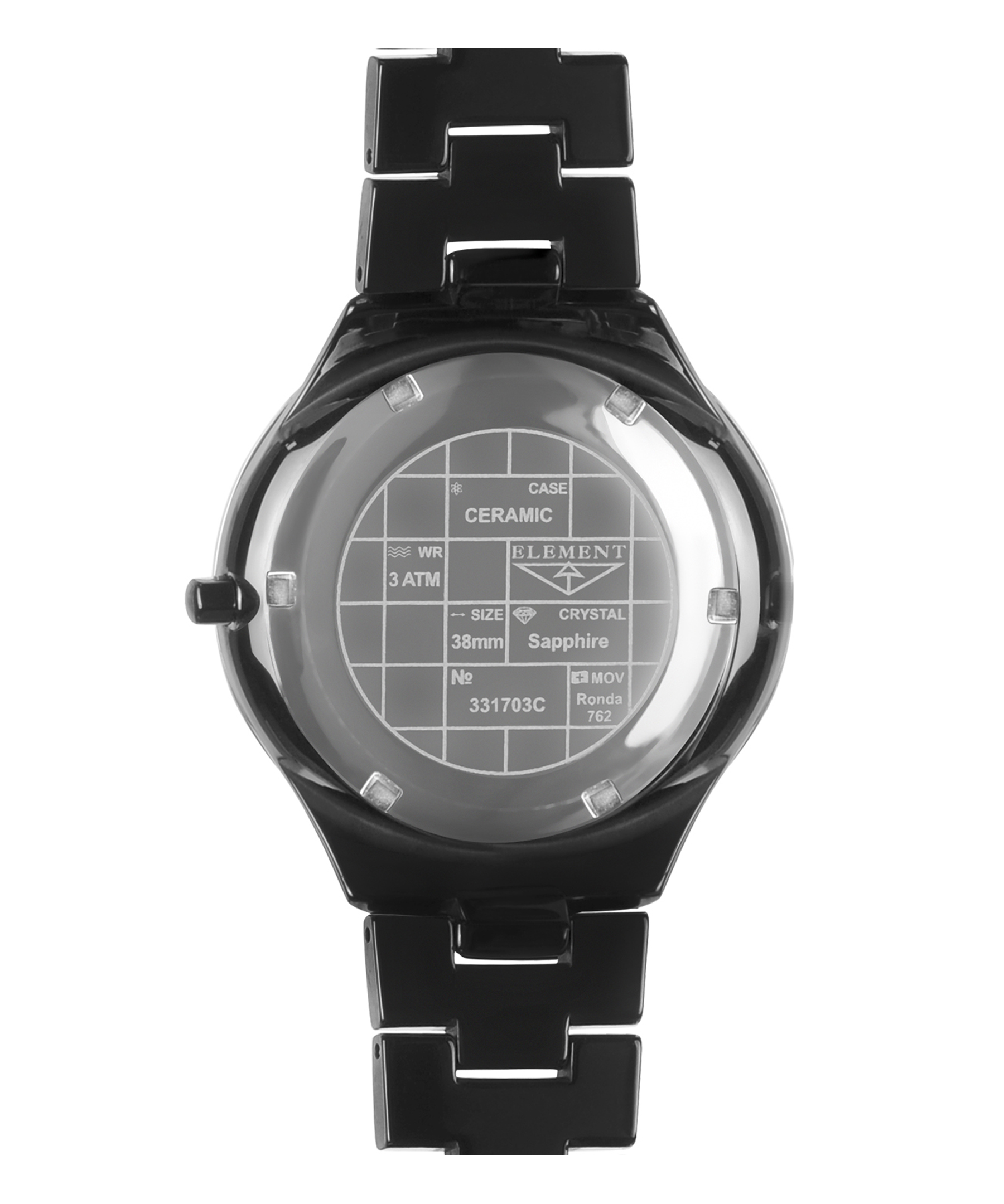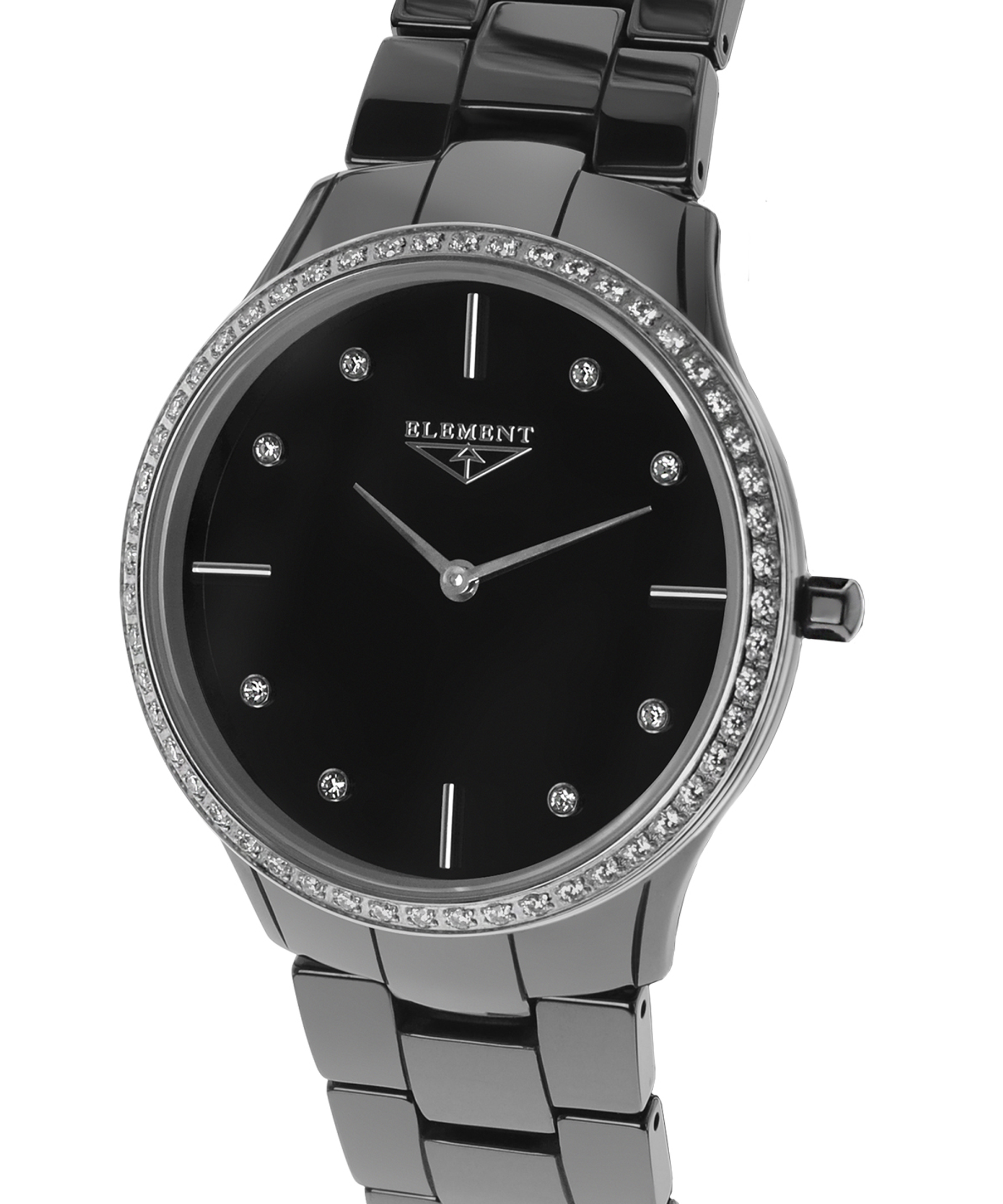 Жіночий наручний годинник 33 Element в класичному стилі. У годиннику швейцарський кварцовий механізм Ronda. Міцний керамічний корпус виконаний у чорному кольорі. Діаметр корпусу: 38 мм. Круглий аналоговий циферблат чорного кольору з індексами закритий стійким до подряпин та потертостей сапфіровим склом. Безель прикрашений камінням. Керамічний браслет виконаний у чорному кольорі. Водозахист: 3 АТМ.