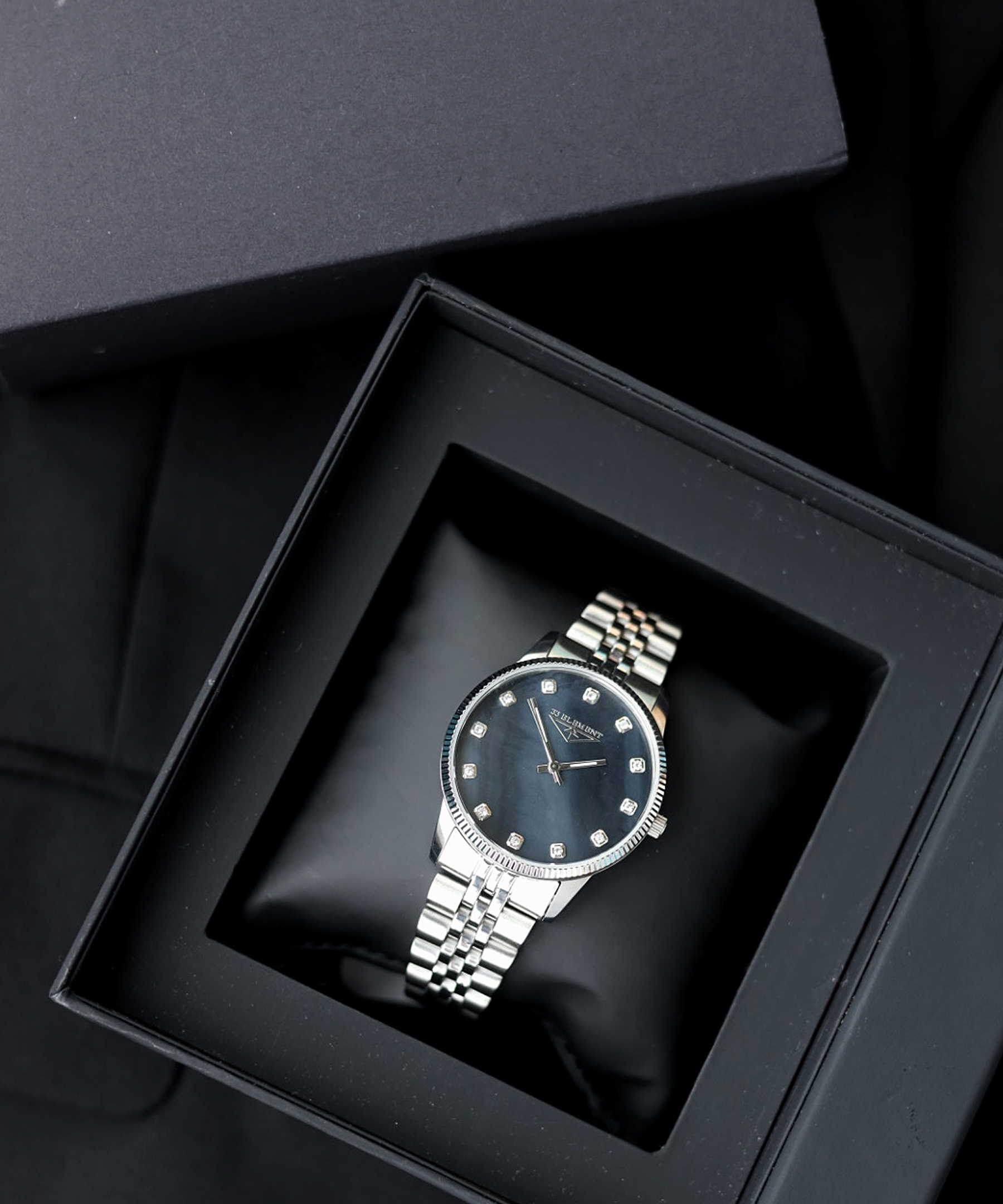 Особливу увагу привертає циферблат глибокого чорного перламутрового кольору, що переливається при світлі, додаючи глибини й шарму.