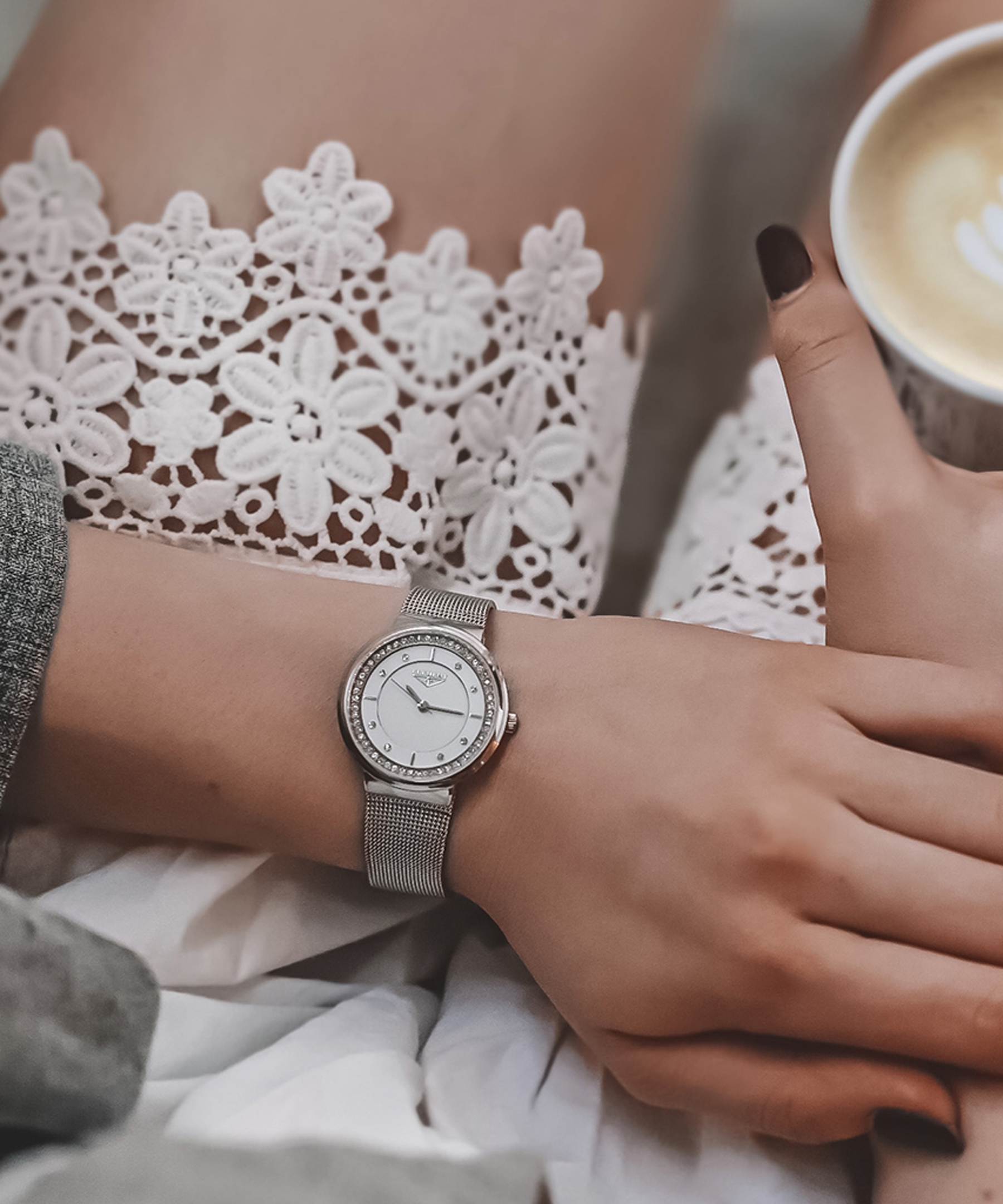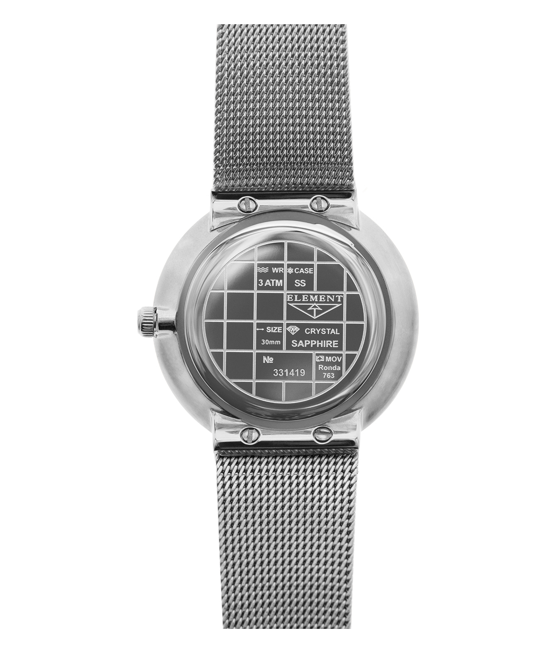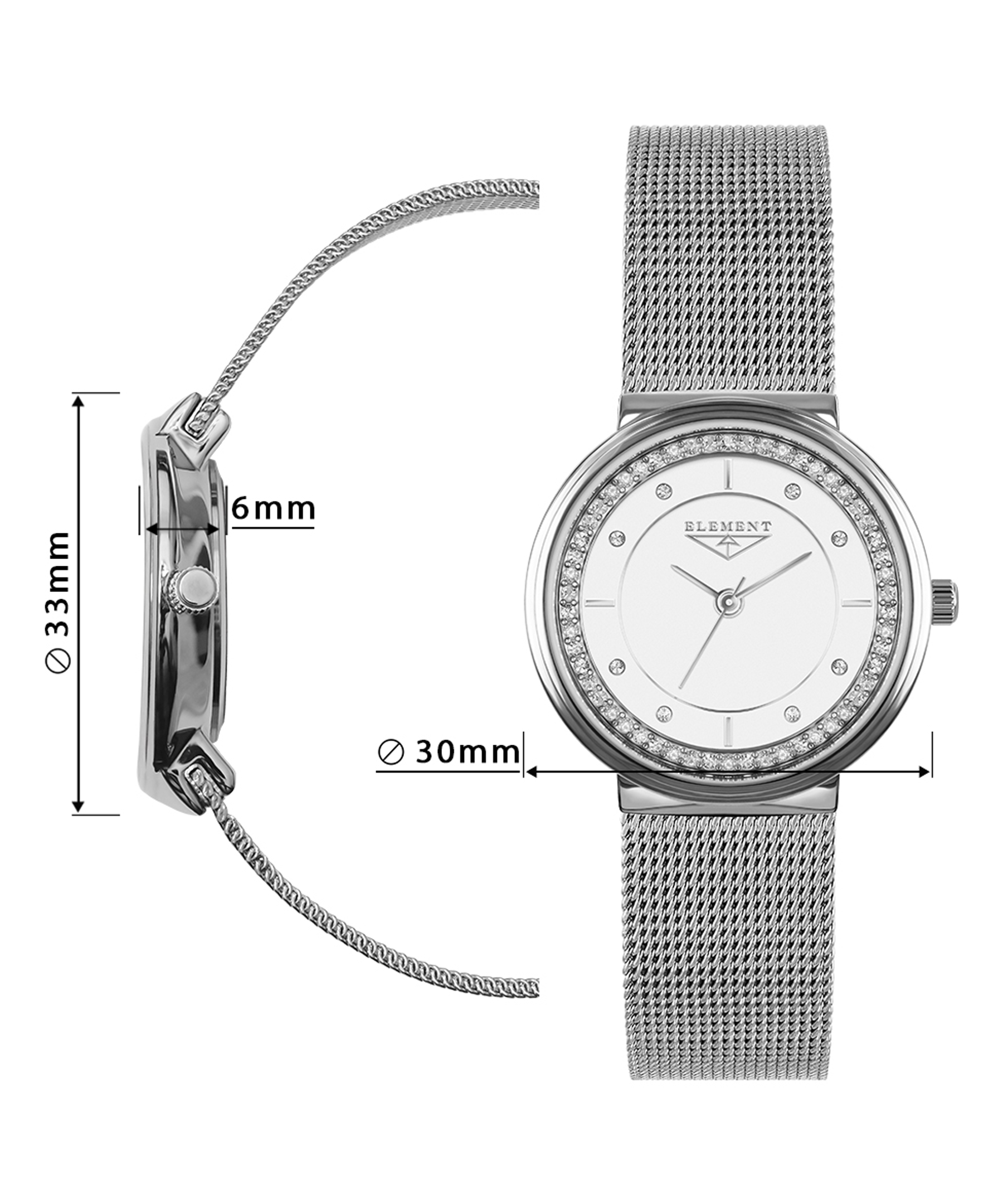 Жіночий класичний годинник 33 Element зі швейцарським кварцовим механізмом Ronda виготовлений з високоякісної нержавіючої сталі. Діаметр корпусу - 31 мм. За радіусом білого циферблату сяють кристали Сваровські, які створюють святковий настрій та відчуття цінності часу. Стійке до подряпин і потертостей сапфірове скло має антивідблисковий ефект і неймовірну прозорість. Сталевий браслет плетіння "mesh" у сріблястому кольорі служить продовженням аксесуара, який цілком може бути самостійною ювелірною прикрасою.