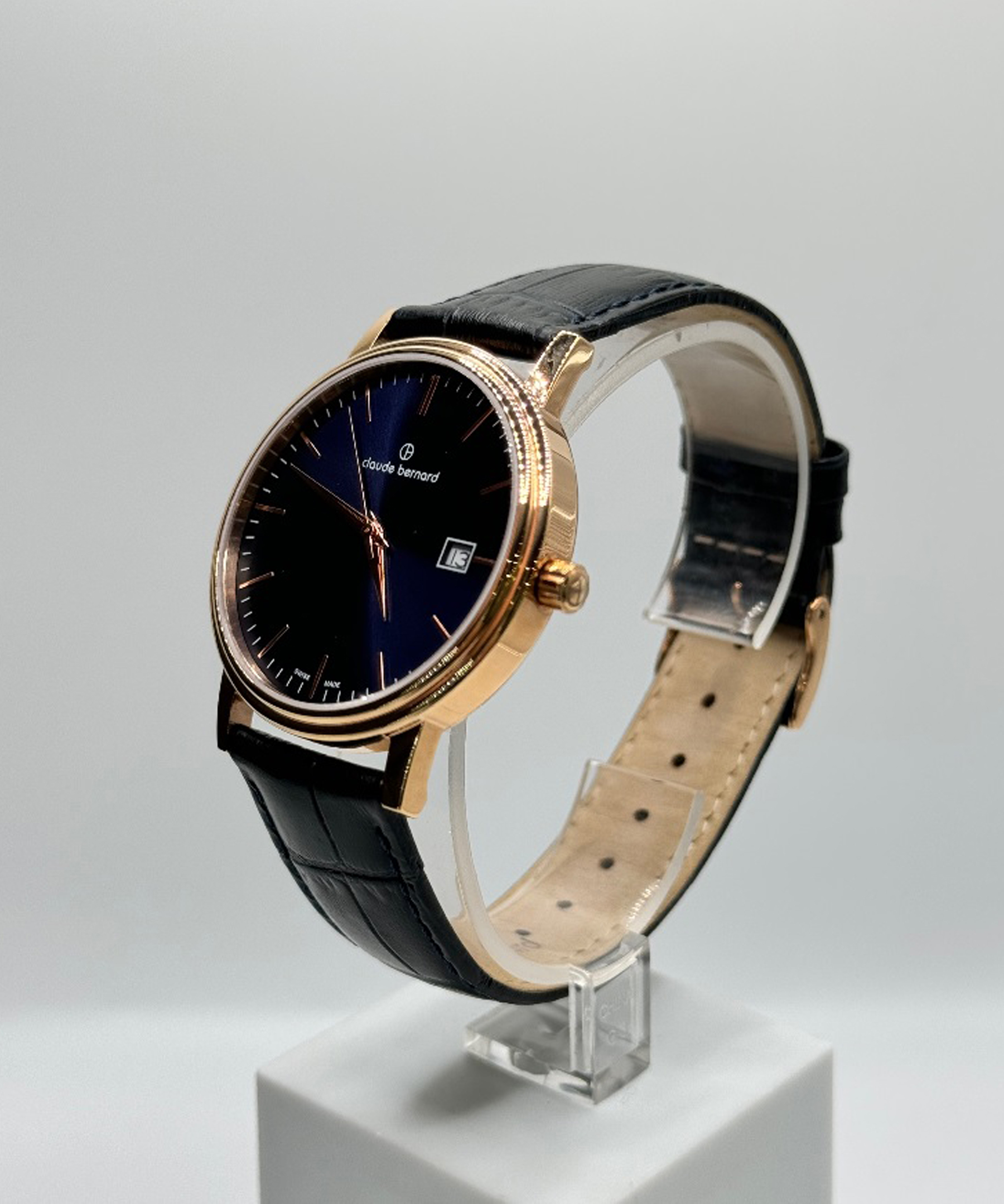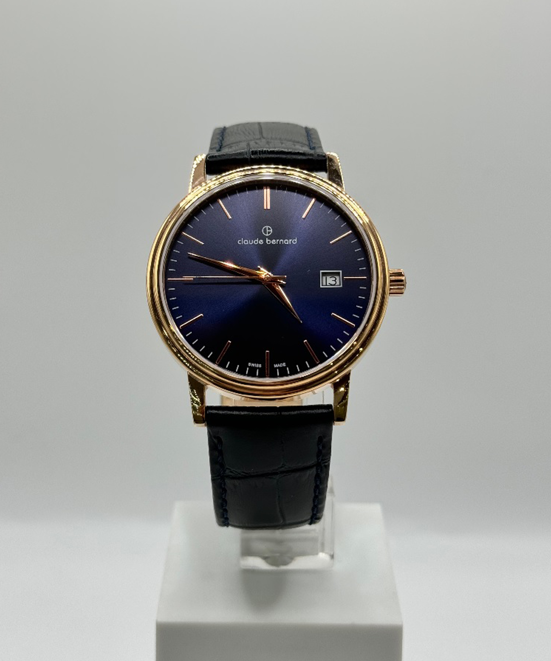 Синій циферблат оздоблений тонкими рожево-золотистими стрілками та часовими мітками, надаючи годиннику витончений вигляд. Віконце дати розташоване на позначці 3 години, забезпечуючи додаткову зручність.