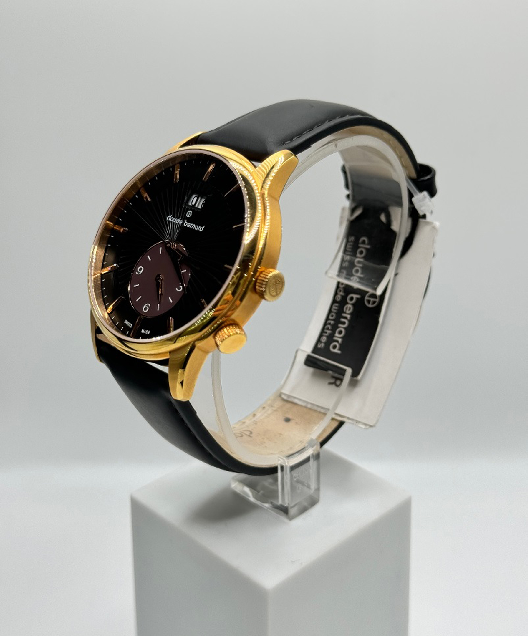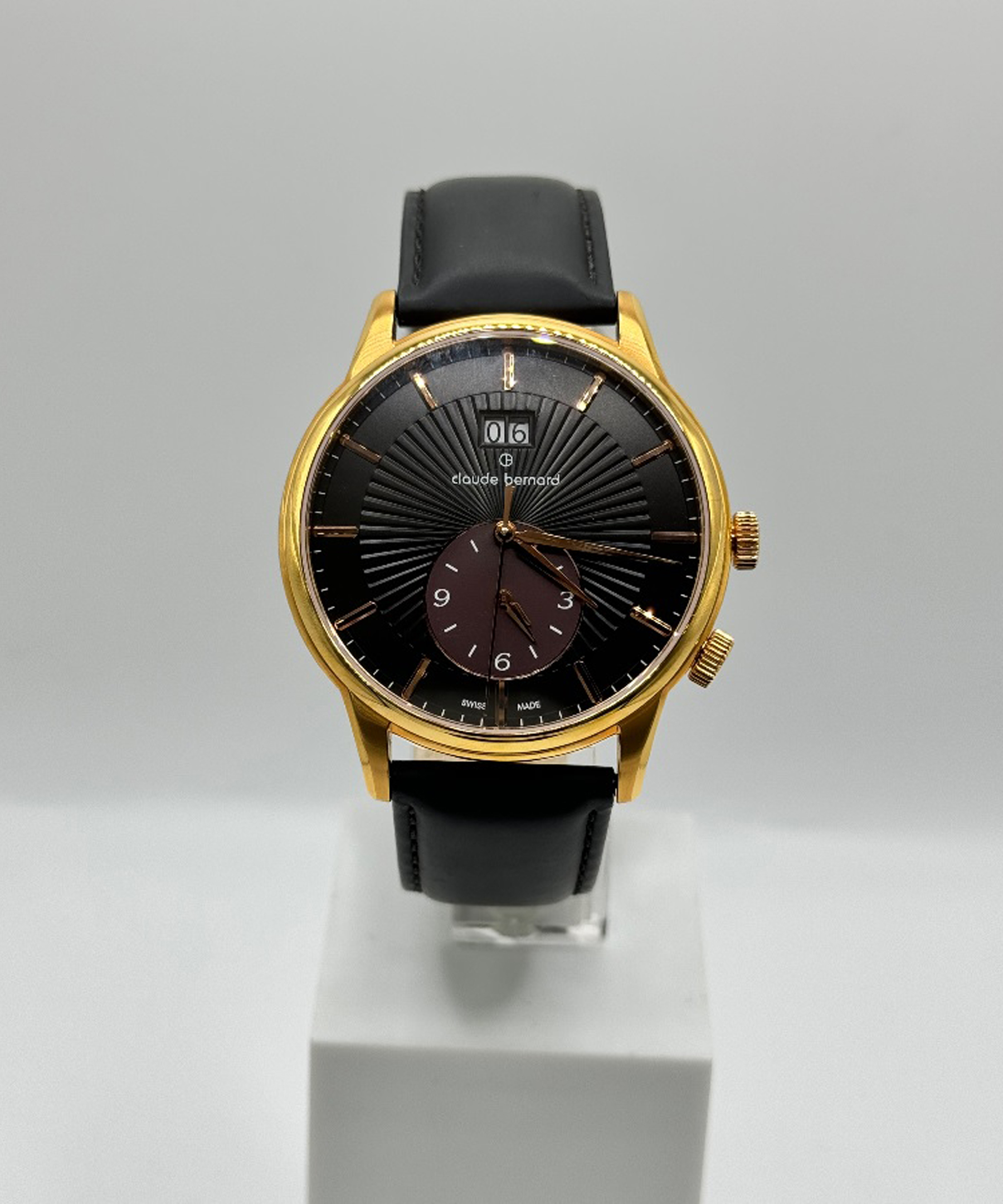Класичний чоловічий годинник Claude Bernard з надійним швейцарським механізмом виконаний з високоякісної нержавіючої сталі з високими антикорозійними властивостями та повним покриттям PVD Gold. На циферблаті чорного кольору є індикатор дати та часу другого часового поясу. Мітки та стрілки годинника золотистого кольору “оживляють” темне поле циферблату. Сапфірове скло, стійке до виникнення подряпин, чорний шкіряний ремінець, водозахист 5 атм та елегантний дизайн створюють образ дорогого, елітного аксесуара.
