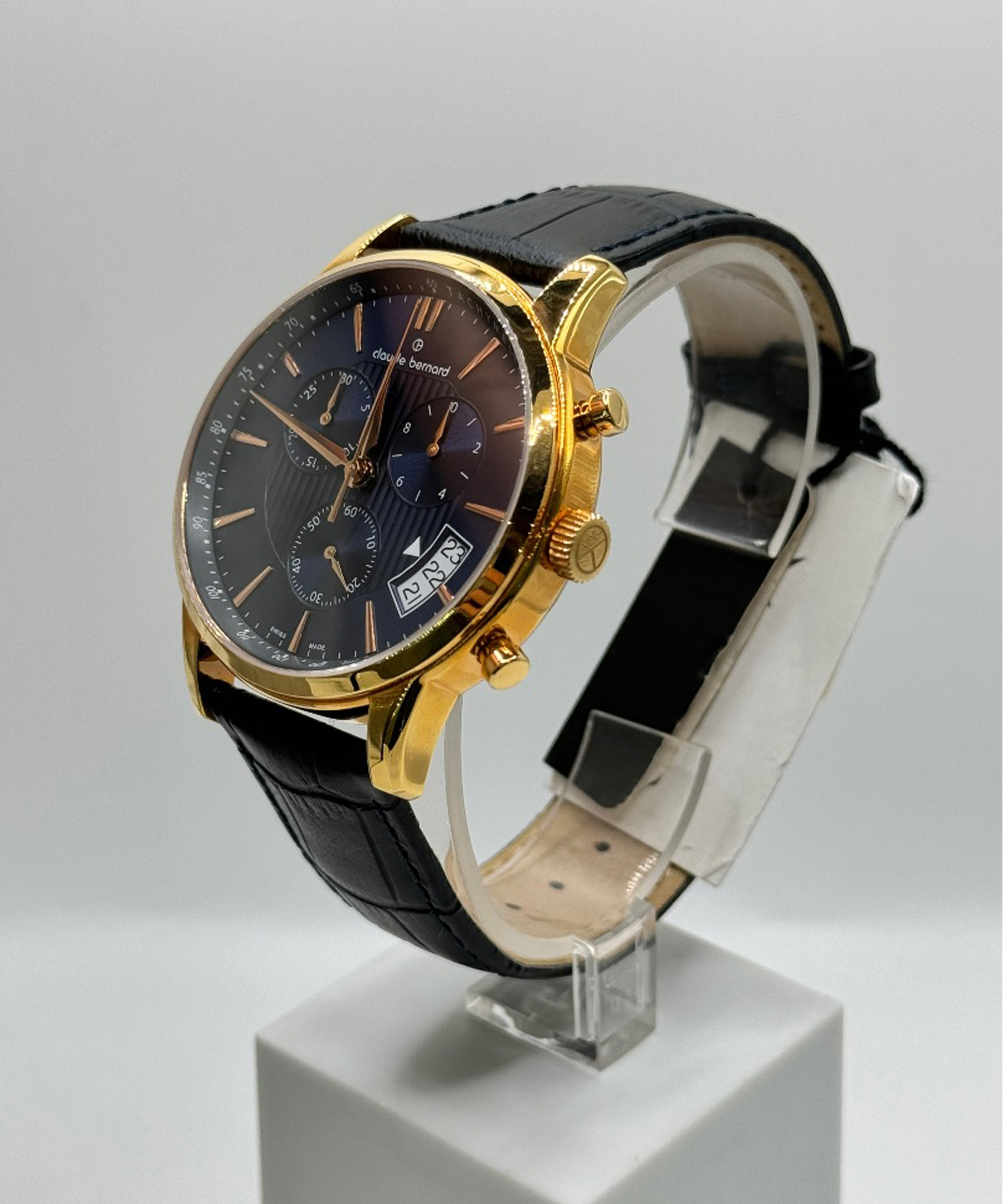 Екстравагантний чоловічий годинник -хронограф знаменитого швейцарського бренду Claude Bernard з календарем і тахіметром оснащені високоточним кварцовим механізмом ETA G10.211. Корпус виготовлений з якісної нержавіючої сталі з високими антикорозійними властивостями, з PVD покриттям золотого кольору і синім циферблатом. Стійке до подряпин сапфірове скло має антивідблиск і надійно захищає механізм від пошкоджень. Ремінець, що комфортно облягає зап'ястя, виготовлений з натуральної шкіри кольору. Яскрава, стильна модель, що поєднує в собі якість та естетику, завжди радуватиме Вас та Ваше оточення.