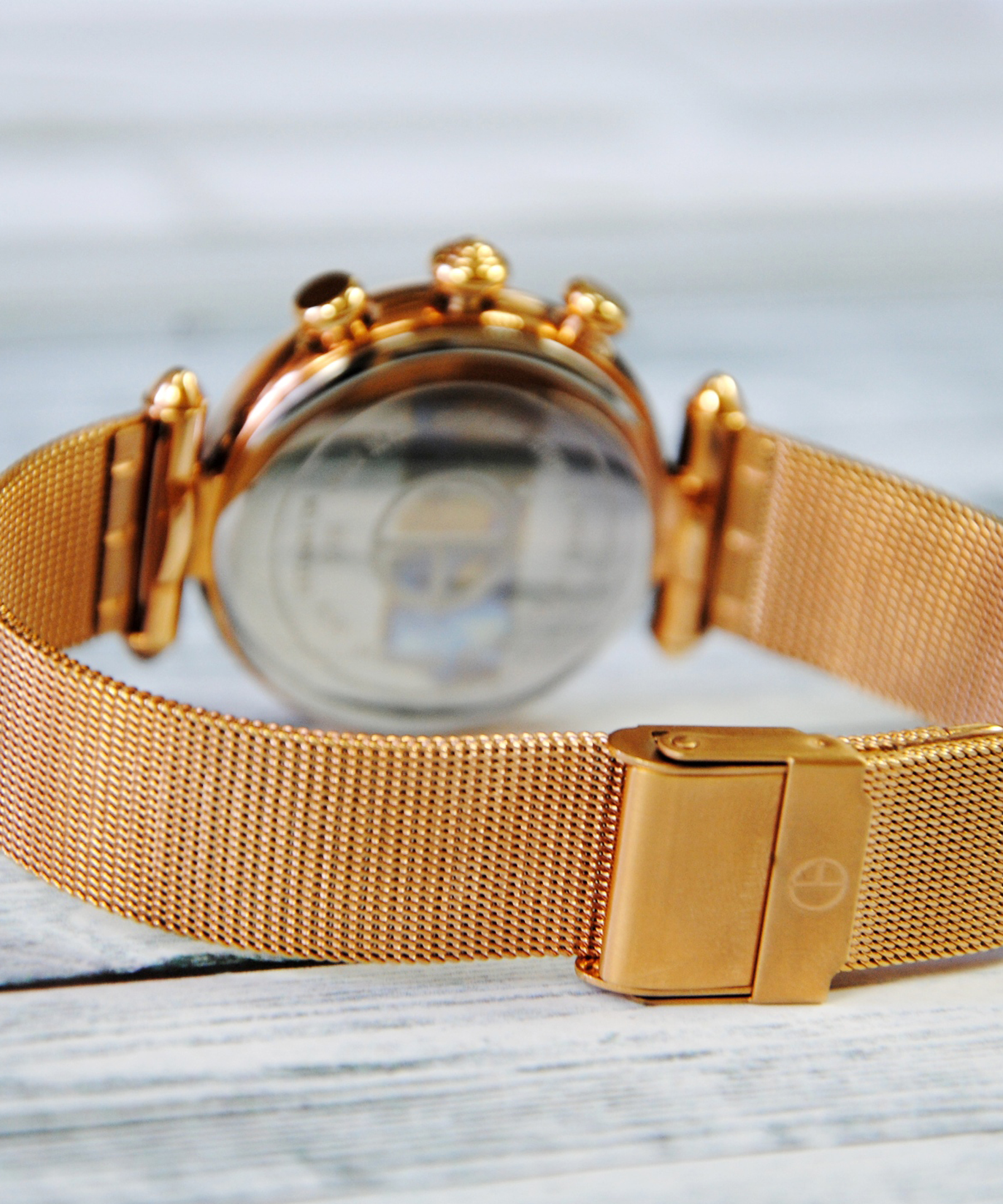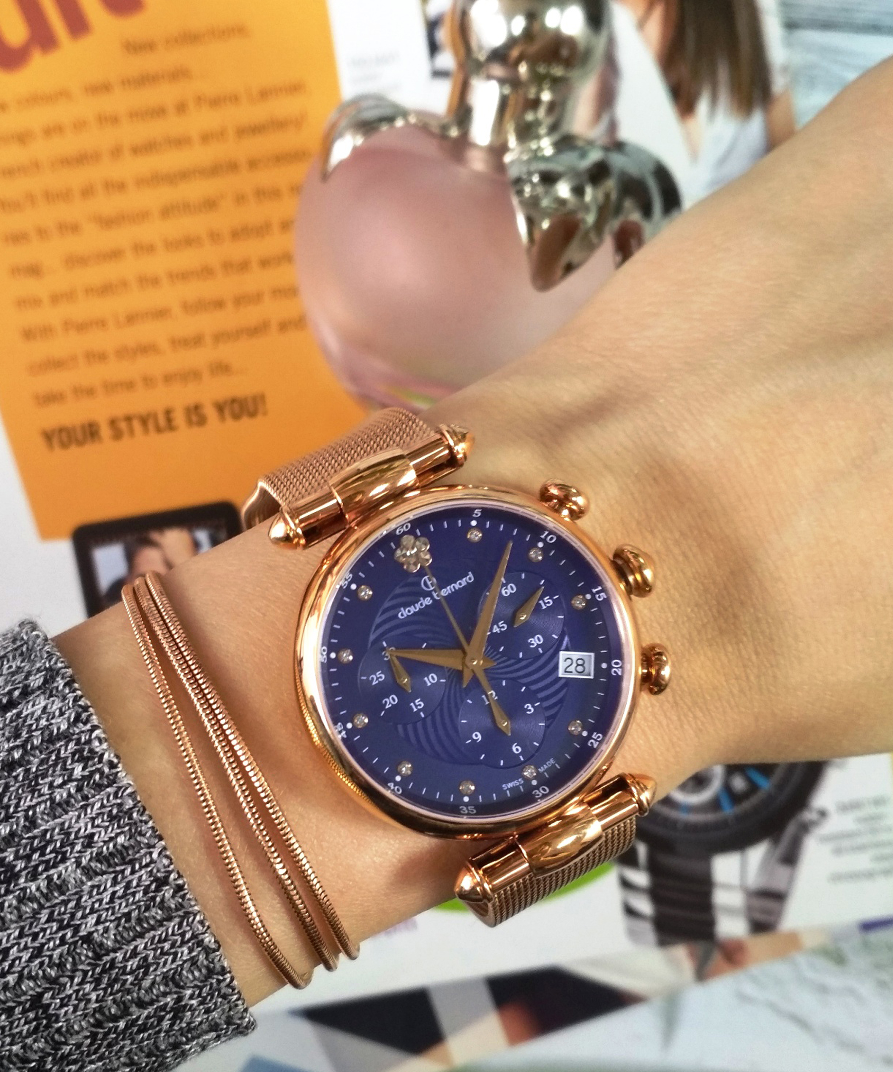 Яскравий стильний жіночий наручний годинник - хронограф популярної швейцарської компанії Claude Bernard з надійним кварцовим механізмом Ronda 5040. Виготовлений з нержавіючої сталі 316L з покриттям PVD rose gold. Циферблат синього кольору декорований ледве вловимим малюнком, що викликає асоціацію з рухом. Кристали у вигляді індексів часу дуже експресивно пожвавлюють поле, на якому лічильники хронографа та календар відраховують миті нашого часу. Сапфірове скло має особливу міцність і захищає механізм від пошкоджень. Золотистий браслет у техніці плетіння "mesh" завершує розкішний образ аксесуара.