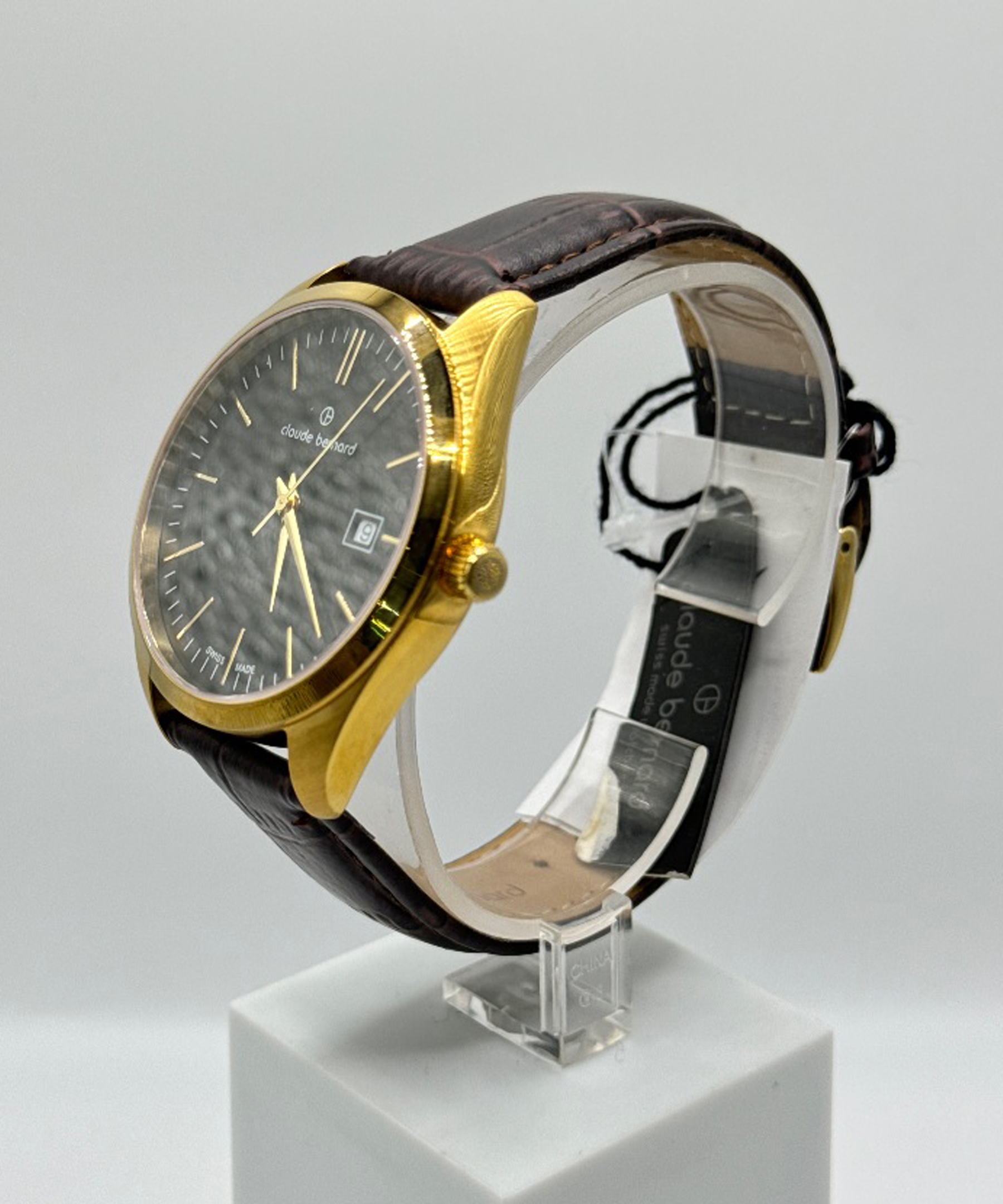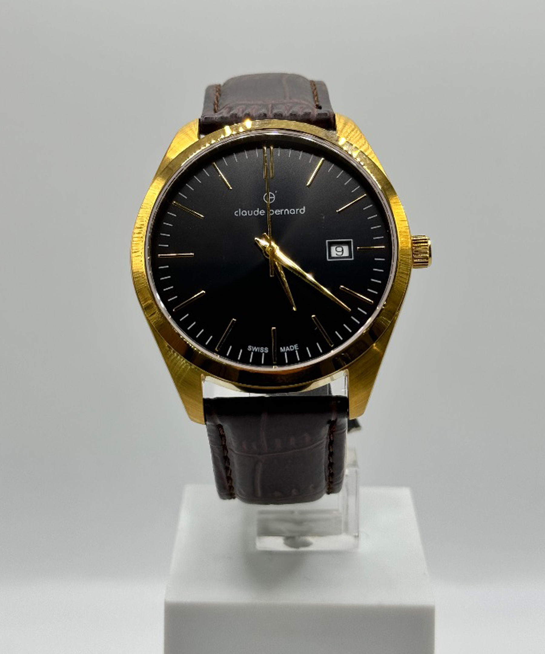 Класичний чоловічий наручний годинник Claude Bernard з колекції Classic з високоточним швейцарським кварцовим механізмом. Корпус виготовлений із нержавіючої сталі з IP покриттям Gold. На чорному аналоговому циферблаті елегантні золотисті мітки часу у вигляді тонких штрихів, які поєднуються зі стрілками та створюють строгий, лаконічний образ. Індикатор дати на рівні “3 години”, сапфірове скло, що має високу міцність і прозорість, лаконічність та елегантна стриманість - пріоритетні характеристики даної моделі. Завершує образ ремінець із натуральної шкіри коричневого кольору. Запропонований аксесуар рекомендується успішним чоловікам із тонким смаком.