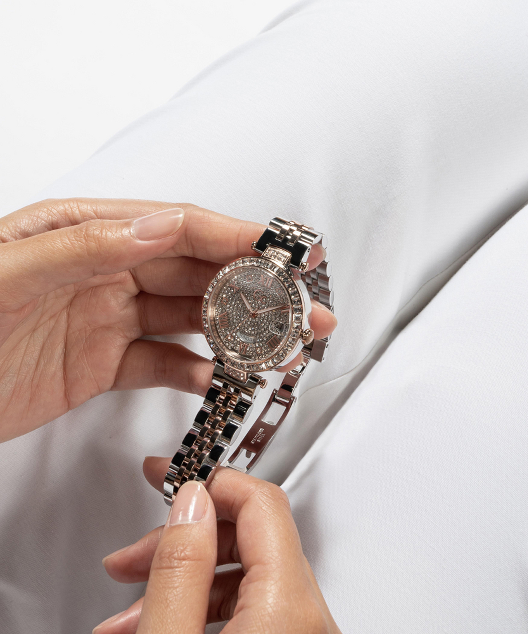 Сталевий корпус і браслет з комбінованим покриттям створюють враження розкоші та витонченості. Діаметр корпусу 34 мм ідеально підходить для жіночої руки, а аналоговий циферблат та безель, декоровані кристалами, надають годиннику особливого шарму і блиску. Стрілки з люмінесцентним покриттям забезпечують чітке відображення часу навіть в темряві. Віконця для дати та дня тижня додають функціональності, а мінеральне скло з сапфіровим покриттям надійно захищає механізм годинника від пошкоджень. Водозахист 10 АТМ гарантує безпечне носіння годинника під час плавання або при контакті з водою.