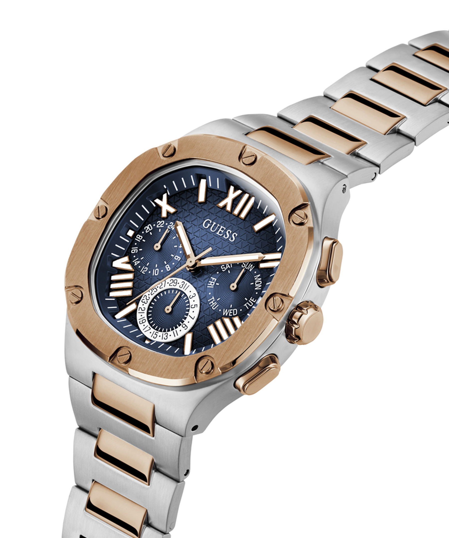 Оригінальний чоловічий наручний годинник GUESS. Колекція – GUESS DRESS. Годинник оснащений надійним кварцовим механізмом Miyota. Сталеві корпус та браслет з комбінованим покриттям Silver/Gold Tone. Діаметр корпусу – 42 мм, товщина – 10,1 мм. Безель оздоблений декоративними болтами. Аналоговий градієнт циферблат синього кольору. Стрілки та тимчасові мітки з люмінесцентним покриттям. Додатково – відображення дня тижня та дата. Водозахист 5 АТМ.