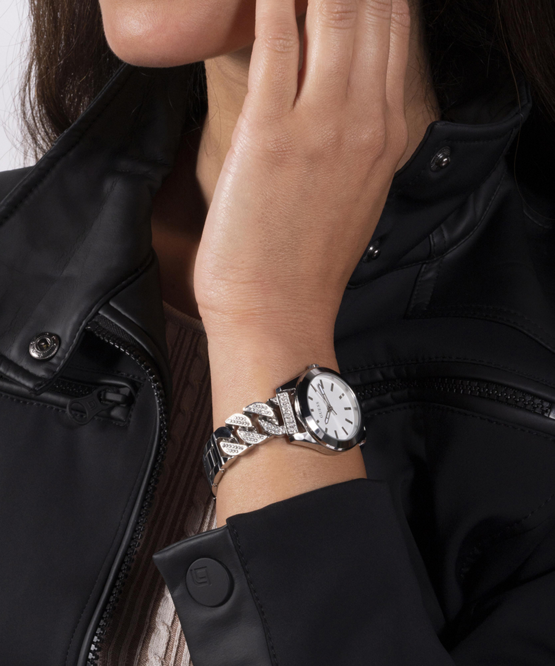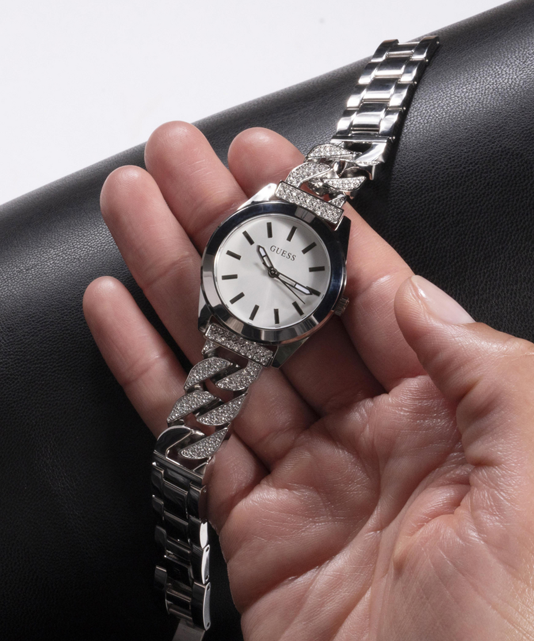 Оригінальний жіночий наручний годинник GUESS GW0546L1. Годинник із колекції LADIES TREND. Встановлено надійний кварцовий механізм Miyota. Сталеві корпус та браслет. Діаметр корпусу – 32 мм, товщина – 7,95 мм. Браслет декорований кристалами, що переливаються. Застібка – складана кліпса. На білому циферблаті – логотип бренду, тимчасові мітки та стрілки з люмінесцентним покриттям. Водозахист – 3 АТМ.