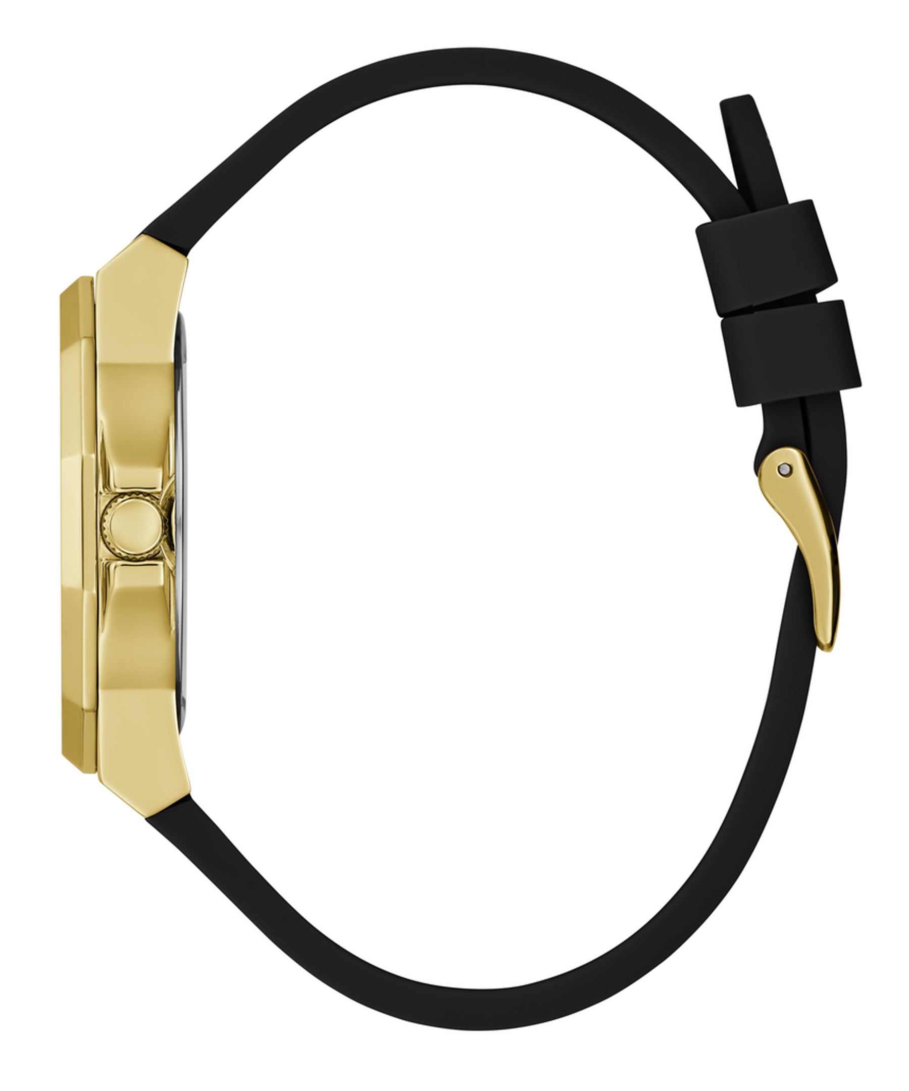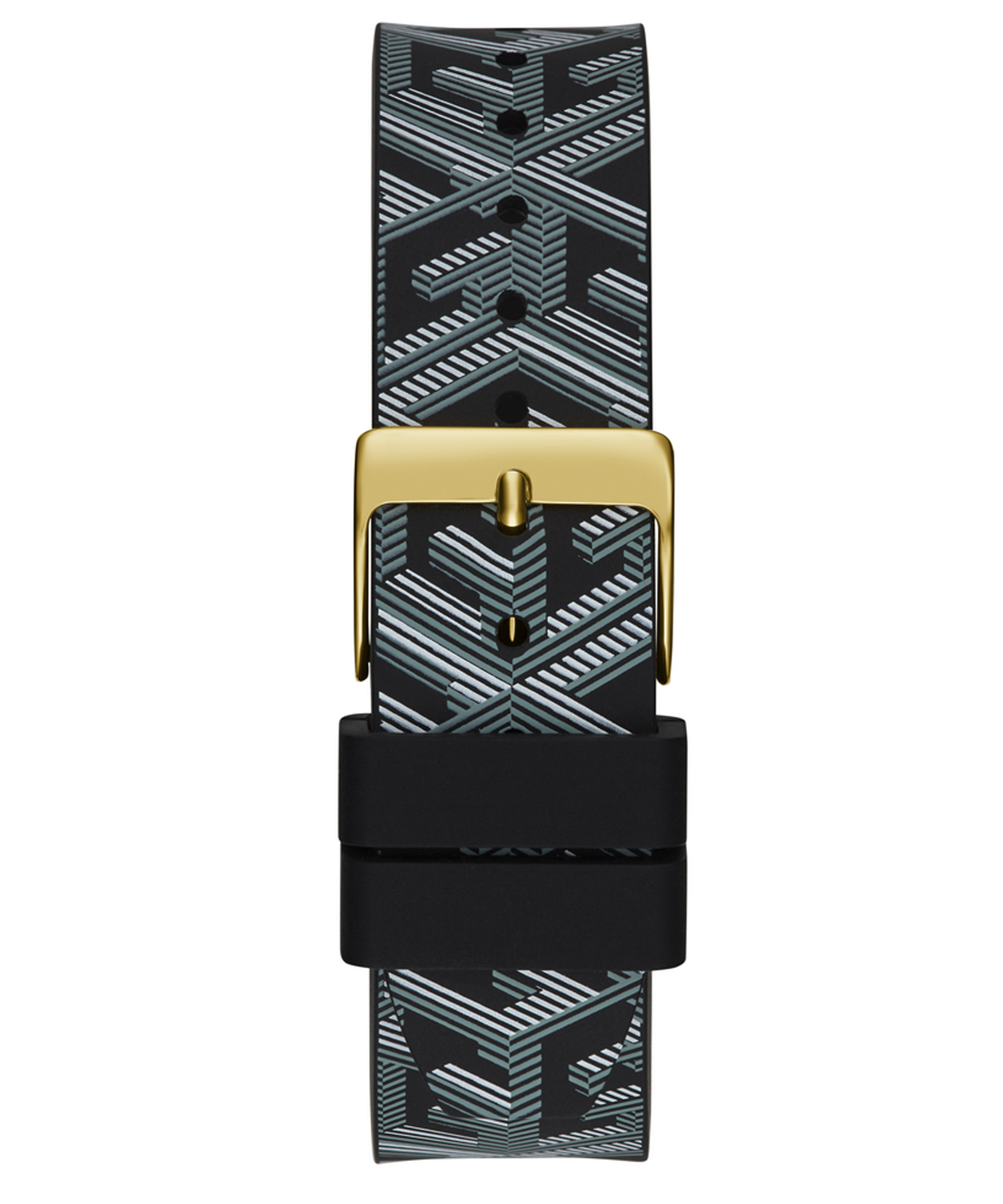 Елегантний жіночий наручний годинник американського бренду GUESS. У годиннику встановлено надійний кварцовий механізм Miyota. Сталевий корпус із покриттям Gold Tone. Діаметр корпусу – 38 мм товщина – 9,8 мм. Безель прикрашений кристалами. На чорному аналоговому циферблаті - золотисті мітки часу та стрілки з люмінесцентним покриттям. Чорний силіконовий ремінець із нанесеним орнаментом. Застібка – пряжка. Водозахист – 3 АТМ.