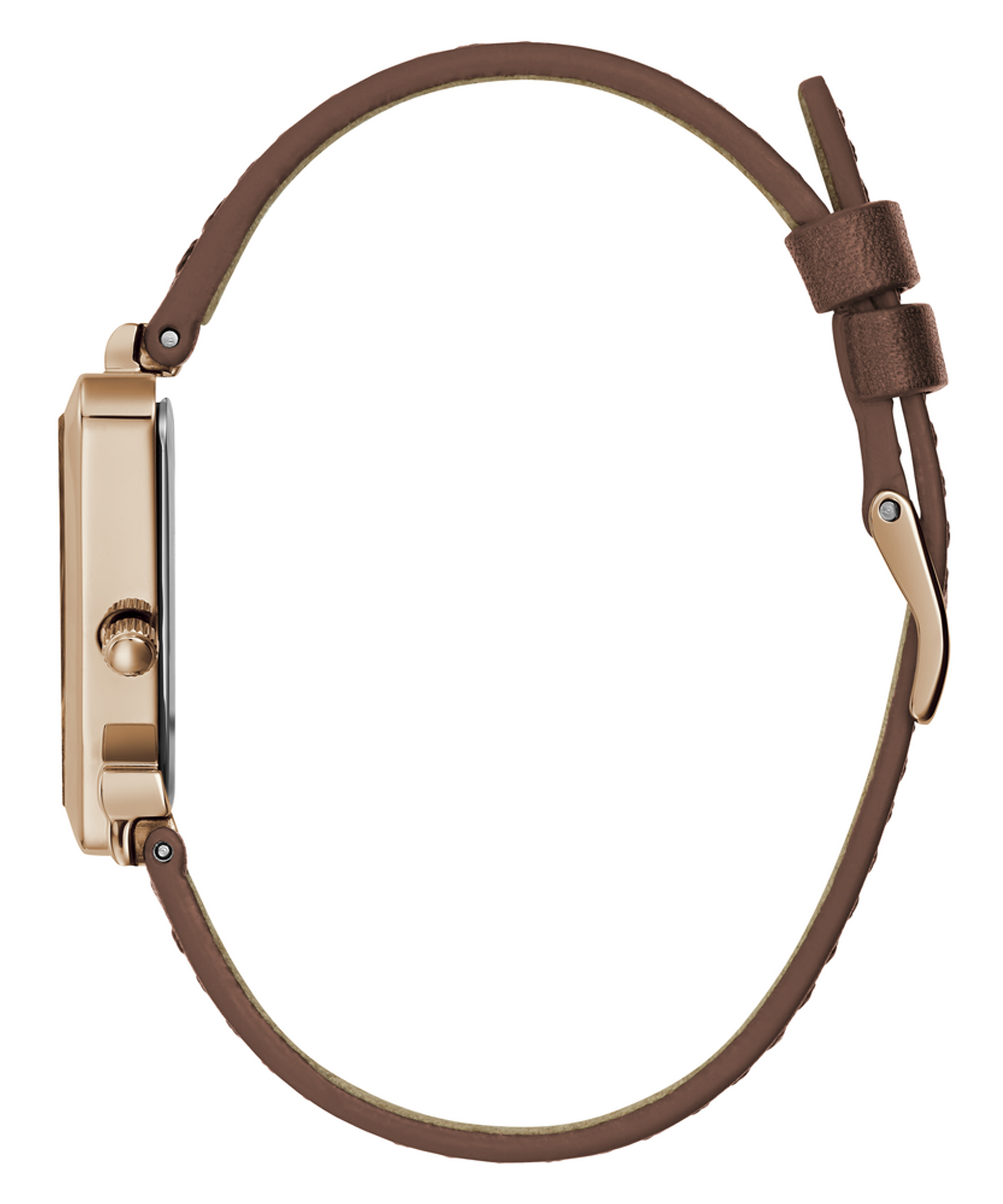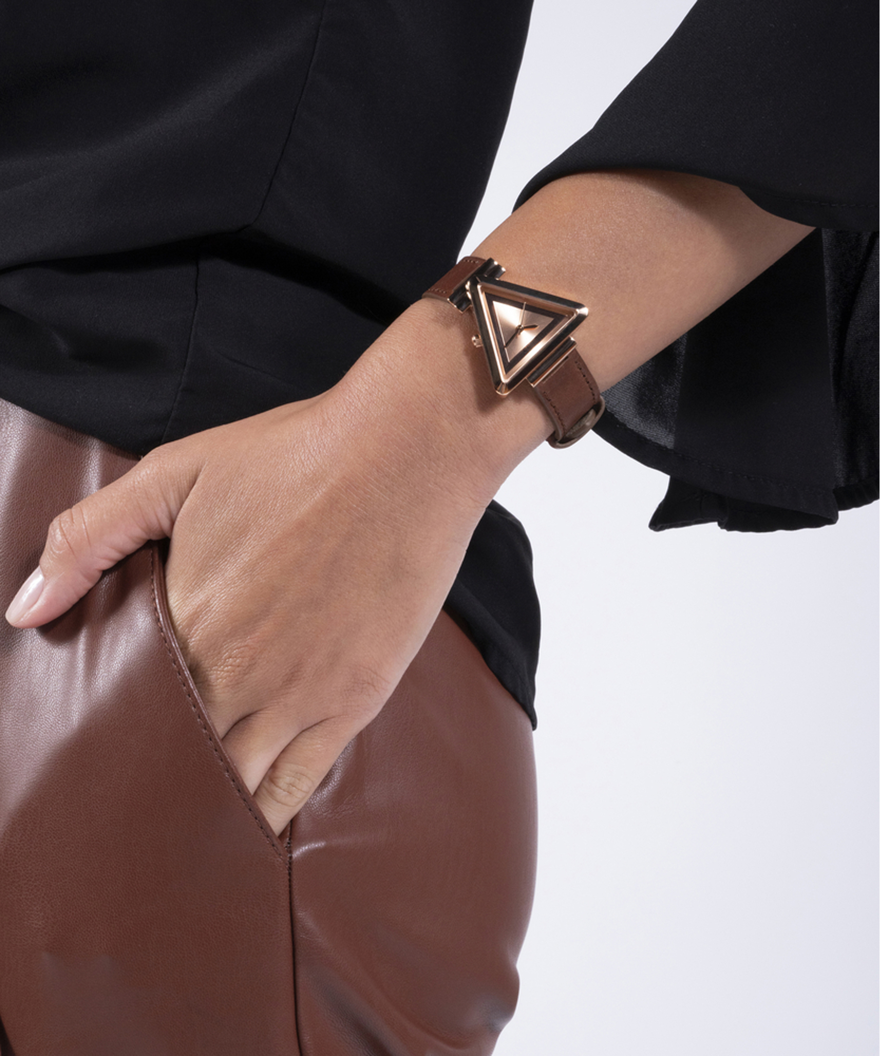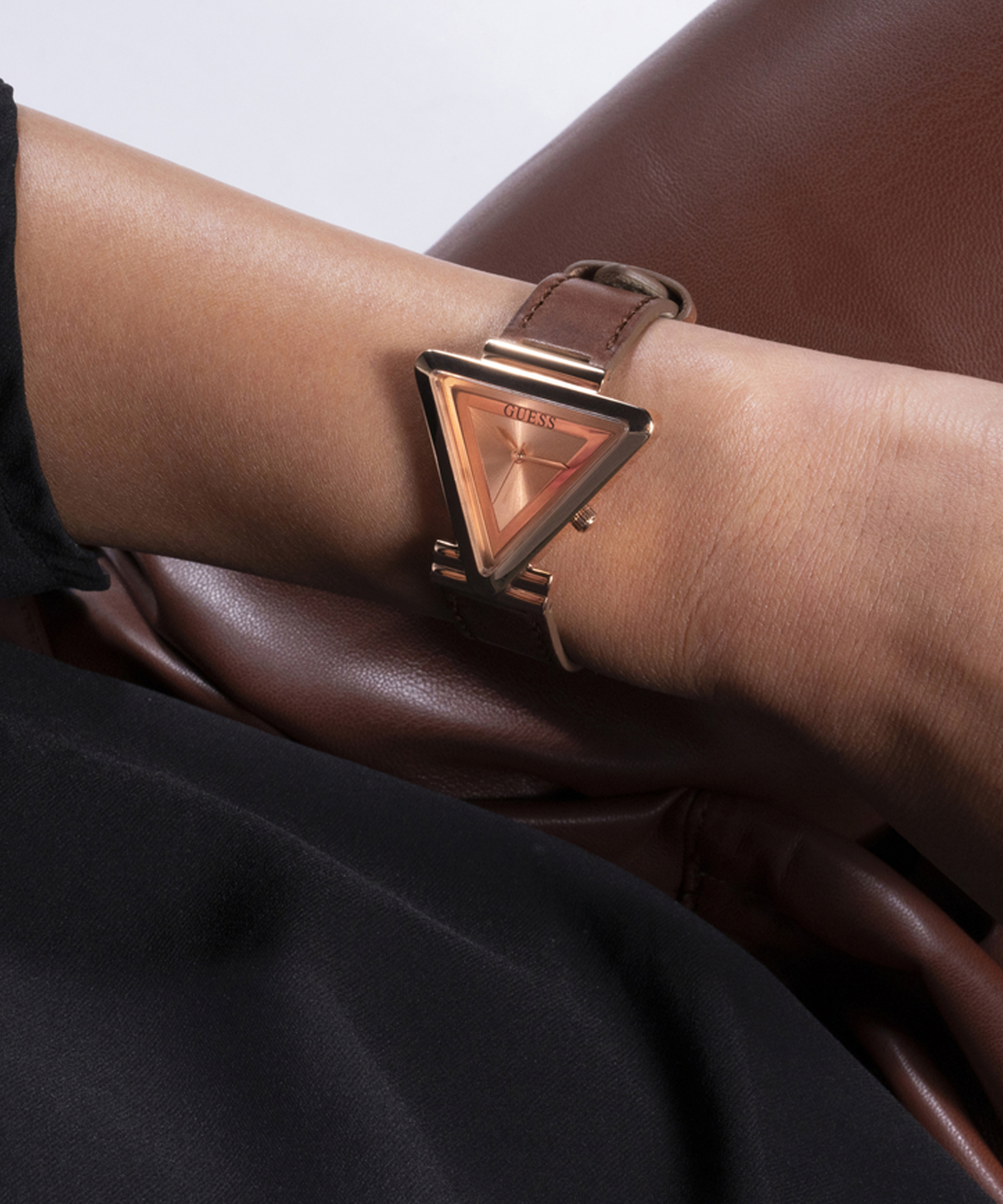 Лаконічний жіночий наручний годинник GUESS GW0548L2. Колекція LADIES TREND. У годиннику встановлено кварцовий механізм Miyota. Сталевий трикутної форми корпус із покриттям Rose Gold Tone. Розмір корпусу – 34 х 34 мм, товщина – 7,1 мм. Коричневий шкіряний ремінець із класичною застібкою пряжкою. Ширина кріплення – 16 мм. На золотистому циферблаті відсутні часові позначки. Водозахист – 1 АТМ.